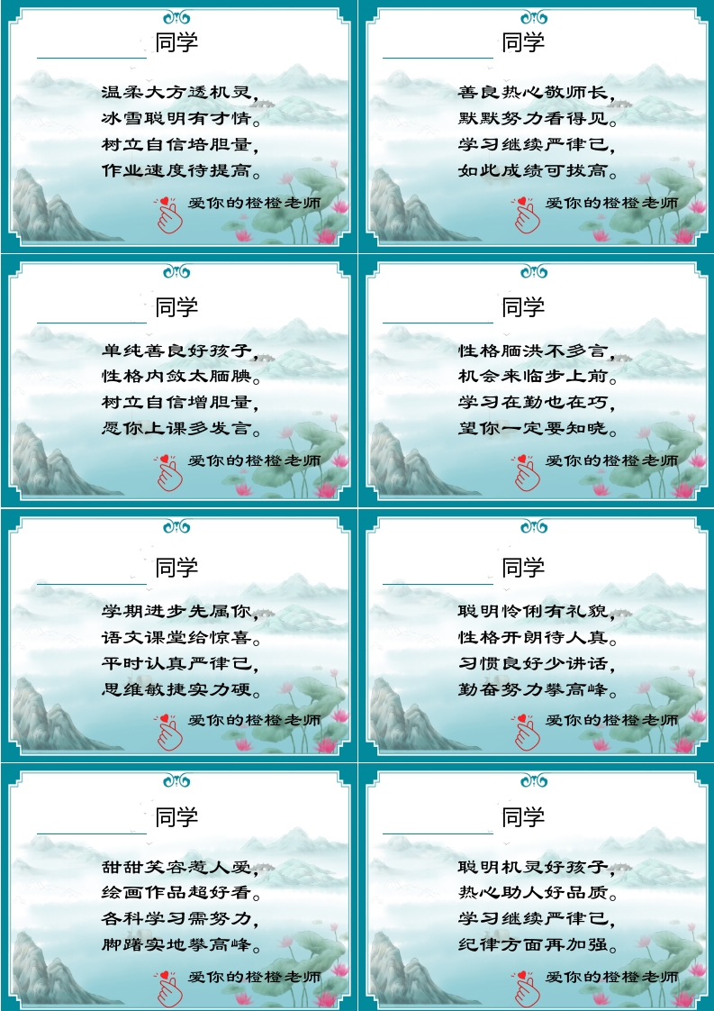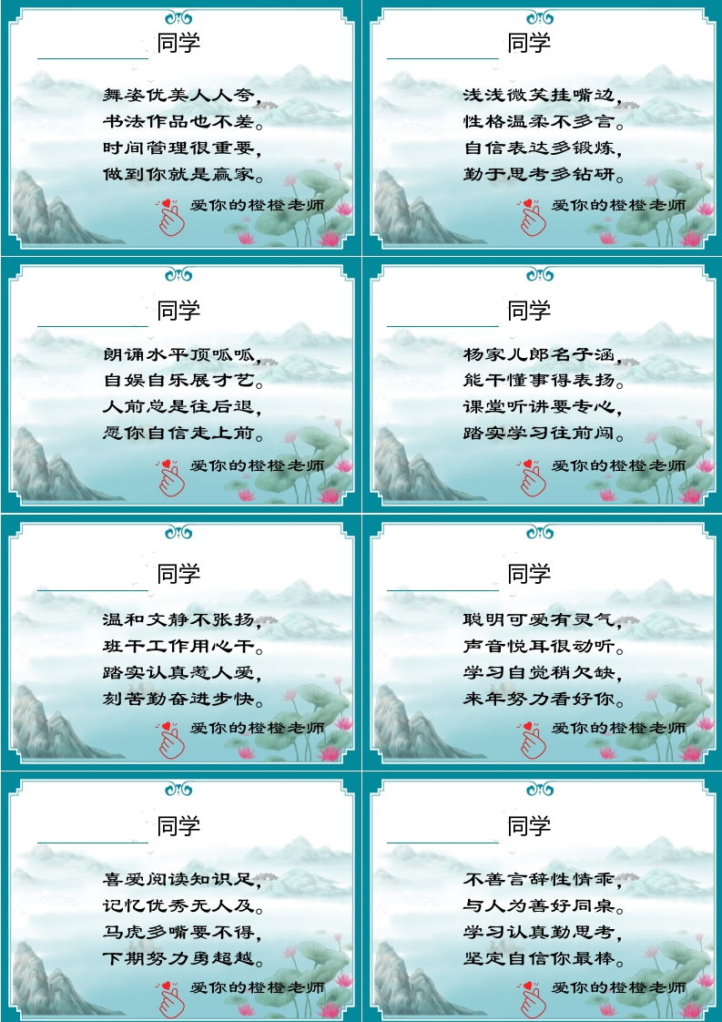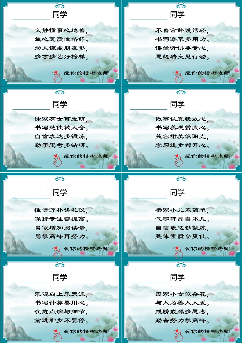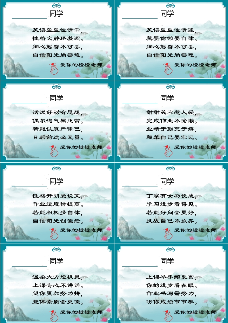 0.60.6同学同学王家小女爱看书」俞家有个可爱娃,为啥成绩还下滑。书写还需再努力。说话分神难静心,加强自控踏实干,加强自控与自律。下期努力勇超越。爱你的橙橙老师爱你的橙橙老师0YO0.6同学同学嘴似黄鹂唱不停,同学榜样顶呱呱,心儿飘到窗户外。课堂专注老师夸。老师讲课不知情,注意点滴与细节,你若专心成绩升。质的飞跃会更佳。n爱你的橙橙老师爱你的橙橙老师0.60:6同学同学笑语盈盈性情乖,能说会道巧嘴巴,上课听讲不说话。舞姿优美人人夸。细心勤奋不可丢,如若学习再勤奋,自信阳光尚需追。学习才艺顶呱呱。爱你的橙橙老师爱你的橙橙老师⊙rG06同学同学乐观向上乐天派,亭亭玉立小姑娘,书写计算要用心。可是话多没听讲。注意点滴与细节,时光飞逝不等人,前进脚步不要停。莫到后悔暗伤心。爱你的橙橙老师爱你的橙橙老师●