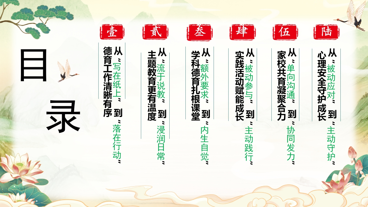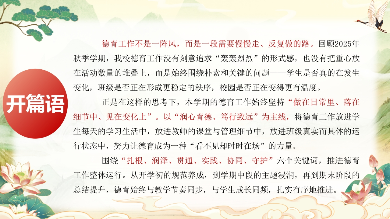 2025年秋季学期学校德育工作总结:以德育之笔,绘成长底色tangqi8812天前发布关注私信5.34MB24页04015 第1页 / 共24页 第2页 / 共24页 第3页 / 共24页 第4页 / 共24页 第5页 / 共24页 试读已结束,还剩19页,您可下载完整版后进行离线阅读 2025年秋季学期学校德育工作总结:以德育之笔,绘成长底色此内容为付费资源,请付费后查看¥9.9¥19.9VIP会员免费立即购买您当前未登录!建议登陆后购买,可保存购买订单付费资源© 版权声明本站是一个信息分享及获取的平台,不确保部分用户上传资料的来源及知识产权归属,资料由老师投稿,公开渠道整理,网友上传,如果侵犯到您的权益,请联系客服删除THE ENDPPT课件 文本预览 以德育之笔,绘成长底色学校德育作总结2025年秋季学期汇报人:XX老师时间:2025.12 查看更多 收起部分 喜欢就支持一下吧点赞15 分享QQ空间微博QQ好友海报分享复制链接收藏