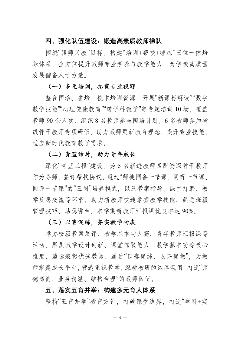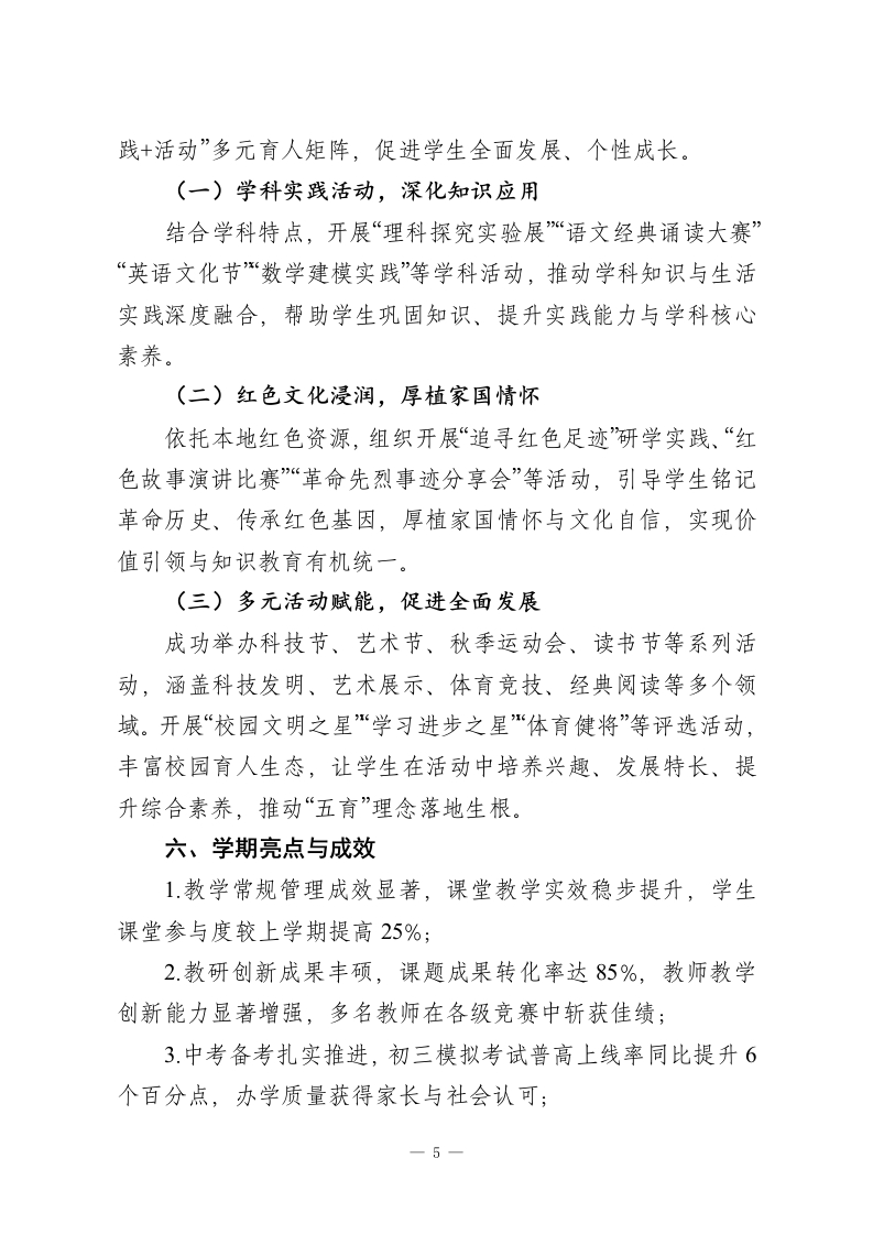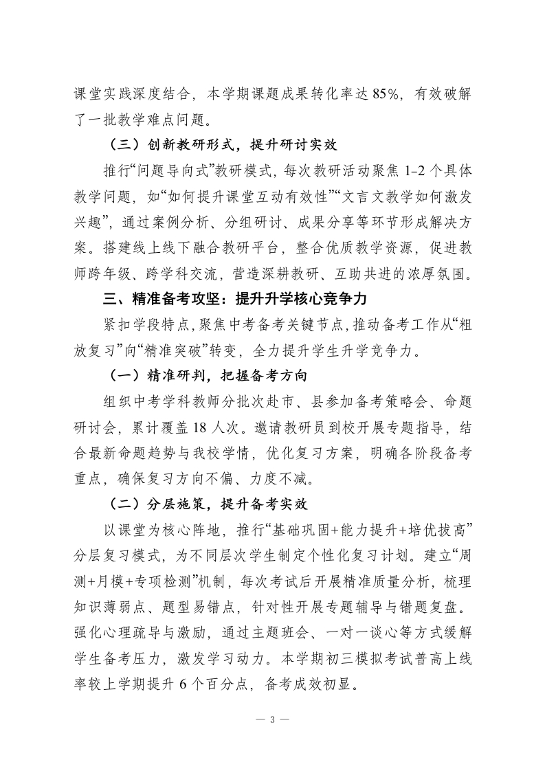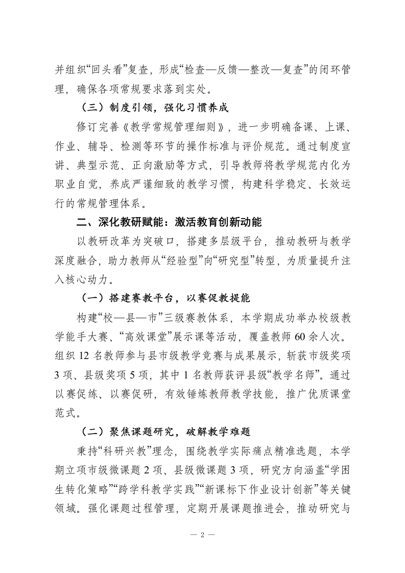 2025-2026秋季学期教学工作总结本学期,我校紧扣立德树人根本任务,锚定“马年奋进、提质增效”核心基调,以教学质量为生命线,以教研创新为驱动力,以教师成长为支撑点,以学生全面发展为落脚点,扎实推进教学精细化管理,丰富教育内涵建设,全校上下凝心聚力、真抓实干,各项教学工作取得阶段性成效。现将本学期教学工作详细总结如下:一、锚定常规提质:构建规范化管理体系教学常规是质量根基,本学期我校坚持“严标准、实举措、常督查”原则,推动常规管理从“形式达标”向“实效落地”转变,筑牢教学质量“压舱石”。(一)精准备课,聚焦课堂实效严格对标新课标,围绕“学科核心素养落地”目标,明确备课需覆盖“教材深研、学情研判、教法创新、分层设计”四大维度。强化集体备课效能,以教研组为单位,每周固定开展专题研讨,由骨干教师牵头梳理重难点、整合教学资源、设计适配不同层次学生的教学方案,确保备课成果精准对接课堂需求,从源头提升教学针对性。(二)闭环督查,推动要求落地建立“多维督查+精准反馈+跟踪整改”机制,教学处通过推门听课、教案抽查、作业批阅检查、学情问卷等方式,开展3轮次全面常规检查。每次检查后形成《教学常规督查报告》,梳理亮点做法、点明共性问题,逐一明确整改时限与改进方向,1