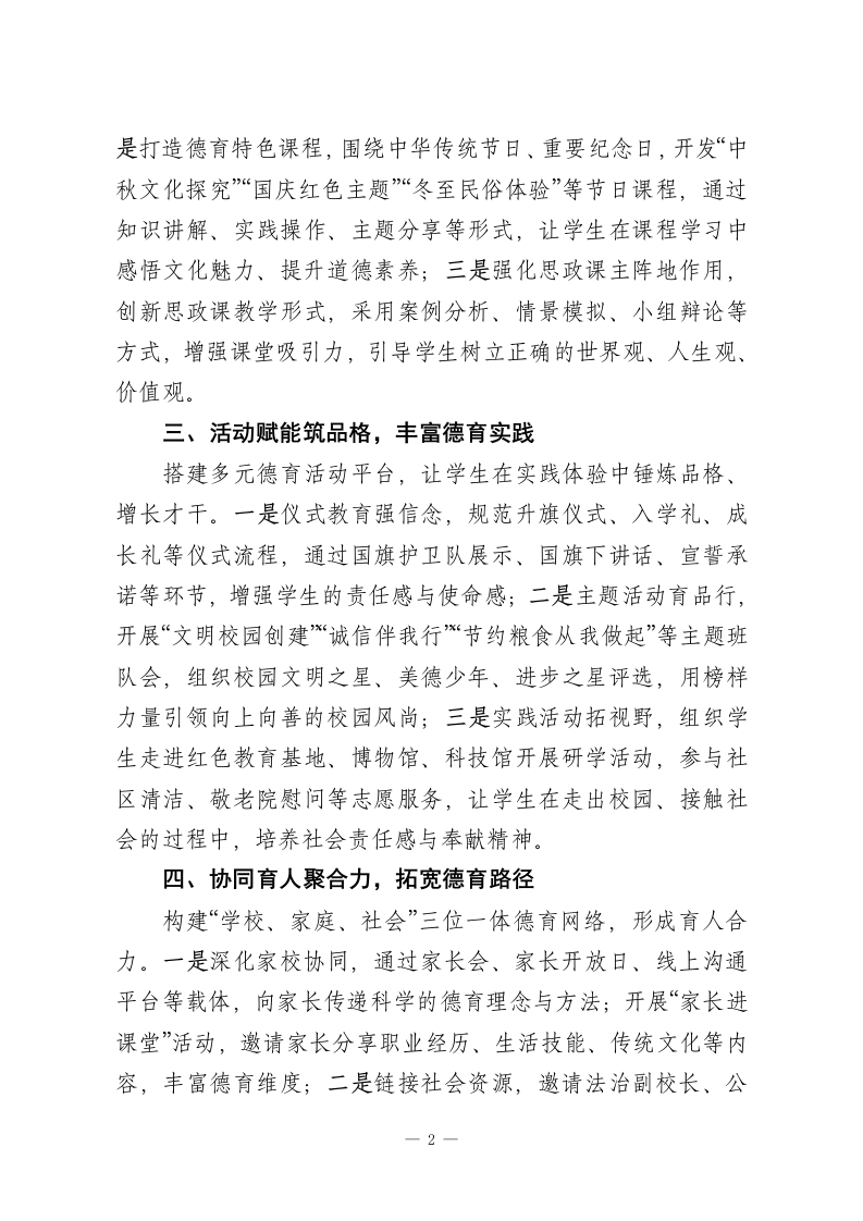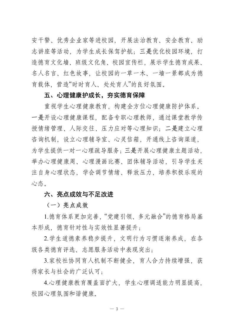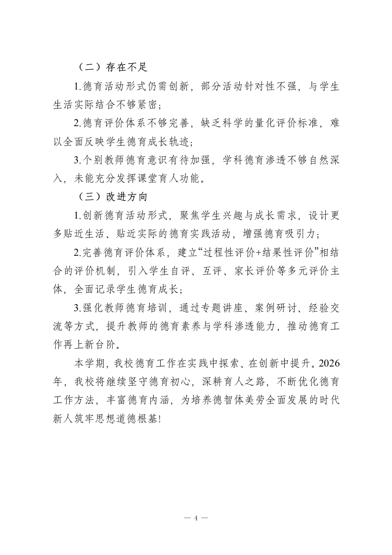 2025-2026学年秋季第一学期学校德育工作总结本学期,我校紧扣“为党育人、为国育才”根本任务,锚定2026年“奋进实干、以德铸魂”的核心基调,以培育学生核心素养为目标,构建“党建引领、课程渗透、活动赋能、家校协同”的德育工作体系,深耕德育实践,厚植育人底蕴,各项德育工作取得显著成效。现将本学期工作总结如下:一、党建引领强根基,筑牢德育方向深化“党建+德育”融合模式,将思想政治教育贯穿德育全过程。一是强化理论武装,常态化开展党员教师政治理论学习、红色研学实践,组织党员示范党课、革命先烈事迹分享会,引导教师以坚定的理想信念引领学生成长;二是发挥先锋作用,设立“党员德育责任区”,党员教师牵头负责班级德育管理、学困生思想引导、德育活动策划等工作,在德育一线亮身份、作表率;三是夯实师德建设,开展“四有”好老师专题培训、师德师风演讲比赛,签订师德师风承诺书,引导教师以高尚的道德情操滋养学生心灵,筑牢德育工作的思想根基。二、课程育人润无声,融入日常教学坚持“德育无痕、润物无声”理念,推动德育与学科教学深度融合。一是深挖学科德育元素,各学科教师结合教学内容,融入爱国主义、集体主义、科学精神、传统文化等德育内涵。语文课堂通过经典篇目诵读传承中华文脉,历史课堂以史实故事培育家国情怀,道法课堂聚焦核心价值观引导行为规范;二1