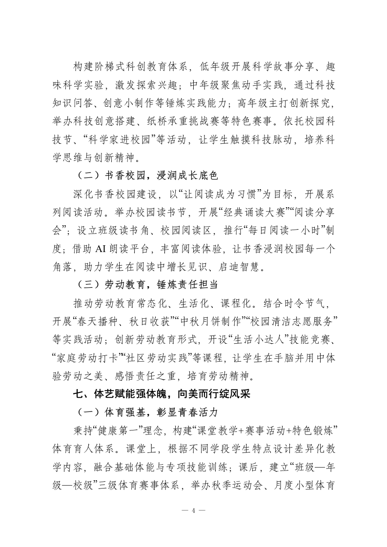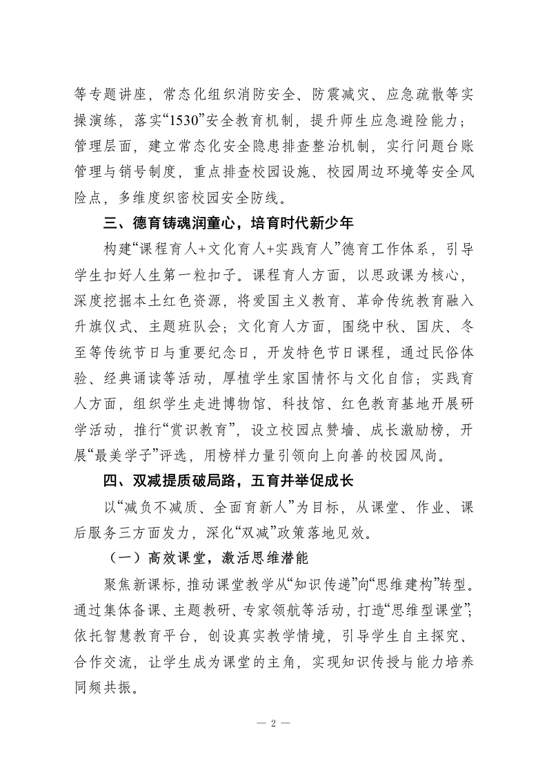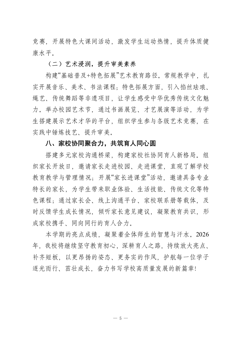 2025-2026学年秋季第一学期学校亮点工作总结本学期,我校紧扣“为党育人、为国育才”初心使命,锚定2026马年“奋进实干、提质创优”的核心基调,以党建为引领,以“五育并举”为抓手,在德育铸魂、双减提质、安全护航、强师赋能、家校协同等关键领域精准发力,深耕教育沃土,各项工作亮点纷呈,为学校高质量发展写下浓墨重彩的一笔。现将本学期亮点工作总结如下:一、党建引领强根基,融合育人显担当深化“党建+教育”融合模式,以“红色领航、实干争先”为主题,构建“理论学习+实践赋能+示范引领”三位一体党建工作体系。常态化开展党员示范党课、红色研学实践、政治理论专题研讨等活动,筑牢党员思想根基;设立“党员先锋岗”“党员责任区”,推动党员教师在课堂改革、青年教师培养、学困生帮扶等一线工作中勇挑重担。通过“青蓝工程师徒结对”“党员一对一帮扶困难学生”等载体,将党建优势转化为育人实效,形成“党建引领、全员参与、协同育人”的良好格局。二、安全护航无死角,筑牢校园防护网秉持“安全第一、预防为主、综合治理”理念,构建“人防+技防+智防”立体化安全管理体系,全方位守护师生安全。硬件层面,升级智慧安防设施,强化校园门禁管理、食品安全全流程监管,优化一键报警系统响应机制,夯实安全基础;教育层面,邀请法治副校长开展校园欺凌防范、反诈宣传、宪法教育—1