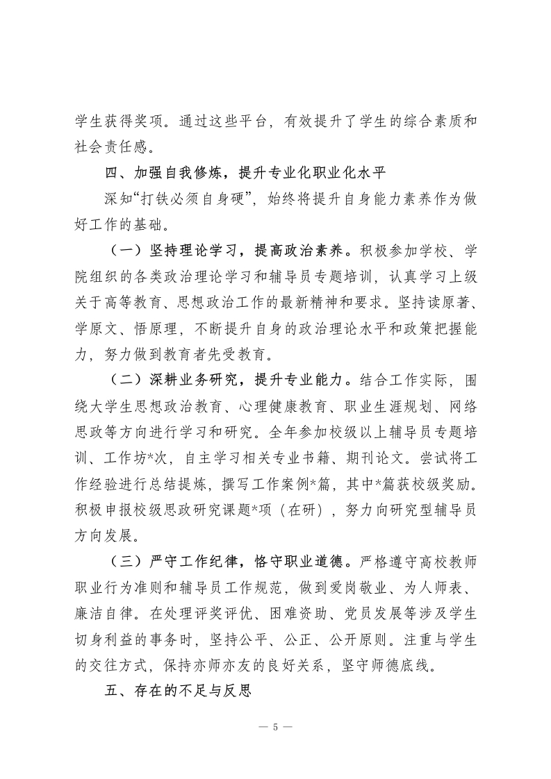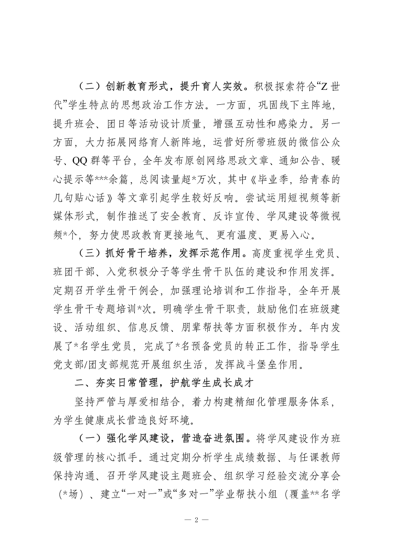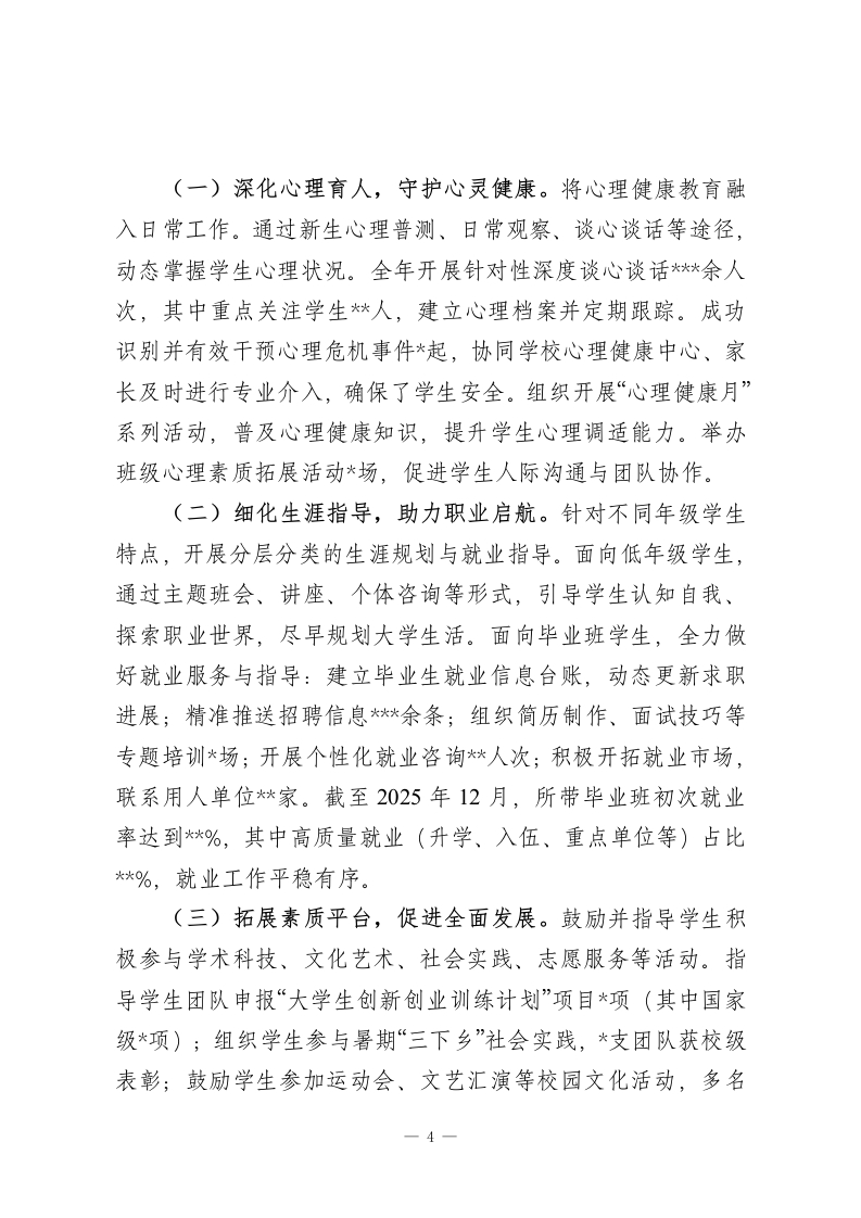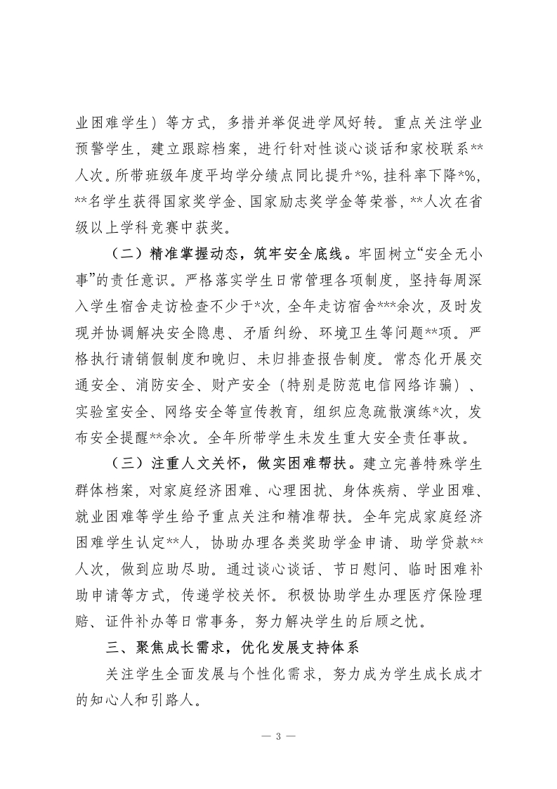 2025年高校辅导员个人工作总结2025年来,在学院党委的领导下,在同事们的大力支持与帮助下,我始终牢记“为党育人、为国育才”的初心使命,紧紧围绕立德树人根本任务,立足辅导员岗位职责,以高度的责任感和饱满的工作热情,投身于学生思想政治教育与日常管理服务各项工作之中。一年来,我与所负责的*个班级、*名学生共同成长,在思想引领、学风建设、心理护航、职业规划、安全稳定等方面做了一些扎实的工作,也收获了宝贵的经验。现将本年度工作情况总结如下:一、聚焦主责主业,深耕学生思想政治引领始终将学生的思想政治教育放在首位,努力培养担当民族复兴大任的时代新人。(一)强化理论武装,筑牢思想根基。坚持用党的创新理论武装学生头脑,结合重要时间节点和国内外时事,通过主题班会、团日活动、座谈研讨、线上推送等多种形式,组织开展理想信念教育、爱国主义教育、社会主义核心价值观教育等各类主题教育活动累计*场,覆盖学生*余人次。例如,围绕“新中国成立76周年”组织“我与祖国共奋进”系列主题活动,激发学生爱国情怀;结合专业特色,开展“科技报国”主题讨论,引导学生将个人发展融入国家需求。注重将思想引领融入日常,利用走访宿舍、个别谈心、网络互动等契机,及时回应学生思想困惑,引导学生树立正确的世界观、人生观、价值观。1