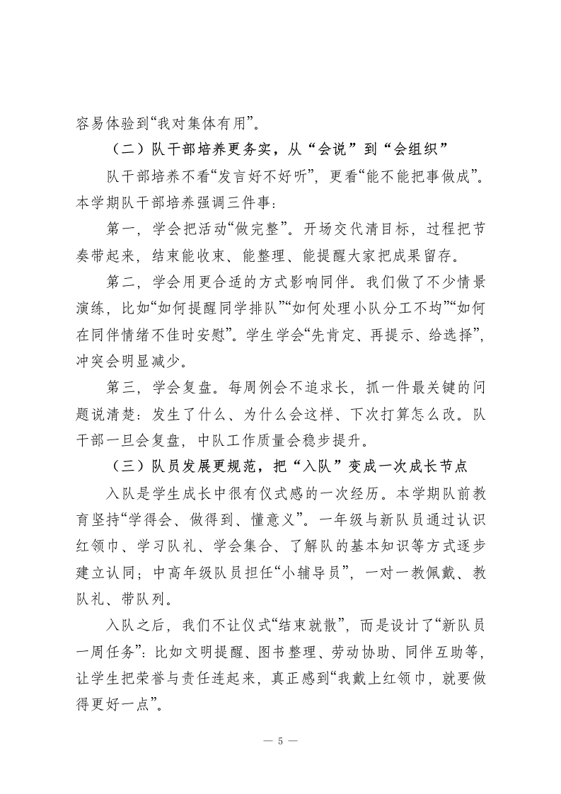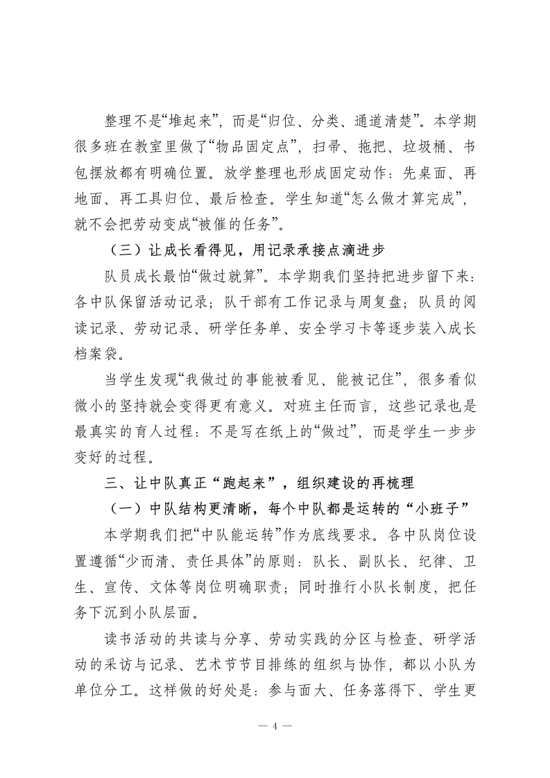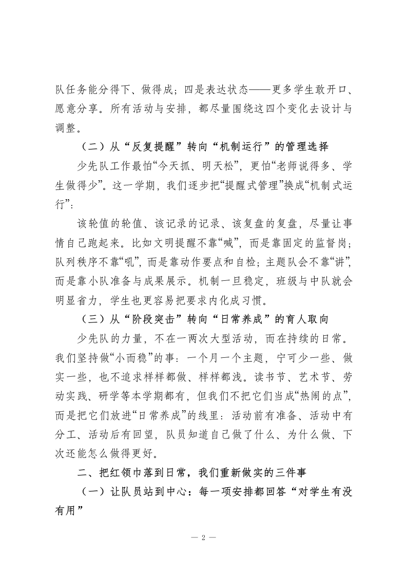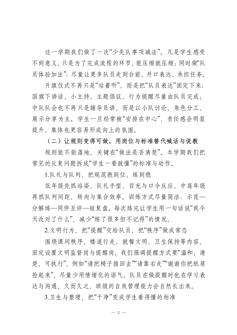 2025年秋季少先队工作总结一一守一份初心,育一路芬芳守一份初心,育一路芬芳。本学期,学校少先队工作始终围绕“让队员在活动中能成长、在日常里将秩序”这条主线推进。我们把重点放在两件事上:一件是把仪式做实,让每一次佩戴红领巾、每一次队礼、每一次集合都“有内容、有温度、有规矩?另一件是把活动做细,把阅读、艺术、劳动、实践、安全、体育等融进队员的校园生活里,不做空泛口号,做学生听得懂、做得到、做了还能留下些什么的行动。回头看这一学期,少先队工作不以“办了多少场活动”来衡量,而更看重“有没有把队员带到更好的状态”:课堂外更会合作,校园里更有秩序,生活中更愿意服务他人,遇到问题更敢表达、会求助。现对本学期工作作一次系统梳理与复盘。一、立一条主线一一这学期我们解决什么问题(一)从“活动热闹”转向“队员状态”的工作判断开学初,我们先把判断标准摆正。少先队工作再丰富,如果队员集合仍慢、队列仍散、值日仍靠催、队会仍只有少数人说话,那说明我们还没把工作真正做到学生身上。因此,本学期我们把观察点明确为四个“状态变化”:一是集体状态一一队列更整齐、集合更高效;二是规则状态一一队员在没有老师提醒时也能做到;三是合作状态一一小一1一