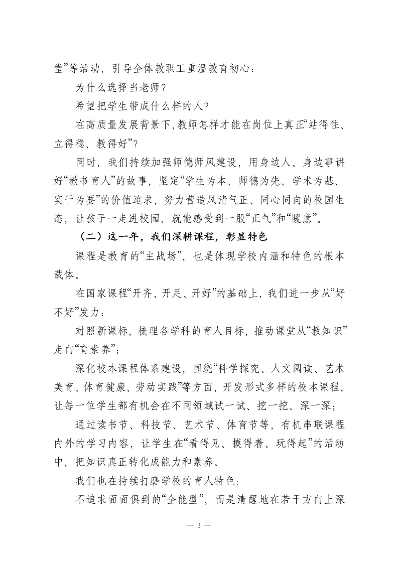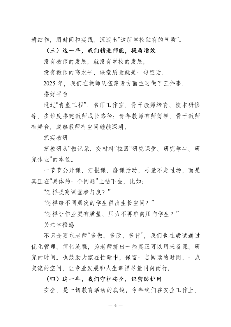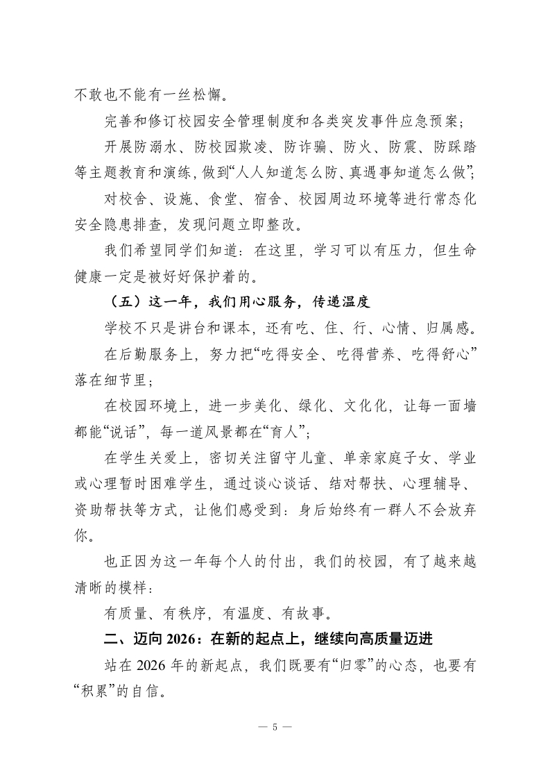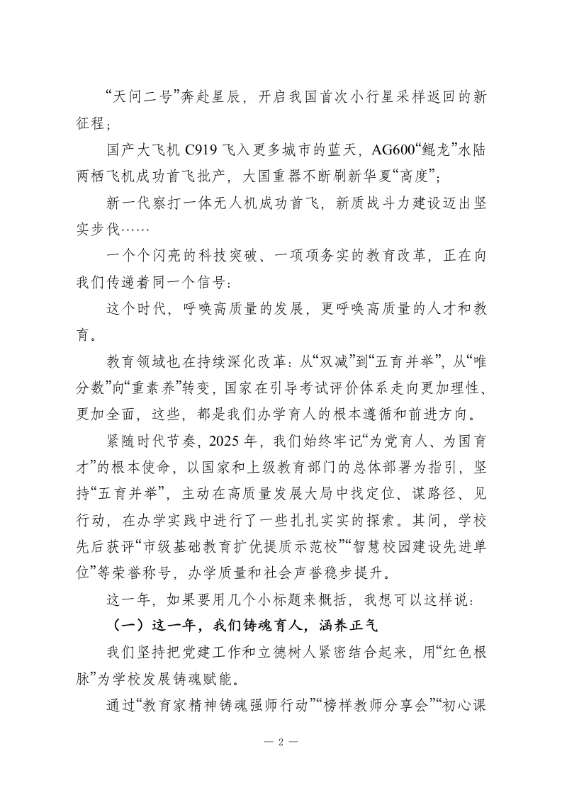 2026年元旦校长精彩致辞亲爱的老师们、同学们,尊敬的家长朋友们、社会各界的同仁们:大家好!旧岁华章渐收,新年序曲初启。当冬日的阳光洒满校园,我们和2025年温暖告别,带着收获和思考,张开双臂迎接充满希望的2026年。在这个辞旧迎新的时刻,我谨代表学校,向一年以来辛勤耕耘在教育教学一线的全体教职工,致以最诚挚的问候;向勤学善思、敢梦敢为的全体同学,送上最美好的祝福;向始终信任支持学校工作的家长朋友们,表达最衷心的感谢;也向长期关心、助力学校发展的社会各界人士,致以由衷的敬意和谢意。一、回望2025:在不平凡的一年里,写下我们的“共同答卷”2025年,对国家、对教育、对我们学校而言,都是不平凡的一年。从大的时代背景看,这一年,是全面贯彻落实国家和省市教育工作会议精神、扎实推进教育高质量发展的关键之年,也是“十四五”规划走向收官、谋划未来发展蓝图的重要衔接之年。国家层面一系列重大会议相继召开,一批重大纪念活动隆重举行,进一步凝聚了全社会团结奋进的信心和力量。与此同时,我们也真切感受到中国科技创新自立自强的铿锵步伐: