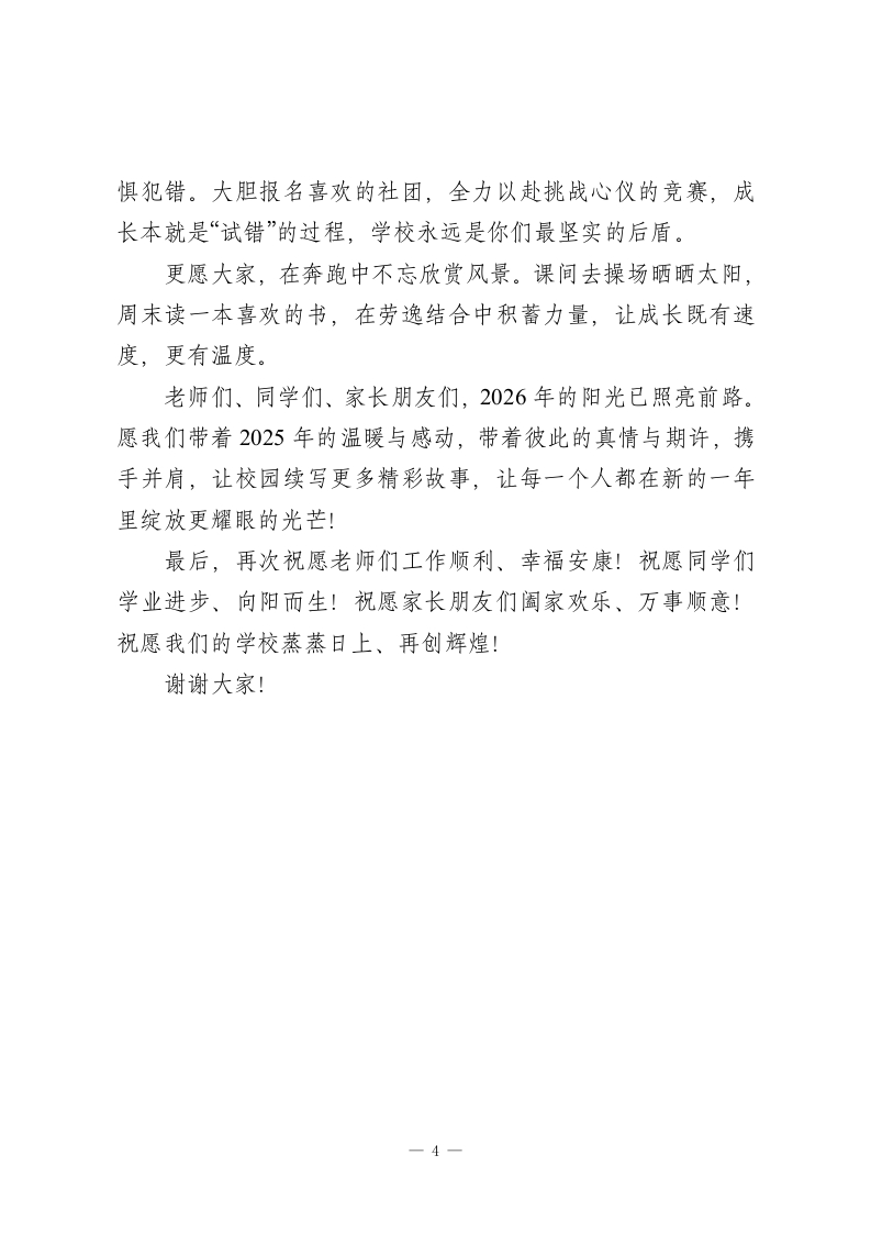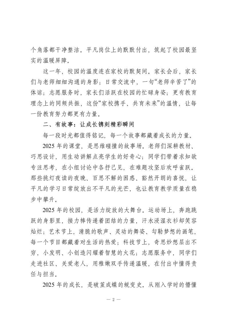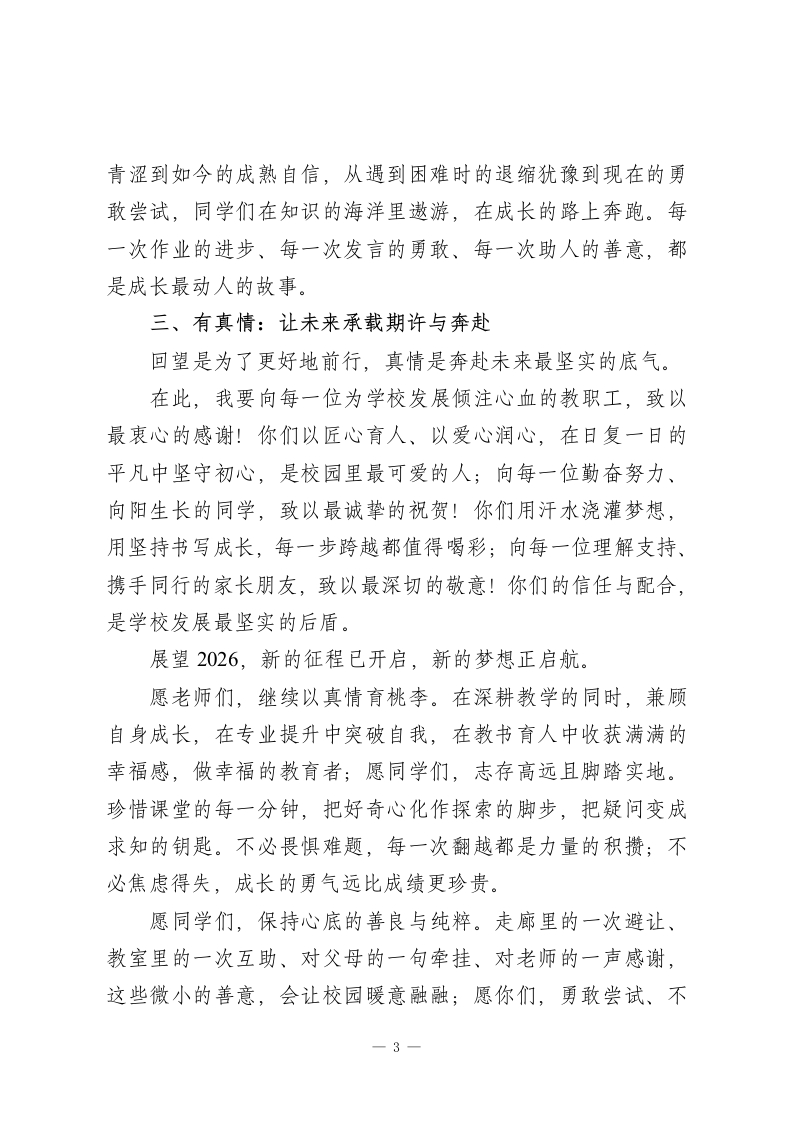 2026校长元旦致辞:有温度、有故事、有真情老师们、同学们、家长朋友们:新年的钟声即将敲响,2026年的曙光正温柔洒满大地。在这辞旧迎新的美好时刻,我谨代表学校,向辛勤耕耘的全体教职工、向阳生长的同学们,以及始终与我们并肩同行的家长朋友们,致以最诚挚的新年问候和最美好的节日祝福!回望2025,我们携手走过的每一段旅程,都因“温度、故事、真情”而格外珍贵。一、有温度:让校园满溢温暖底色教育的本质是心灵的唤醒,而温度,是这份唤醒最动人的底色。这一年,校园的温度藏在老师的坚守里。天未亮,教学楼就已映出匆匆赶来的身影,只为提前调试好课件、等候早到的学生;深夜的办公楼,一盏盏灯光照亮的是伏案批改的专注,密密麻麻的批注里藏着责任,耐心解答的话语中满是担当。这份温度,是课堂上循循善诱的引导,是课后谈心时推心置腹的关怀,是面对困惑时不离不弃的陪伴。这一年,校园的温度暖在后勤的守护中。食堂阿姨凌晨起身忙碌,让每一顿饭菜都带着热乎的烟火气;宿舍管理员像家人般嘘寒问暖,照料着同学们的起居日常;保安师傅24小时坚守岗位,用脚步丈量校园的平安;保洁阿姨默默劳作,让每一1