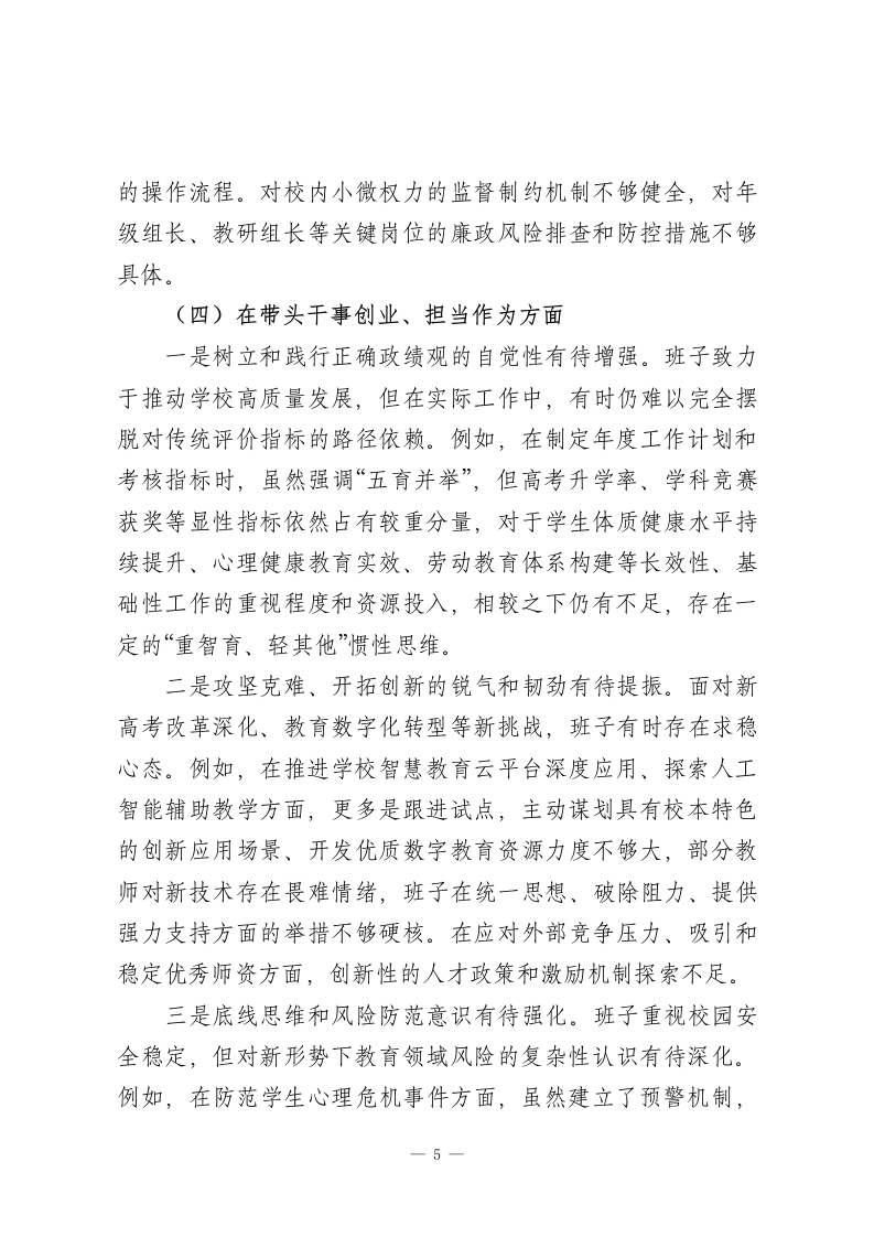 XX市第一中学党委2025年度民主生活会班子对照检查材料(五个带头)根据上级统一部署,XX市第一中学党委班子紧扣2025年度民主生活会主题,在深入学习党的二十届四中全会精神和系列重要文件精神、广泛征求意见建议、坦诚开展谈心谈话的基础上,严格对照五个方面重点内容,深入查摆突出问题,深刻剖析思想根源,明确整改方向措施。现将班子对照检查情况报告如下。一、存在的主要问题党委班子坚持问题导向,紧密联系学校工作实际,把自己摆进去、把职责摆进去、把工作摆进去,认真检视反思,查摆出以下突出问题。(一)在带头强化政治忠诚、提高政治能力方面一是理论武装的深度和转化效果有待加强。班子能够坚持“第一议题”制度,及时组织学习党的创新理论和重要指示精神,但在系统把握、融会贯通上还存在差距。例如,在结合学校实际贯彻落实党的教育方针,特别是将“发展素质教育”等宏观要求转化为具体的课程改革和评价体系改革举措时,思路不够开阔,举措创新性不足,有时仍习惯于参照既有模式,导致部分改革推进缓慢,与高质量发展的要求存在距离。对习近平新时代中国特色社会主义思想中关于教育、科技、人才“三位一体”战略部署的深层逻辑和实践路径研究不够透彻,未能完全将其1