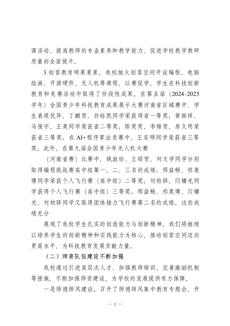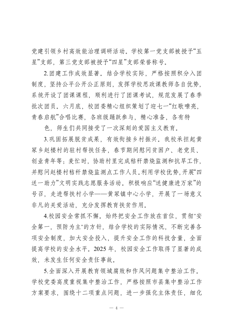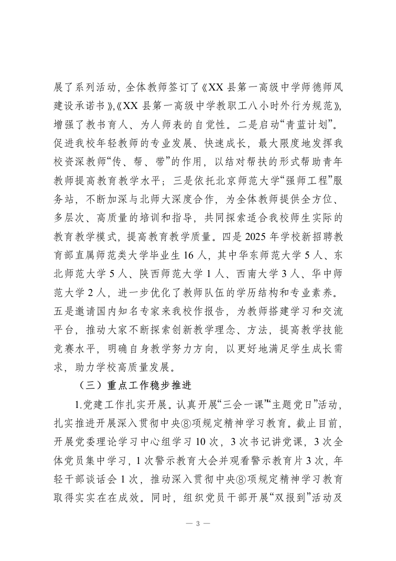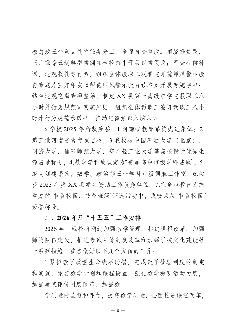 XX县第一高级中学2025年及“十四五”工作总结和2026年及“十五五”工作安排一年来,XX县一高在县委、县政府的领导下,在教体局的具体指导下,坚持“立德树人”根本任务,全面贯彻党的教育方针,不断深化教育改革,不断提升办学水平,出色地完成了预定的各项任务,现就2025年各项工作做以下汇报:一、工作回顾(一)教育教学机制创新、质量稳步提升。1.2025年高考成绩提升。我校2025年参加高考人数1716人,控制线以上上线425人,上线率24.7%。本科上线1322人,上线率80.6%,比2024年提升了9个百分点。在全市同类学校处于领先水平。刘献雍同学以698的优异成绩勇夺商丘市物理方向第一名;刘雅云同学以634分的成绩取得XX县历史方向状元。2.教研教改稳步推进。坚持“请进来”培训、“走出去”观摩、“坐下来”研究的专业研训思路,一是发挥“名师入商”工程带动作用,与郑州11中开展教学教研交流活动,加强与名校联谊交流学习,共促发展;二是“英才部”单独管理,全程跟进、全程管理、全程陪伴、全程关注、全程激励、全程辅导。力争尖子群体和高度实现新突破;三是实行师生同考制度,提高中青年教师对所教学科研究的深度和广度;四是实行“每日一研”集体备1-