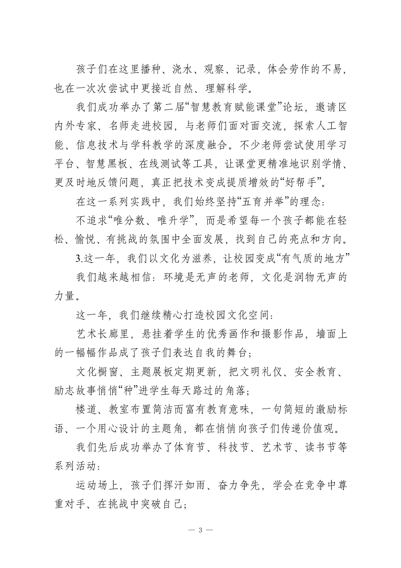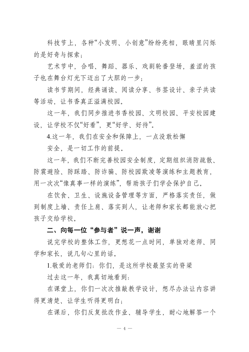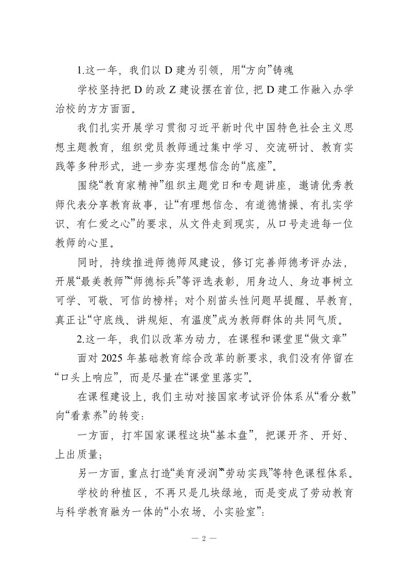 大格局!2026年元旦校长致辞尊敬的各位领导、各位家长,亲爱的老师们、同学们,社会各界的朋友们:大家新年好!又是一年新来到。冬日的阳光慢慢铺满校园,新年的钟声也已在不远处回响。我们带着对2025年的诸多记忆与不舍,郑重地翻过这一页,又满怀期待地走进2026年这本崭新的日历。在这个辞旧迎新的时刻,我谨代表学校领导班子,向一年来辛勤坚守在教育一线、用爱心与智慧守护孩子成长的全体教职员工,致以最诚挚的问候和最衷心的感谢!向勤学善思、不断进步的同学们,送上最真挚的祝福和最殷切的期待!向一直以来信任学校、支持学校、理解学校的各位家长,致以最崇高的敬意!也向长期关心、鼎力支持学校发展的各级领导和社会各界朋友,表示由衷的感谢!一、回望2025:这一年,我们一起走过2025年,是贯彻落实全G教育大会精神、推进教育强G建设的关键一年,也是我校深挖内涵、稳步提质的一年。这一年,我们始终牢记“为D育人、为国育才”的使命,紧跟教育改革节奏,以教育强国建设规划纲要为方向,把“五育并举”真正落在课程里、课堂上、活动中,在有特色的道路上一步一个脚印往前走。