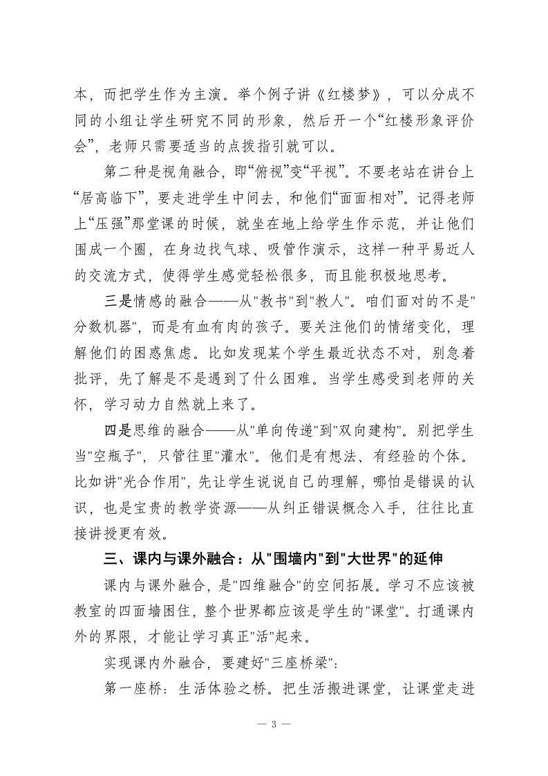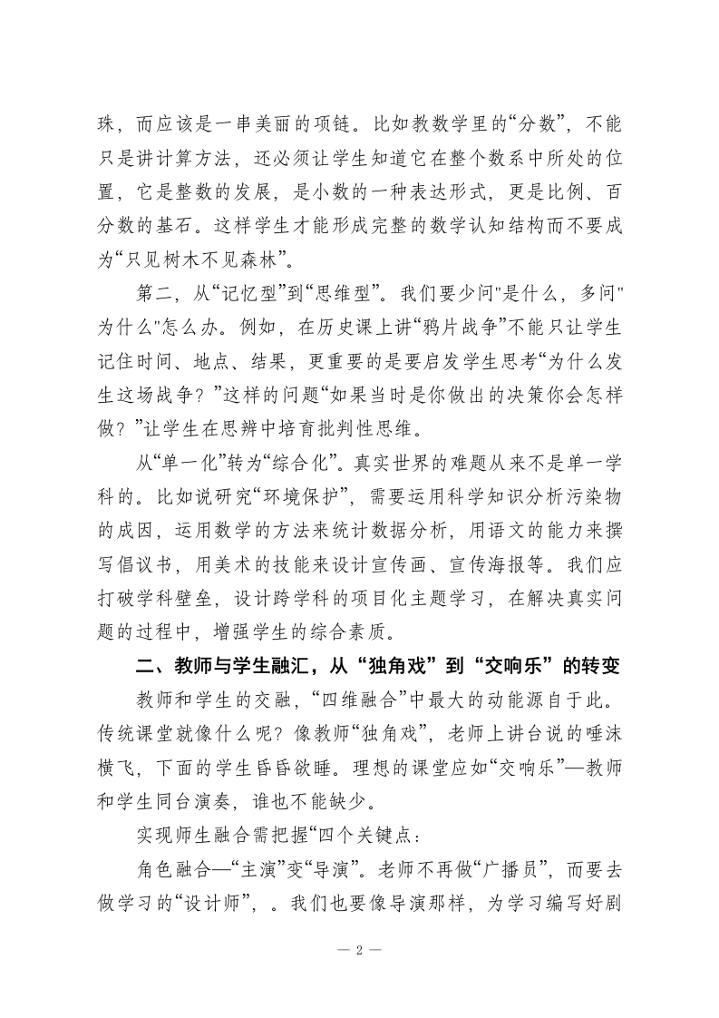 分管教学副校长在全体教师会上讲话:一场会议,让全校99名教师彻夜难眠各位老师,大家好!岁月如流,新学年的教学征程已然扬帆启航。站在这个关键节点上,我想和大家讨论一个很核心的问题,在“双减”政策深入推进、新课标全面实行的大环境下,我们如何去打造学生素养生长的“沃土”?关键就在于教学方式的深层次的变革。正如教育家陶行知所言“教学做合一,好的教学决非单纯地传输知识,而应是教师与学生一起构建意义的过程。今天我想和大家共同交流一下我校正在开展研究的“四维融合”教学法,“即知识素养融合、教师学生融合、课内外融合、传统创新融合”。这不是一个空洞的理念,而是一个可以执行并且能够落实下去的行动计划。它就如同一艘船的“四个引擎”,可以使我们的教学由浅入深、从知识传授变为素养培养。希望能够通过今天这个分享给大家一点新的教学的思路。一、知识和素养融合,从"会答题"过渡到"会思考”知识和素养融合起来,是"四维融合"的基础。我们过去常说“授人以鱼不如授人以渔”,但到真正的实际教学中,又很容易掉入“只给鱼”的怪圈:学生能记住公式、定理,能做题型,但一遇到新的题型便“卡壳”了。这说明什么呢?说明咱们教的“死知识”,没有变成“活素养”。实现知识与素养的融合,关键在于做到“三个转变”。:第一,从“碎片化”转向为“结构化”。知识不是零零碎碎的珍1