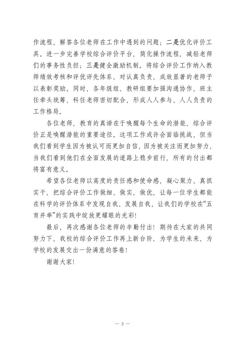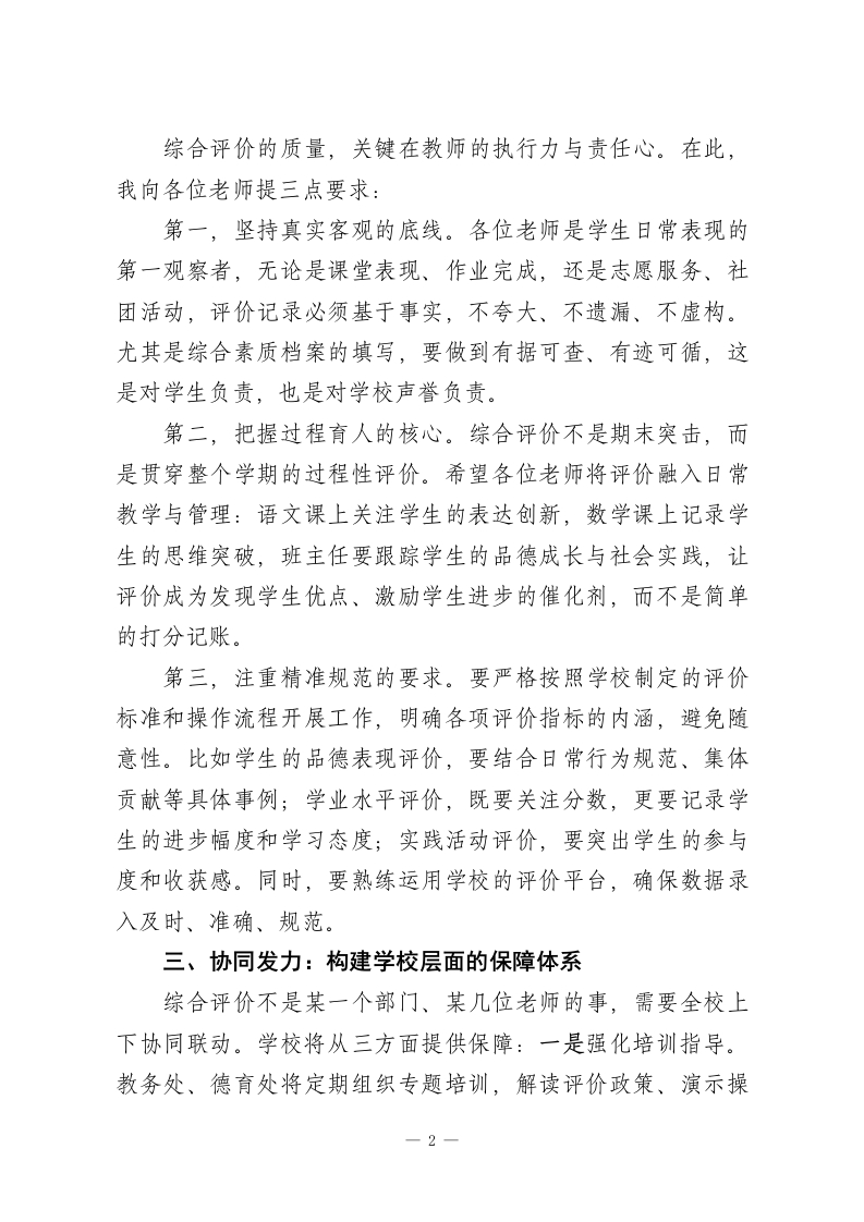 高中学校综合评价工作座谈会,校长在全体教师会上发言:凝心聚力抓综合评价,赋能学生全面发展各位老师:大家下午好!今天我们召开全体教师座谈会,核心议题是深化推进学校综合评价工作。当前,新高考改革持续深化,“立德树人”根本任务的落实路径不断清晰,综合评价作为打破唯分数论、促进学生全面发展的关键举措,既是教育改革的必然要求,更是我们作为教育者的责任担当。在此,我先向过去一段时间里,为综合评价工作默默付出的各位老师,表示衷心的感谢!一、提高站位:深刻认识综合评价的教育本质综合评价不是简单的加分项,更不是额外的负担,其核心价值在于回归教育本真。一是呼应全面发展的育人目标。从品德表现、学业成绩到社会实践、兴趣特长,综合评价让我们看到每个学生的独特性,避免用单一分数标签化学生;二是衔接新高考的改革导向。当前高校招生越来越重视综合素质档案,我们的评价工作,本质上是为学生搭建通往理想高校的桥梁:三是彰显学校的育人特色。通过科学规范的综合评价,我们能更好地提炼学校“五育并举”的成果,让教育质量看得见、摸得着。二、聚焦关键:明确教师在评价中的核心职责1