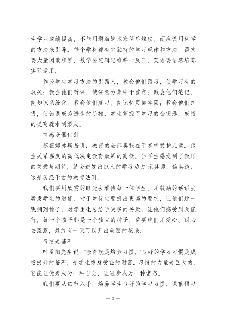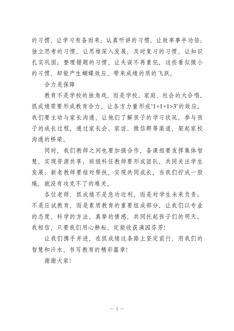 教师会议上,教学副校长讲话:抓成绩是每一位教师的重要职责各位老师:大家好!今天,我想和大家谈谈一个永恒而重要的主题一抓成绩。有人说,讲成绩太过功利,可是,我要说,抓成绩并不是功利而对学生最大的负责,是教育初心最直接的体现。成绩是学生成长的阶梯,是家长信任的基石,也是学校发展的生命线。教师肩负起学生学业成绩的提高任务,是义不容辞的责任。课堂是主阵地著名的教育家陶行知先生说:教师的职务是千教万教,教人求真;学生的职务是千学万学,学做真人这一切都离不开高质量的课堂,课堂是教育的主阵地,是师生共同成长的沃土。40分钟的课堂时间看似短暂,但其中蕴藏着无限可能。我们要像园丁浇灌花朵一样去经营好每一节课,使知识的种子在学生的心田里生根发芽。高效的课堂并不是教师的一角戏,而应该是师生共同演绎的交响乐。应该改变以教师为主导的传统教学方式,让学生成为学习的主人。通过问题驱动、合作探究、展示交流等方式点燃学生思维的火花。记住,最好的课堂不是教师讲得多精彩,而是学生学得多投入。方法是金钥匙”授人以鱼不如授人以渔,这句古训道出了教育的本质。学-1