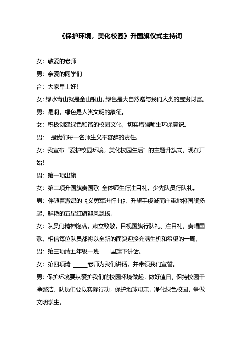 《保护环境,美化校园》升国旗仪式主持词女:敬爱的老师男:亲爱的同学们合:大家早上好!女:绿水青山就是金山银山,绿色是大自然赠与我们人类的宝贵财富。男:是啊,绿色是人类文明的像征。女:积极创建绿色和谐的校园文化,切实增强师生环保意识。男:是我们每一名师生义不容辞的责任。女:我宣布“爱护校园环境,美化校园生活”的主题升旗式,现在开始!男:第一项出旗女:第二项升国旗奏国歌全体师生行注目礼,少先队员行队礼。男:伴随着激昂的《义勇军进行曲》,升旗手虔诚而庄重地将国旗扬起,鲜艳的五星红旗迎风飘扬。女:队员们精神饱满,肃立致敬,目视国旗行队礼、注目礼,奏唱国歌。相信每位队员都将以全新的面貌迎接充满生机和希望的一周。男:第三项请五年级一班【国旗下讲话。女:第四项请老师为我们讲话,并带领我们宣誓。男:保护环境要从爱护我们的校园环境做起,做好值日,保持校园干净整洁,队员们要以实际行动,保护地球母亲,净化绿色校园,争做文明学生。