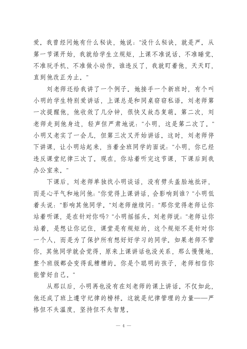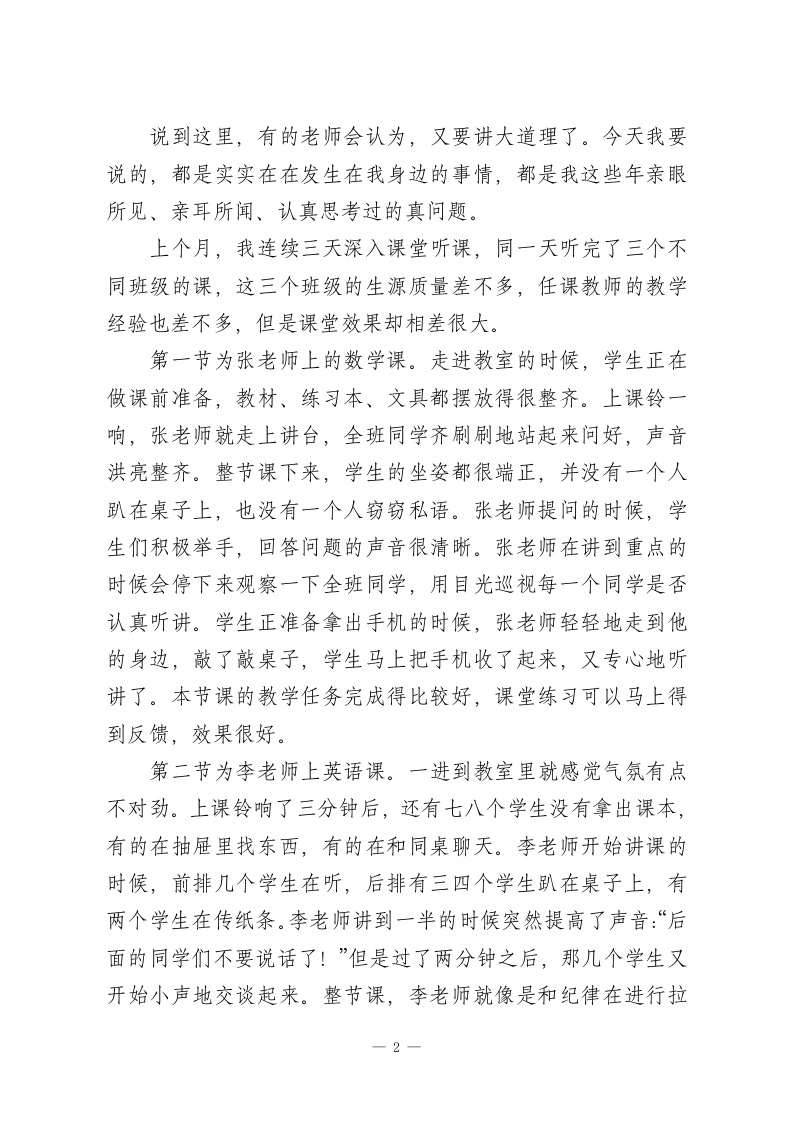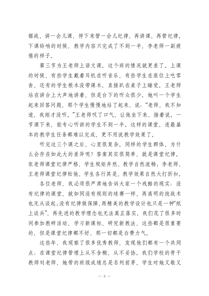 教学副校长讲话:直击要害!先抓课堂秩序,再抓教学质量各位老师:大家好!这段时间我一直思考着一个问题,这个问题让我辗转反侧,夜不能寐。作为分管教学的副校长,我每天都关心着学校教学情况,看各班的成绩单,走进各个教室巡视,和老师们交谈。在其中我看到了很多令人欣喜的进步,也看到了很多让人揪心的困境。最近一次月考成绩公布之后,我就找了几位成绩不理想的班级老师聊了聊。这些老师都很用心,备课认真,讲课也很卖力,但是教学效果就是提不上去。他们诉说的时候,语气里全是无力感:“校长,我真已经做到最好了,每天晚上备课到很晚,课件也做了一遍又一遍,可是学生就是不认可。”“这个班的学生太难管了,上课时有的在讲话,有的在睡觉,有的在玩手机,我一节课要停下来十几次维持纪律。“作业收上来一看,有三分之一的学生没做,找他们谈话就说不会,可是我明明讲得很清楚啊!”听了这些话之后,我心情很沉重。在座的各位老师都辛苦了,都在为学生们的成长付出努力。但是我也要坦率地指出一个被很多老师所忽略的核心问题,那就是我们总是抱怨学生基础差、家长不配合、生源质量不高,而很少去思考,是不是我们的课堂秩序出了问题?是不是我们纪律管理方面出了问题?1
