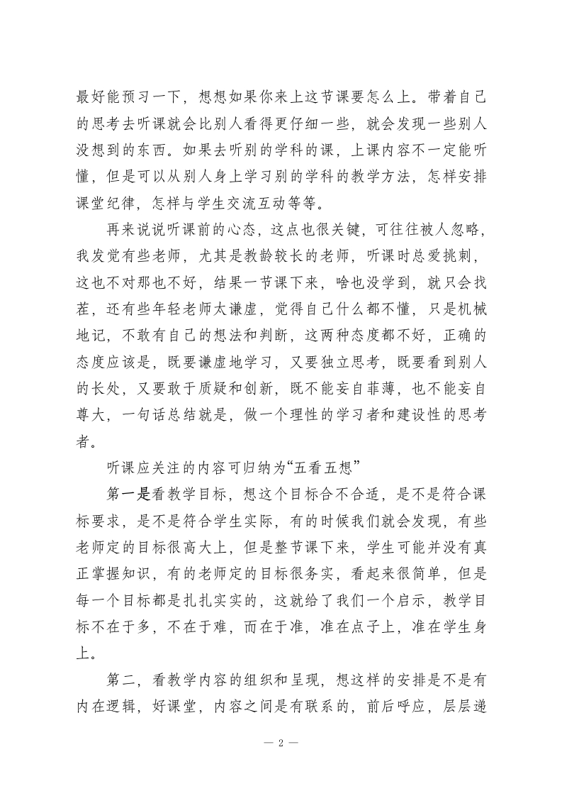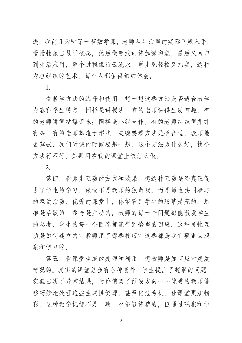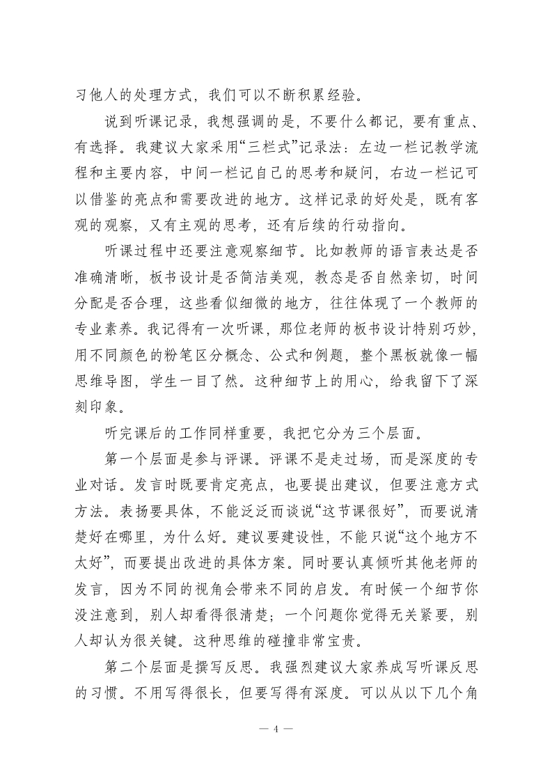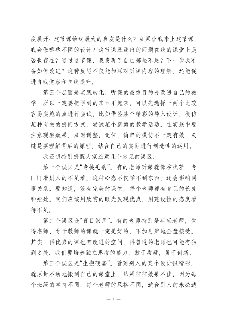 教学副校长在全体教师大会上发言:从听课前、听课中、听课后3个方面来说说我的理解和建议各位老师:大家好,今天想跟大家好好聊聊一个很平常又很要紧的话题,那就是怎么才能上好一节课,这些年我踏进过许多教室,旁听过很多种课,越来越觉得,听课这事儿做好了,对于我们每一个人来说,都是价值无法估量的。我来说说为啥今天我要特意讲这话题。最近我在巡课的时候,发现咱们有些老师把听课当成了走场子,签个到坐下再走一遍场就完事儿,有的老师虽然认真听过之后啥也没有了,听完了之后就没有了。这样的听课说实话对于我个人的成长真的太不起眼,我们每学期都有固定的听课节数,我们的教研组还有备课组经常有公开课,研讨课等等,如果我们每次都能认认真真去听去想去吸收,那这些时间就是最有价值的时间,那怎么才能在一节课里听出价值来呢?我就从听课前、听课中、听课后三个方面来说说我的理解和建议。再来说听课前的准备,老师们都觉得,听课还需要准备啊,拿着一个本子就进教室不就得了?其实不然,听课之前准备得越全面,听课之后收获越多。首先要了解这节课的信息,了解这节课讲的是什么课,教几个班的学生,讲课老师是什么样的老师,是严厉型的还是活泼型的等等,如果是听相同学科的课,