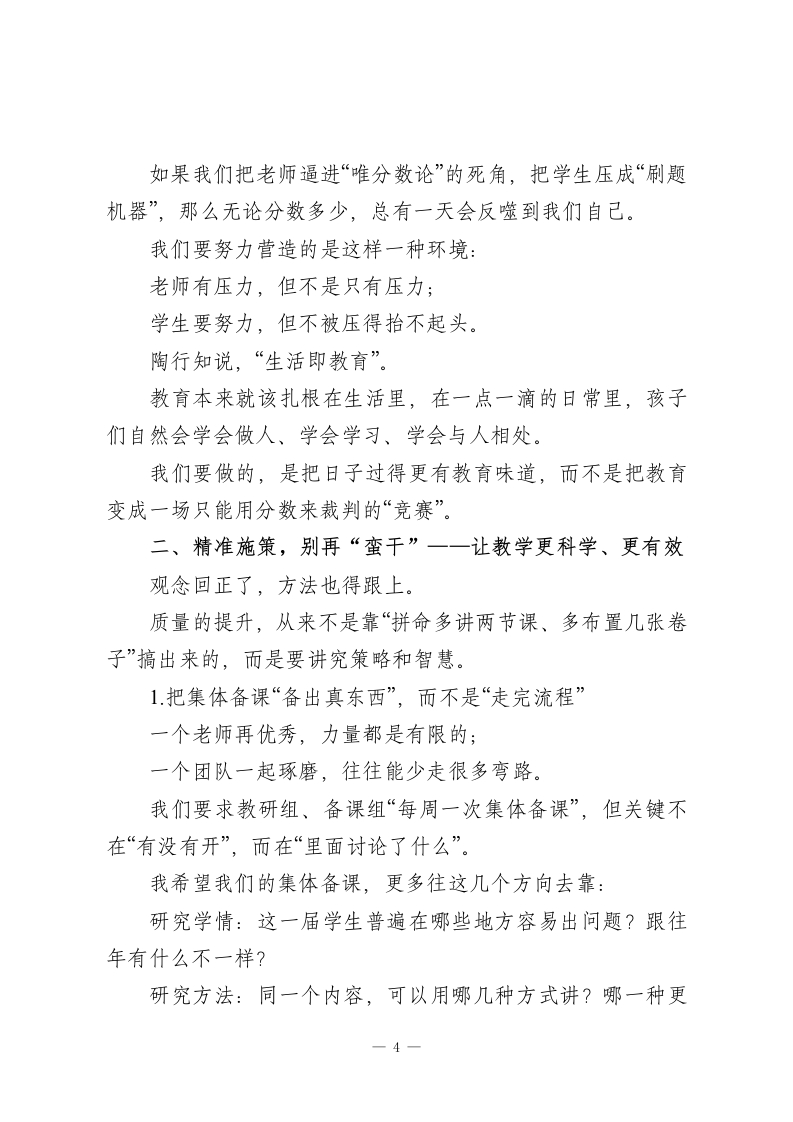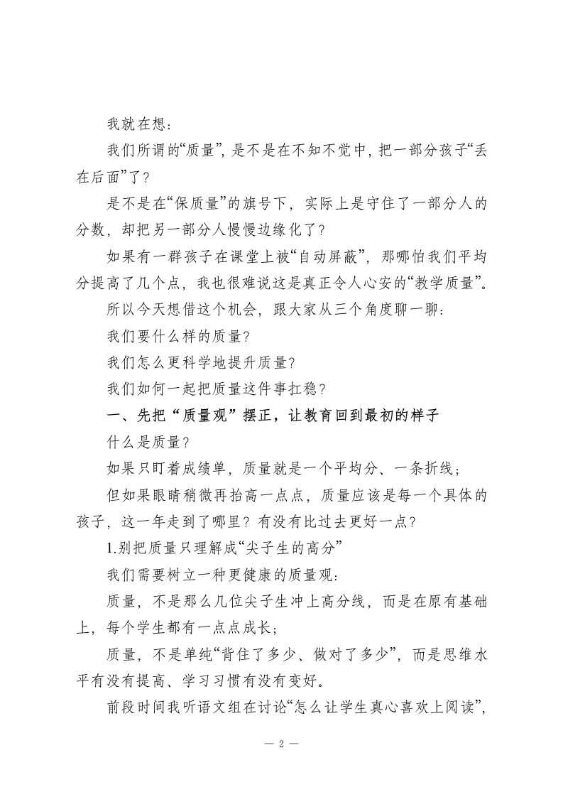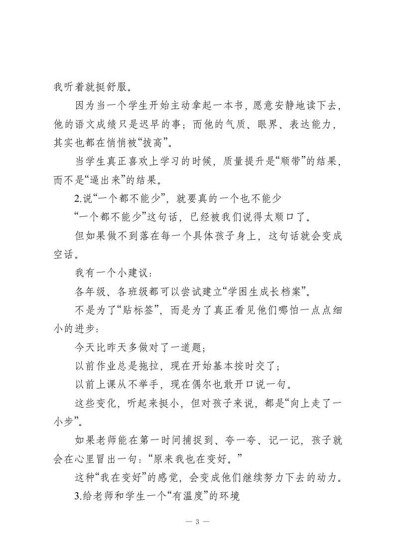 教学质量推进会上,校长讲话:反正听不懂,听了也没用,眼神空洞地望着窗外各位老师、同志们:大家好!又到了质量分析的时间。说实话,每次拿到这摞数据报表,我心里都挺复杂的:一方面,确实有点沉重一一离我们心里的目标,还有不小的差距;另一方面,又隐隐有点期待每一张表、每一条曲线,其实都在告诉我们:还有提升的空间,还有可以改进的可能。这几天我在想一个看似简单、其实挺尖锐的问题:我们嘴上常说的“教学质量”,到底指的是什么?是分数?还是学生真正的成长?前几天,我去初三听了一节数学课。老师讲得很认真,板书也很工整,从“教的角度”看,确实挑不出大毛病。但我注意到后排有三个孩子,从头到尾几乎没抬过头,不是在睡,而是眼神空空地望着窗外。课后我特意把其中一个学生叫过来,问他:“你刚才为什么不听?”他愣了一下,说:“反正听不懂,听了也没用。”这一句“听也没用”,老实说,对我触动挺大,甚至可以说是“有一点点伤害”。一1