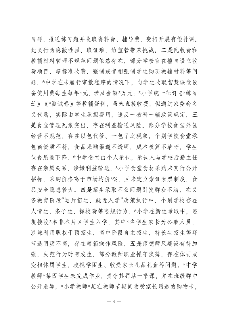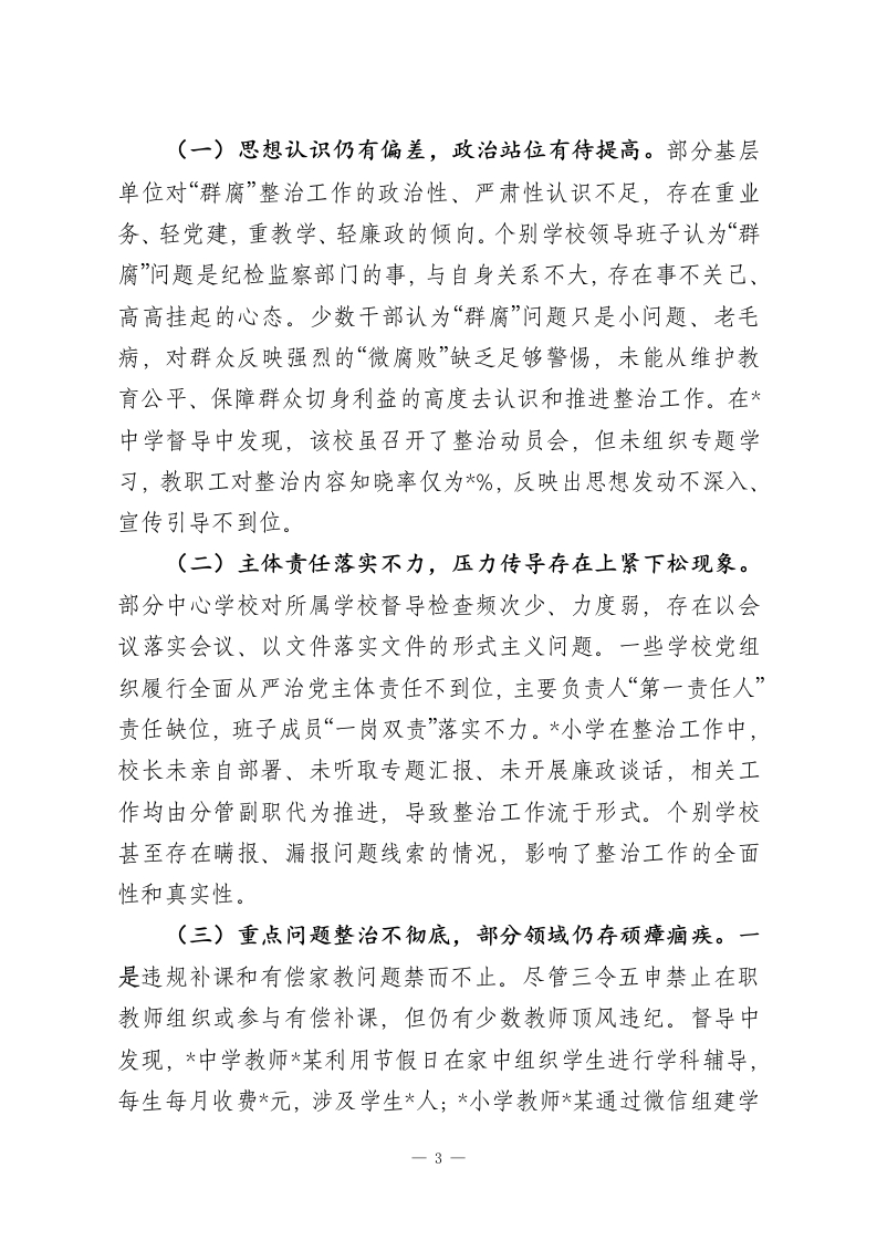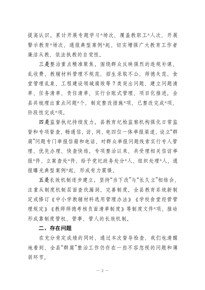 教育领域“群腐”整治工作督查通报为切实推动教育领域“群腐”整治工作走深走实,确保各项任务落地见效,县教育局成立*个督查组,于*月*日至*月*日,深入全县*所中小学(含民办学校)、*个直属单位,通过听取汇报、查阅资料、实地走访、座谈访谈、问卷调查、随机抽查等方式,对“群腐”整治工作推进情况进行了全方位、全过程、全覆盖的督导检查。现将督导检查情况通报如下。一、总体情况自“群腐”专项整治工作启动以来,全县教育系统坚决贯彻落实省市县委决策部署,把整治群众身边腐败问题作为践行“两个维护”的具体行动,作为办好人民满意教育的重要抓手,强化组织领导,压实主体责任,细化工作举措,推动整治工作取得阶段性成效。一是组织领导坚强有力。县教育局第一时间召开党组专题会议,研究部署“群腐”整治工作,成立由局长组长的专项整治工作专班,制定印发《*县教育局关于开展教育领域群众身边不正之风和腐败问题专项整治工作方案》,明确整治重点、责任分工、时间节点和工作要求。各学校均成立相应机构,制定实施方案,形成一级抓一级、层层抓落实工作格局。二是思想认识持续深化。通过召开动员部署会、专题学习会、警示教育大会等形式,组织广大教职工深入学习习近平总书记关于全面从严治党的重要论述,学习中央纪委、省市县纪委关于整治群众身边腐败问题的有关精神,进一步统一思想、1