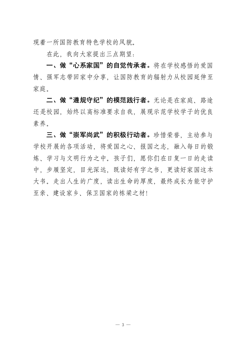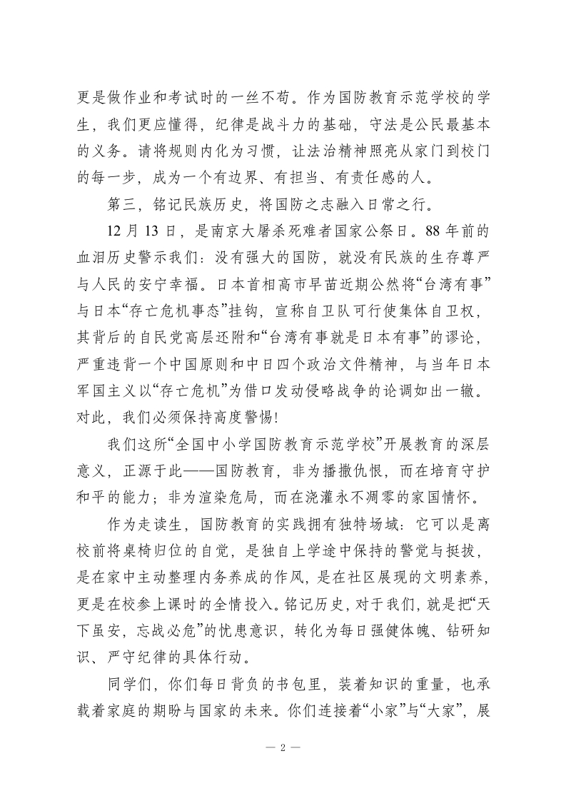 连接家门与校门,走实爱国强军路一一在某中学学生思政主题课上的讲话老师们,亲爱的同学们:大家好!十二月承载着特殊的重量。作为一所九年一贯制的走读学校,同学们每日往返于家庭温暖与校园成长之间,这条熟悉的路径,也正是个人成长与国家命运相连的缩影。今天,我们以“全国中小学国防教育示范学校”学子的身份,一同回望历史、观照当下、思考未来。第一,理解发展蓝图,在时代坐标中锚定成长方位。近期,党的二十届四中全会就推进国家治理现代化作出重要部署。这描绘的,正是保障我们每日能够平安从家到校、安心学习生活的大背景。同学们每天看到的整洁街道、有序交通、祥和社区,都是国家治理效能的微观体现。作为走读生,你们对社会的感知更直接、更鲜活。希望大家不仅做美好生活的体验者,更要做观察者和思考者:思考个人成长如何与国家发展同频,思考今日所学如何为明日参与国家建设储能。将走读途中的所见所闻,转化为对“国”与“家”关系的朴素而深刻的理解。第二,涵养法治信仰,让规则意识护航成长之路。刚刚过去人12月4日是国家宪法日,各班进行了宪法晨读。宪法是国家的根本法,而法治精神就体现在我们每日的言行规范中。对于走读的你们而言,守规则贯穿全程:它是离家上学时与家人的守时约定,是往返途中对交通信号的严格遵守,是校园内队列训练的令行禁止,是课堂上对师长的尊重与倾听,1