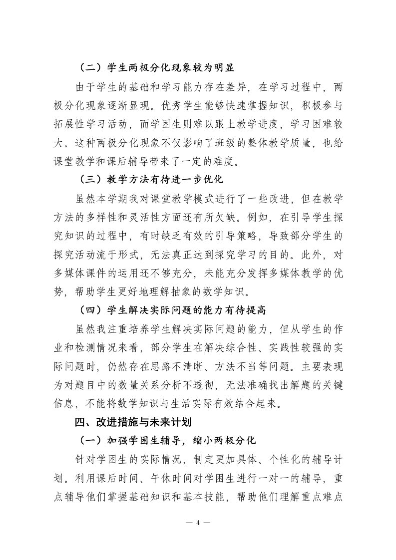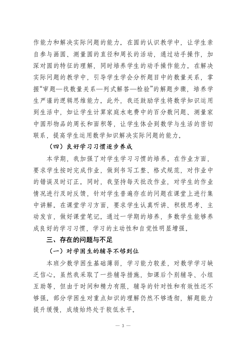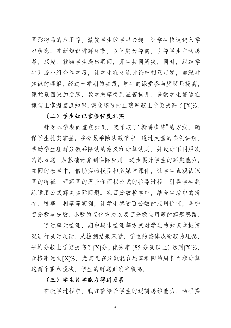 六年级上学期数学教学工作总结六年级上学期是学生小学阶段数学学习的关键时期,不仅要巩固前期所学知识,更要为初中数学学习奠定坚实基础。本学期,我严格按照教学大纲要求,结合学生实际情况,认真开展教学工作。现将本学期教学工作情况总结如下:一、教学工作概述本学期六年级上学期数学教材的核心内容包括分数乘法、分数除法、分数混合运算、百分数、圆的认识与周长面积计算等。这些内容既是小学阶段数学知识的重点,也是难点,与学生的生活实际联系紧密,对培养学生的逻辑思维能力和解决实际问题的能力具有重要意义。本班共有学生X]名,学生基础参差不齐。部分学生基础扎实,思维活跃,能够主动参与课堂互动,积极完成学习任务;但也有少数学生基础薄弱,学习习惯较差,对数学学习缺乏兴趣,在理解和掌握重难点知识时存在较大困难。针对这一情况,我在教学中坚持“因材施教”的原则,根据不同学生的学习能力和水平,制定个性化的教学方案,力求让每个学生都能在原有基础上有所提升。二、主要教学成果(一)课堂教学效率显著提升本学期,我注重优化课堂教学模式,改变传统的“填鸭式”教学,采用“情境创设+问题引导+小组合作”的教学方法。在课堂导入环节,通过创设与生活相关的教学情境,如购物打折、1