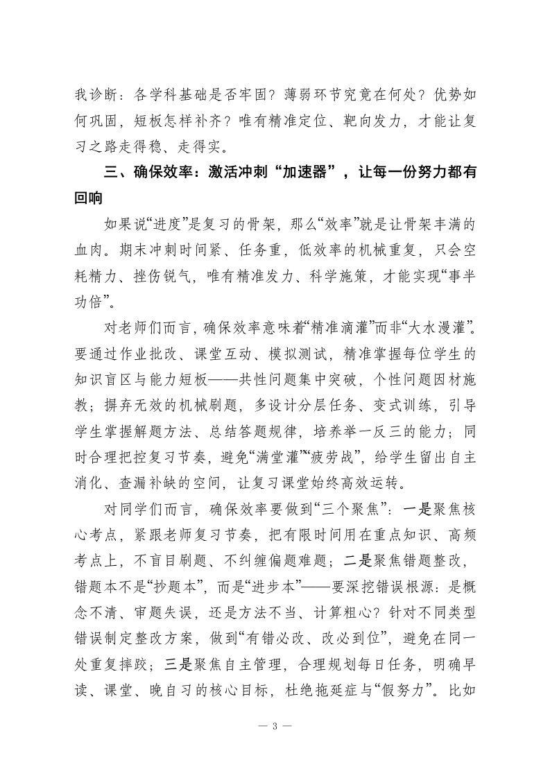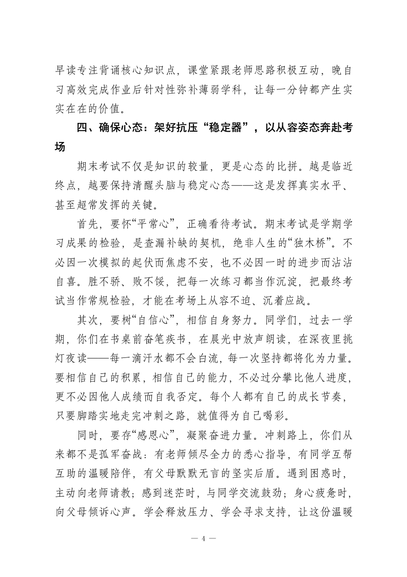期末动员大会,校长讲话:要做到4个确保!尊敬的各位老师、亲爱的同学们:大家下午好!时光匆匆,期末的脚步悄然走近,校园里已然弥漫着冲刺的紧迫感。今天,我们齐聚一堂,隆重召开期末备考冲刺动员大会,只为统一思想、凝聚共识、明确方向、提振士气,为圆满收官本学期、斩获优异成绩,做好最充分的准备!回首这一学期,我们一同见证了同学们在品德修养、学识积累、身心健康、审美素养与劳动实践中的全面成长。晨读时光里的琅琅书声,课堂之上的专注眼眸,运动场上的矫健身影,各类活动中绽放的才华创意一一这一幕幕鲜活场景,共同绘就了云顶学校最动人的风景。如今,我们即将迎来学期末的“大检阅”一期末考试。这不仅是对知识掌握程度的重要考核,更是对大家意志品质、学习习惯与心理素质的综合淬炼。如何高效、扎实、从容地走好最后冲刺路,是我们每一位师生都需答好的关键课题。借此机会,我围绕“珍惜时光,不负韶华,以最佳状态迎接挑战”这一主题,向全体师生提出四点希望与要求,概括而言就是要做到“四个确保”:一、确保秩序:筑牢备考“安全线”,守护安定有序的校园环境秩序是教育教学高效运转的根基,更是期末冲刺阶段的“底一1