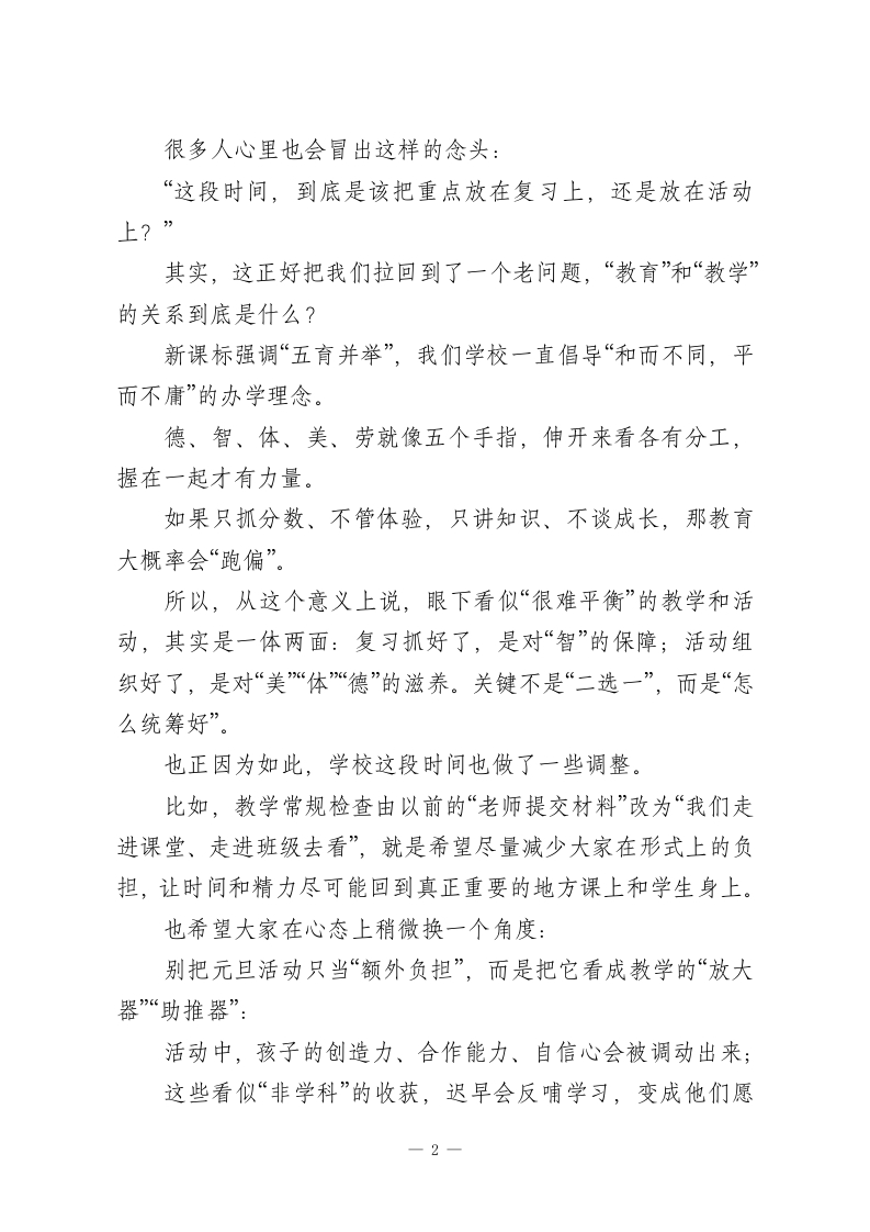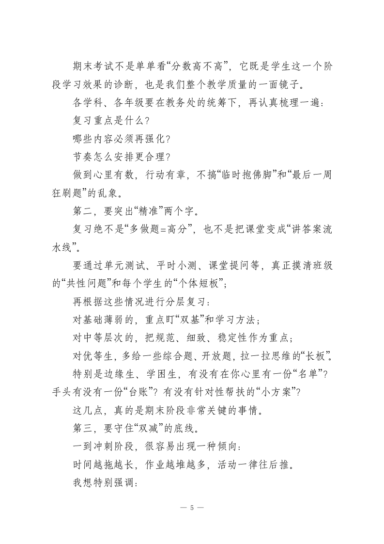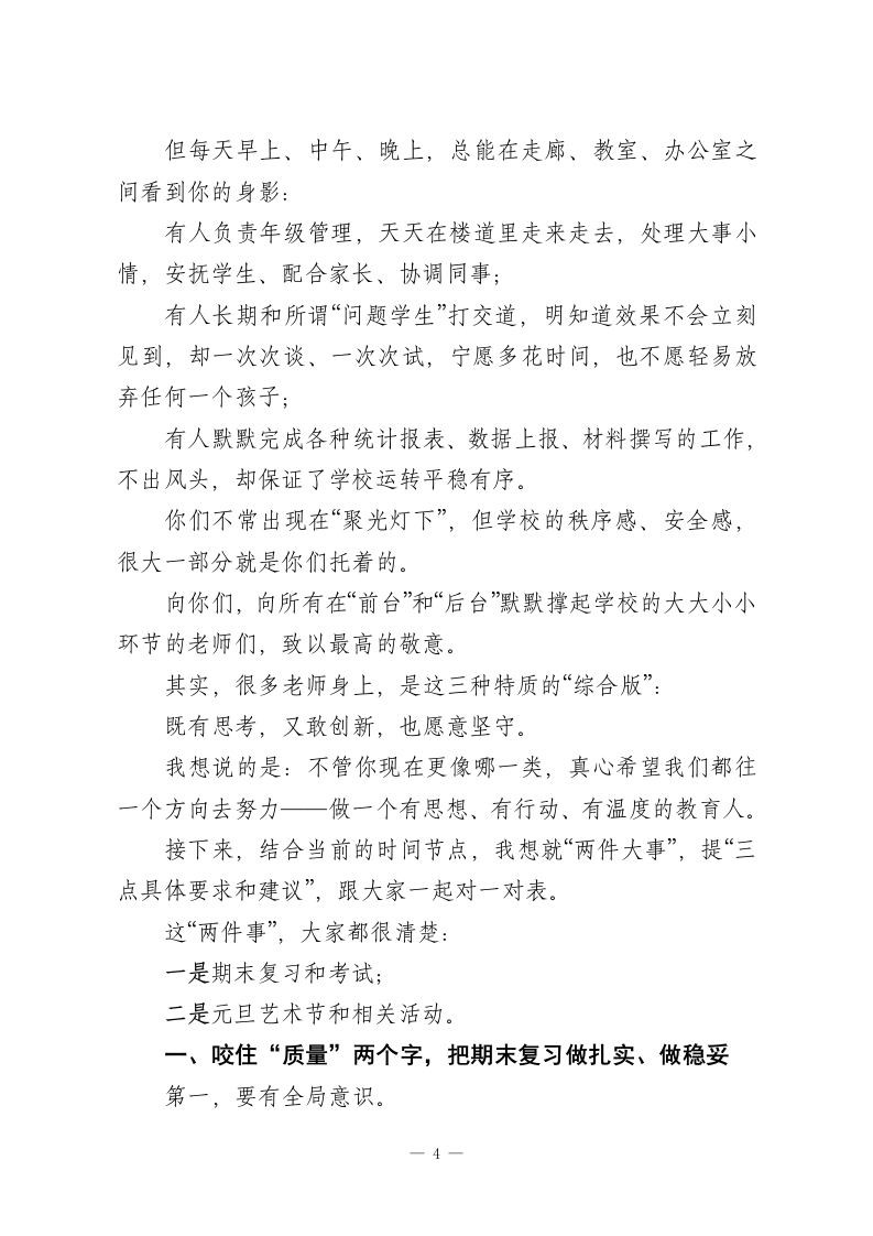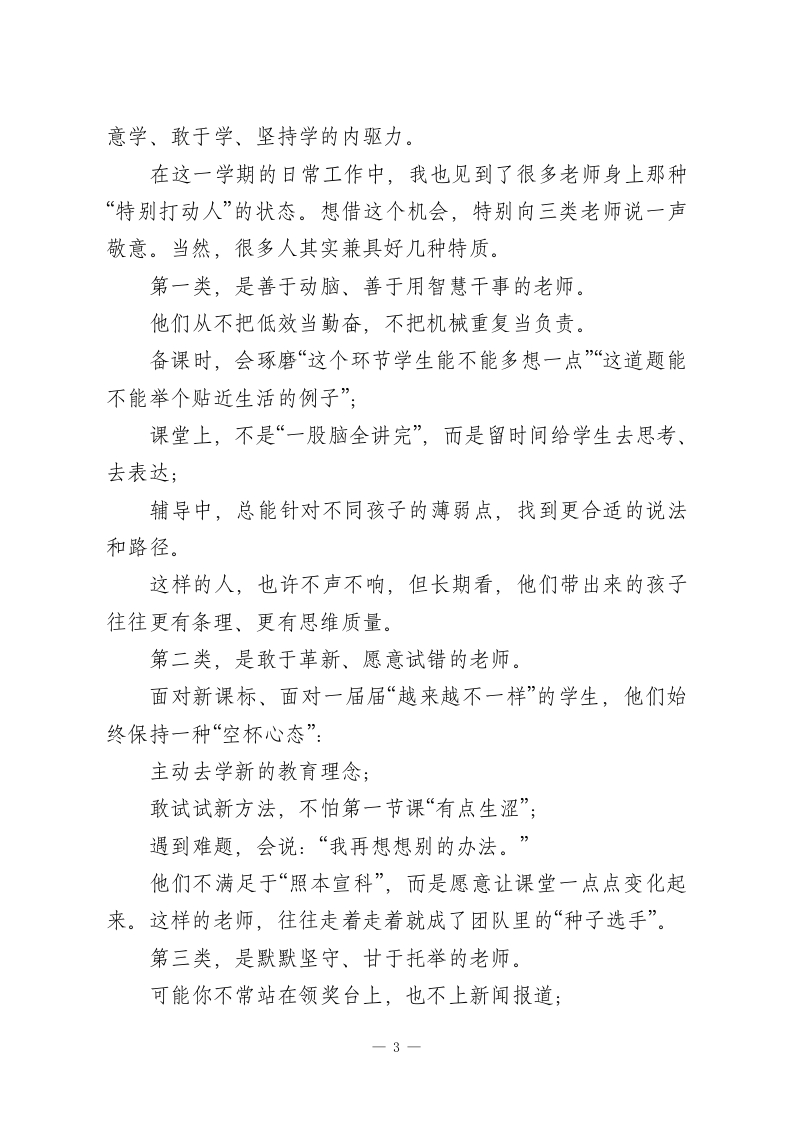 期末教师动员大会,校长讲话:这3类老师令人敬佩!各位老师:下午好!一转眼,这个学期已经走到了尾声。今天把大家聚在一起,开这次期末冲刺暨元旦筹备工作动员会,说白了,就是想在这个关键节点上,和大家好好聊一聊一一既回头看看这一程我们走过的路,也一起商量接下来这段“最忙、也最关键”的时间怎么打好。先想说一句:谢谢大家,真的辛苦了。这一学期,大家从开学忙到现在,早出晚归已经成了常态。在课堂上,你们因材施教,耐心讲解;课后,你们一次次答疑辅导,不厌其烦地帮学生把一个个“不会”变成“会”。现在这个阶段,大家既要全力以赴抓好期末复习,为学生的“学业收成”保驾护航,又要兼顾元旦艺术节的节目排练和活动组织,给孩子们搭建展示自我的舞台。很多老师白天带课、晚上排练,来回奔波,牺牲了休息时间,却鲜少听到一句抱怨。这些付出,学校都看在眼里、记在心里。也真心为大家感到骄傲。现在,期未复习的紧张节奏和元旦跨年的喜庆氛围交织在一起,难免会让不少老师觉得身上“有点顶得慌”:课要上好,复习要扎实;节目要排练,效果要呈现。1