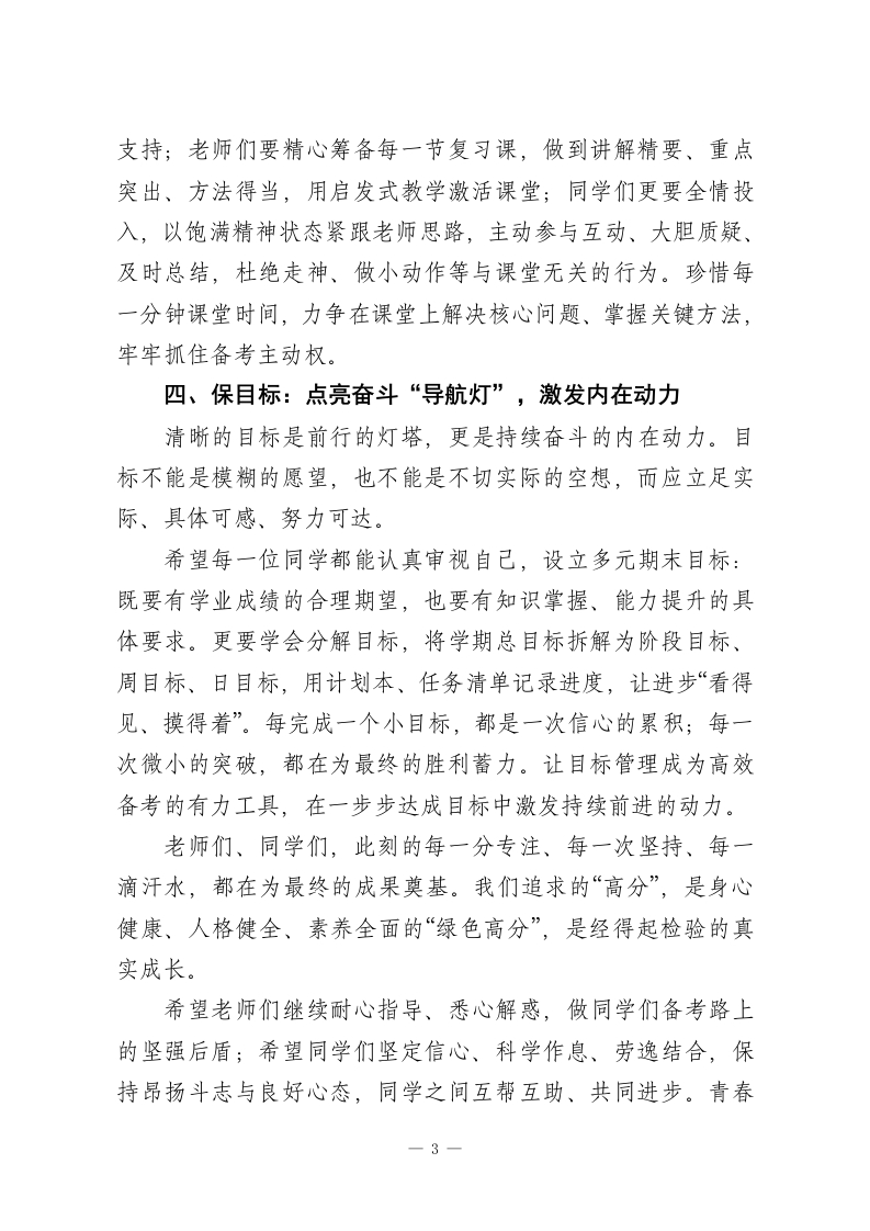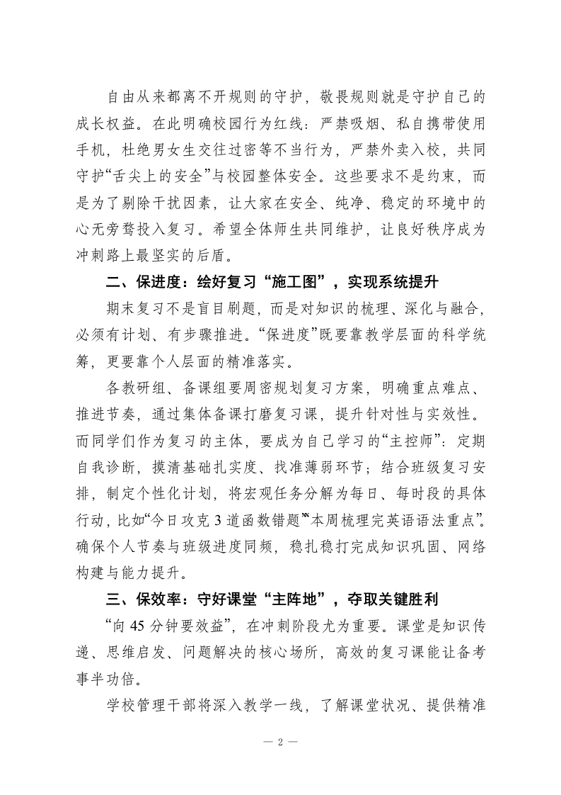 秋季学期末动员大会校长讲话:锚定四“保”,圆满收官尊敬的各位老师、亲爱的同学们:大家下午好!时光飞逝,本学期学期已进入决战冲刺的关键阶段,2026年的脚步愈发临近。今天我们召开期末备考动员大会,核心是统一思想、凝聚力量,以“四保”为抓手,全力以赴冲刺期末,用优异成绩为本学期画上圆满句号。过去一学期,校园里处处可见大家成长的身影:晨读时的琅琅书声、课堂上的专注眼神、运动场上的奋力奔跑、活动中的创意迸发,这些点滴付出共同绘就了学校最美的风景。如今,期末考试的大幕即将拉开,这不仅是对知识掌握的检验,更是对意志品质、学习习惯和心理素质的综合考量。如何在最后阶段高效冲刺、从容应考,是我们每一位师生都要答好的关键考题。下面,我围绕“马年实干冲刺,不负韶华时光”这一主题,向全体师生提出“四保”要求,愿大家以坚定的信念、科学的方法,决胜期末:一、保秩序:筑牢备考“安全线”,守护纯净环境秩序是高效备考的前提,更是成长路上的“防护墙”。期末冲刺阶段,校园的每一处秩序都关乎备考效率:课堂上的专注宁静、课间的文明休息、晚自习的全神贯注、寝室的规律作息,这些看似微小的细节,实则在为我们积蓄冲刺的能量。1