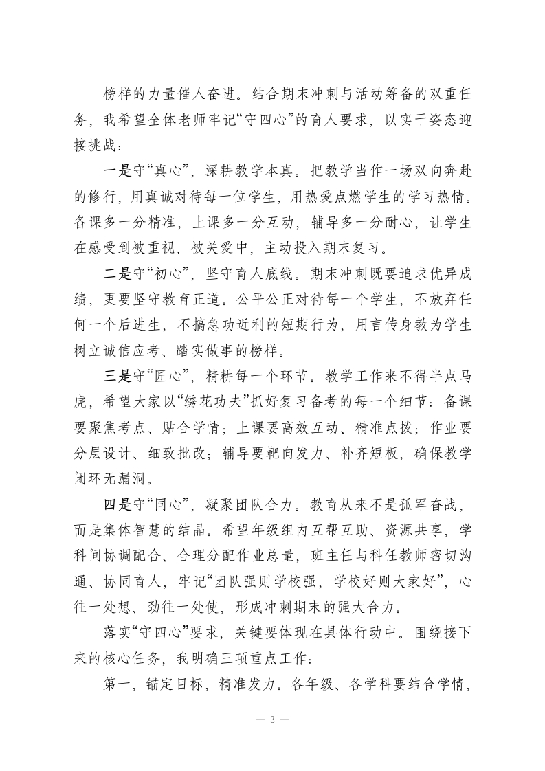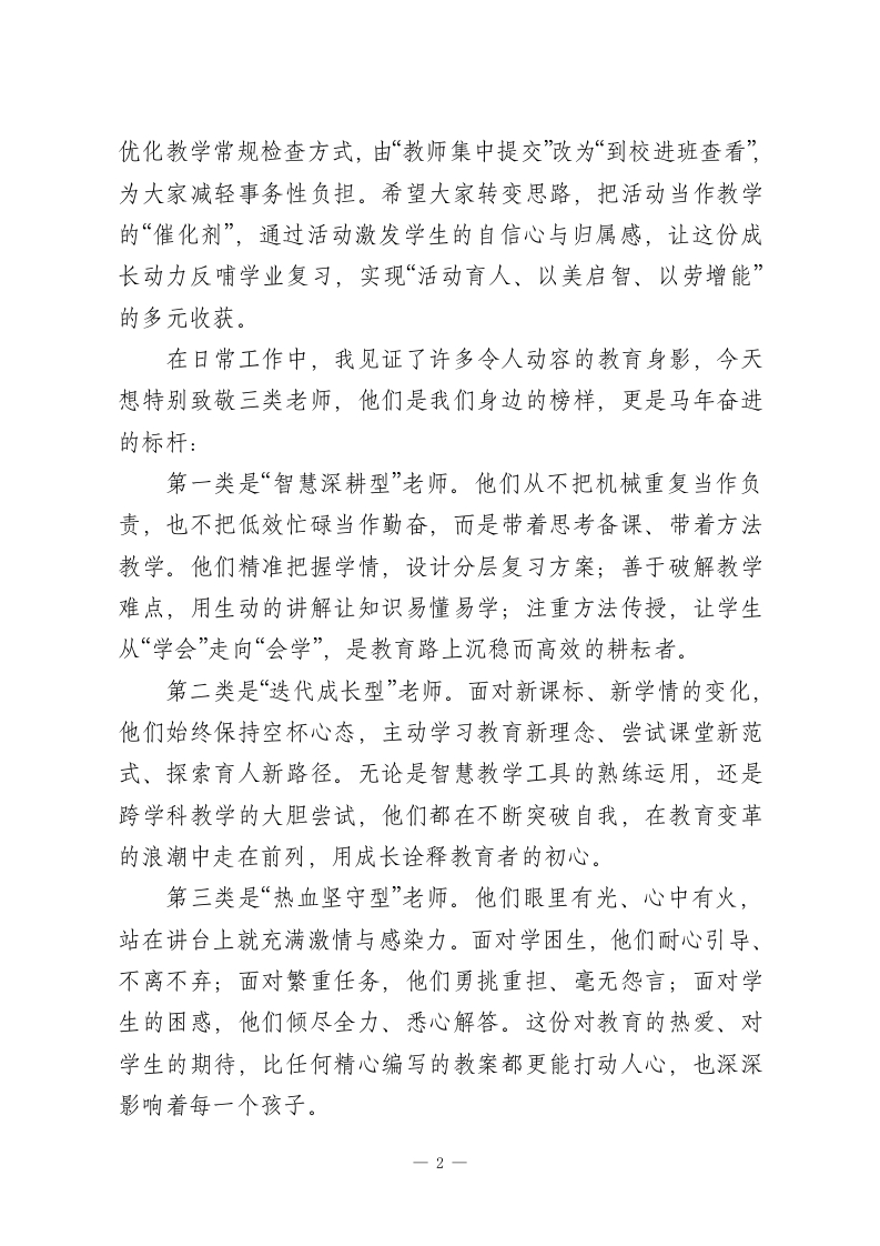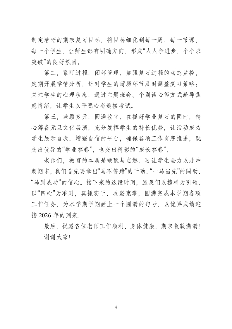 秋季学期末教师动员大会校长讲话:致敬三类教育先锋,守牢四心冲刺期末各位老师:大家下午好!时光荏苒,本学期学期已进入冲刺收官阶段,2026马年的脚步也悄然临近。今天我们召开期未动员大会,既是回望一学期的耕耘与收获,更是凝聚共识、鼓足干劲,全力以赴完成期未教学冲刺与校园文化活动筹备的双重任务。在此,我代表学校,向每一位坚守岗位、辛勤付出的老师,致以最诚挚的感谢与最崇高的敬意!这一学期,大家早出晚归、潜心育人,在三尺讲台上传道授业,在课后辅导中答疑解惑,用专业与爱心陪伴学生成长。当前特殊阶段,我们既要投身紧张的期末复习,为学生的学业收成保驾护航,又要筹备元旦文化展演,为孩子们搭建展现自我的舞台。很多老师两头兼顾,利用课余时间带领学生排练,牺牲休息时间优化复习方案,却毫无怨言。这份对教育的赤诚」对学生的责任,学校看在眼里、记在心里,也让我们对圆满收官充满信心。或许有老师会困惑:期未冲刺任务繁重,还要兼顾活动筹备,如何平衡二者关系?其实,这正是“五育并举”的生动实践,与我校“全面发展、知行合一”的办学理念高度契合。教育的本质是培养有温度、有能力、有担当的人,学业成绩是成长的重要维度,艺术素养、实践能力同样是人生的宝贵财富。学校已1