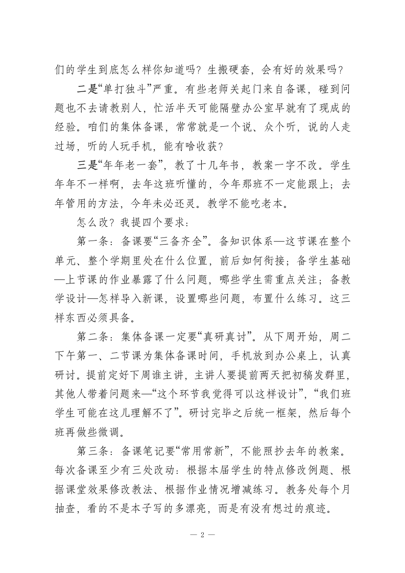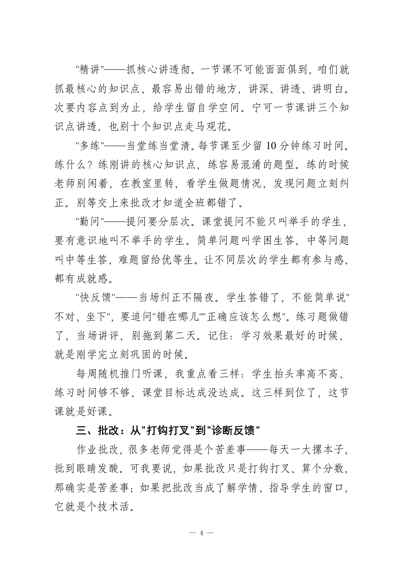 全体教师大会上,副校长讲话:点醒了全校200多名教师!毁掉教学质量的,不是学生,是这7个环节各位同事:大家好!今天开个会,不是为了念文件、走过场,就是想跟大伙儿好好聊聊教学的“基本盘”。最近有个事真是让我感慨万千,就是每次上级来检查的时候,我们的材料总是做得很漂亮;每次公开课我们总是搞得特别热闹。可回到日常,有几堂课是真正让学生听懂了、学会的?有几份作业是认真批改、用心反馈的?这些最朴素的教学工作,反而被我们给忽略了。简单点说,教学质量就相当于盖房子,“备、讲、批、辅、考、评、研”这七个常规就是地基。地基不稳,再漂亮的房子也是危楼。咱们今天把这七个环节掰开揉碎了,说一说怎么个干法。一、备课:从“应付差事”到“真正钻研”先问大家一个问题:上一周的备课,你是花了一两个两三个小时细细琢磨过,还是临时到教室门口十来分钟前翻翻书本找找东西,随便找个课件下载以下就进去了?说实话现在备课有三大问题:第一是拿来主义,网上搜一大把资源下载粘贴打印完事,看似省事实则坑了自己一人家的课件是为人家学生设计的,咱