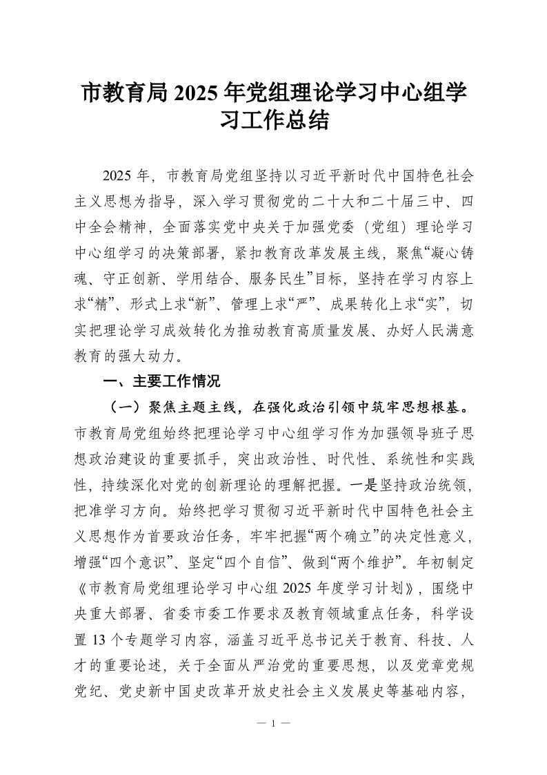 市教育局2025年党组理论学习中心组学习工作总结2025年,市教育局党组坚持以习近平新时代中国特色社会主义思想为指导,深入学习贯彻党的二十大和二十届三中、四中全会精神,全面落实党中央关于加强党委(党组)理论学习中心组学习的决策部署,紧扣教育改革发展主线,聚焦“凝心铸魂、守正创新、学用结合、服务民生”目标,坚持在学习内容上求“精”、形式上求“新”、管理上求“严”、成果转化上求“实”,切实把理论学习成效转化为推动教育高质量发展、办好人民满意教育的强大动力。一、主要工作情况(一)聚焦主题主线,在强化政治引领中筑牢思想根基。市教育局党组始终把理论学习中心组学习作为加强领导班子思想政治建设的重要抓手,突出政治性、时代性、系统性和实践性,持续深化对党的创新理论的理解把握。一是坚持政治统领,把准学习方向。始终把学习贯彻习近平新时代中国特色社会主义思想作为首要政治任务,牢牢把握“两个确立”的决定性意义,增强“四个意识”、坚定“四个自信”、做到“两个维护”。年初制定《市教育局党组理论学习中心组2025年度学习计划》,围绕中央重大部署、省委市委工作要求及教育领域重点任务,科学设置13个专题学习内容,涵盖习近平总书记关于教育、科技、人才的重要论述,关于全面从严治党的重要思想,以及党章党规党纪、党史新中国史改革开放史社会主义发展史等基础内容,1