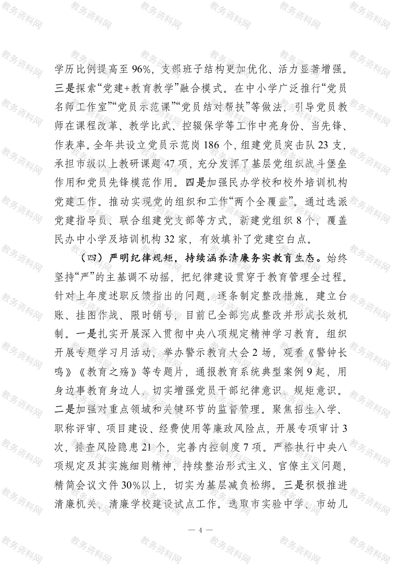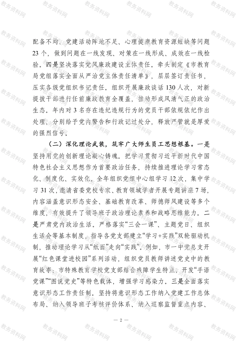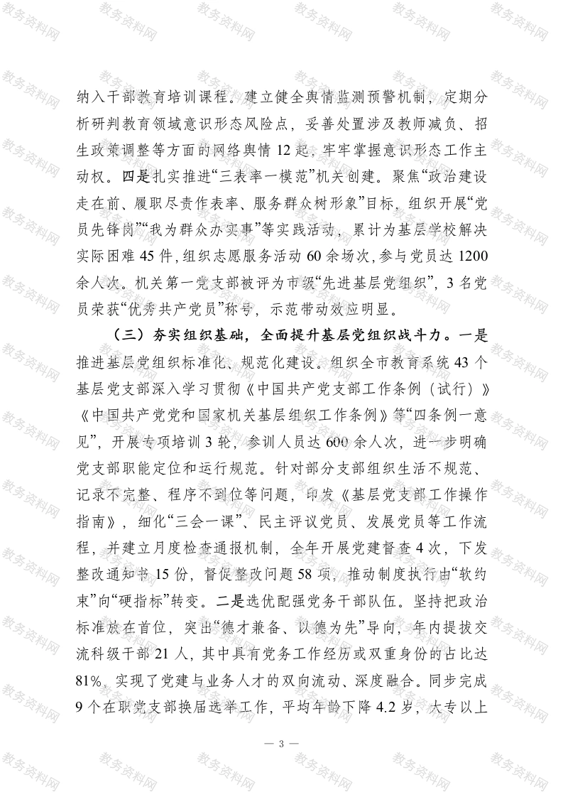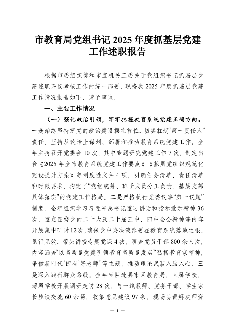 市教育局党组书记2025年度抓基层党建工作述职报告根据市委组织部和市直机关工委关于党组织书记抓基层党建述职评议考核工作的统一部署,现将我2025年度抓基层党建工作情况报告如下,请予审议。一、主要工作情况(一)强化政治引领,牢牢把握教育系统党建正确方向。一是始终坚持把党的政治建设摆在首位。切实扛起“第一责任人”责任,坚持从政治上谋划、部署和推动教育系统党建工作。全年主持召开党委会10次,其中专题研究党建工作7次,制定出台《2025年全市教育系统党建工作要点》《基层党组织规范化建设提升方案》等制度性文件4项,明确任务清单、责任清单和时限要求,构建了“党组统筹、班子成员分工负责、基层支部具体落实”的党建工作格局。二是严格执行党委议事“第一议题”制度。全年组织学习习近平总书记重要讲话和指示批示精神36次,重点围绕党的二十大及二十届三中、四中全会精神等内容开展集中研讨12次,确保党中央决策部署在教育系统落地生根、见行见效。带头讲授专题党课4次,覆盖党员干部800余人次,内容涵盖“以高质量党建引领教育高质量发展“弘扬教育家精神,争做新时代‘四有’好老师”等主题,推动理论武装入脑入心。三是深入践行群众路线。全年带队赴县市区教育局、直属学校、薄弱学校开展调研走访28次,与一线教师、党务干部、学生家长座谈交流60余场,收集意见建议97条,现场协调解决师资1