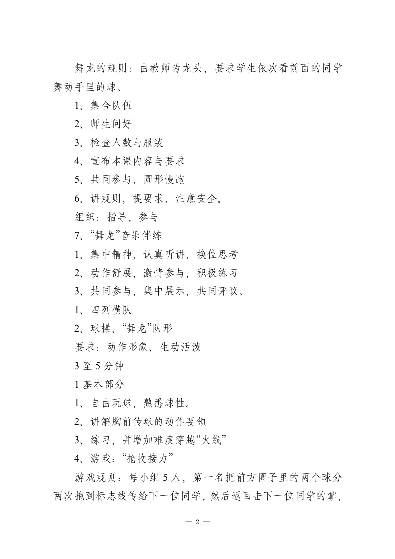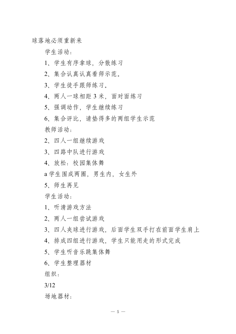 体育课教案小学四年级【优质5篇】体育课教案小学四年级【第一篇】1、认知目标:学习篮球传接球的动作要领和以其相关的知识;体会篮球传接球技术的多样性。2、技能目标:通过各种练习,80%以上的学生学会用正确的手型传接球。发展学生上肢力量及协调、灵敏等身体素质。3、情感目标:学会主动与他人合作,培养集体主义与互学互助的精神。1、小篮球的传球:双手胸前传球2、游戏:抢收接力重点:掌握传接球动作要领与方法难点:正确传接球的手型过程内容教师指导学生活动组织与要求时间次数开始与准备部分1、课堂常规2、准备活动:球操3、小游戏“舞龙”一1