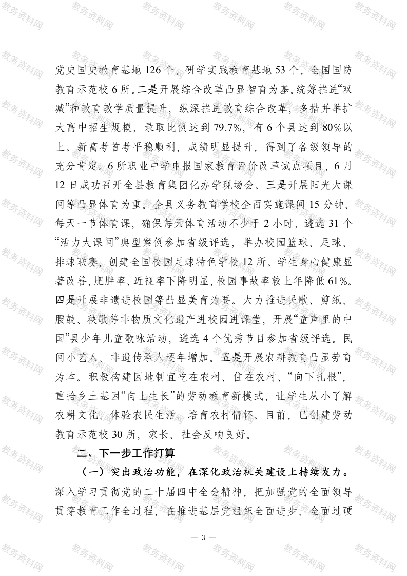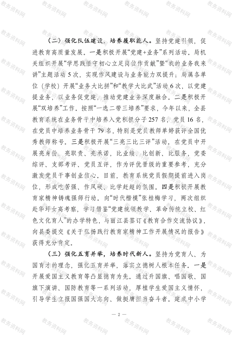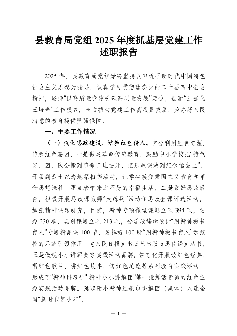 县教育局党组2025年度抓基层党建工作述职报告2025年,县教育局党组始终坚持以习近平新时代中国特色社会主义思想为指导,认真学习贯彻落实党的二十届四中全会精神,坚持“以高质量党建引领高质量发展”定位,创新“三强化三培养”工作模式,全力推动党建工作高质量发展,为办好人民满意的教育提供坚强保障。一、主要工作情况(一)强化思政建设,培养红色传人。充分利用红色资源,传承红色基因。一是做足革命传统教育。鼓励中小学校把“特色班、团、队会搬到革命旧址去开,把思政课放到纪念馆去上”,开展到烈士纪念地祭扫等活动,让学生接受爱国主义教育和革命思想洗礼,更加珍惜来之不易的幸福生活。二是做好思政教育。积极开展思政课教师“大练兵”活动和思政金课评选活动。加强精神课题研究,目前,精神专项微型课题立项394项,结题230项,规划课题立项213项;分学段编辑设计“用精神教书育人”专题精品课100节,发挥好100所“用精神教书育人”示范校的示范引领作用,《人民日报》出版社出版《思政课》丛书。三是做靓小小讲解员等实践活动品牌。常态化开展读红色经典、唱红色歌曲、讲红色故事、访红色足迹等系列教育实践活动,形成了“精神讲习社精神小小讲解团”等一批鲜活新颖的红色主题实践活动品牌。延职附小精神红领巾讲解团(集体)入选全国“新时代好少年”。一1