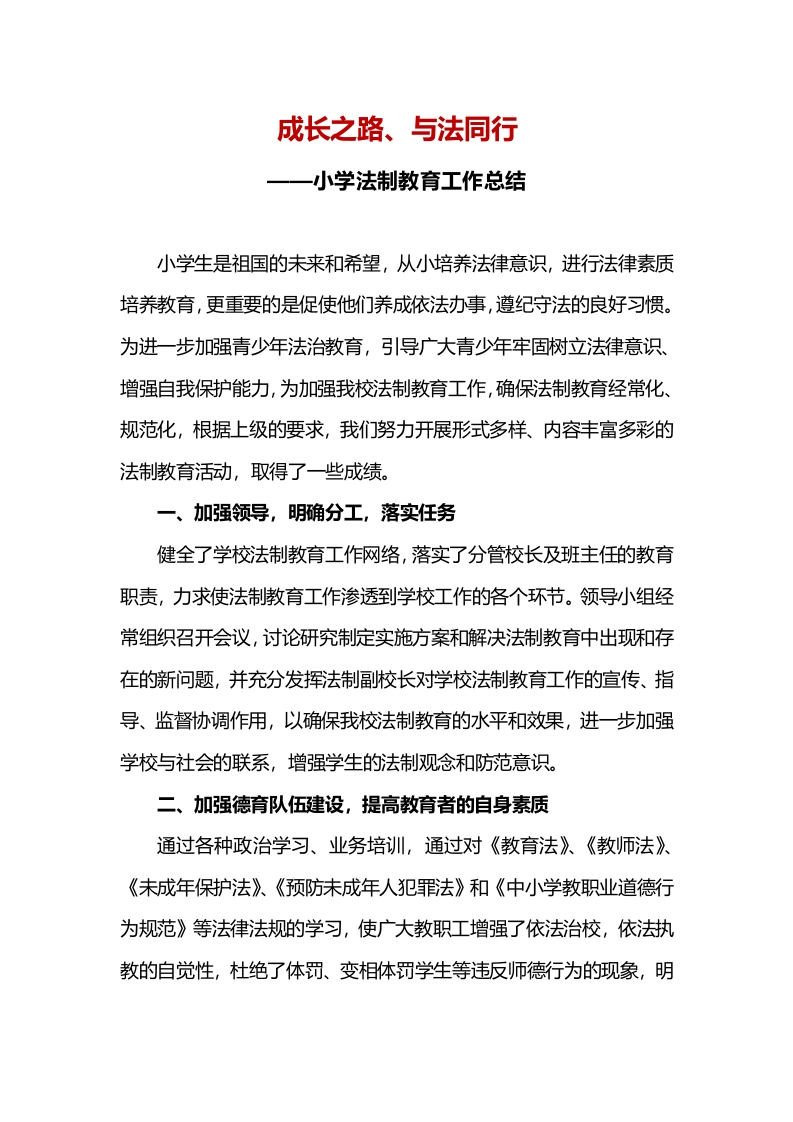 成长之路、与法同行一一小学法制教育工作总结小学生是祖国的未来和希望,从小培养法律意识,进行法律素质培养教育,更重要的是促使他们养成依法办事,遵纪守法的良好习惯。为进一步加强青少年法治教育,引导广大青少年牢固树立法律意识、增强自我保护能力,为加强我校法制教育工作,确保法制教育经常化、规范化,根据上级的要求,我们努力开展形式多样、内容丰富多彩的法制教育活动,取得了一些成绩。一、加强领导,明确分工,落实任务健全了学校法制教育工作网络,落实了分管校长及班主任的教育职责,力求使法制教育工作渗透到学校工作的各个环节。领导小组经常组织召开会议,讨论研究制定实施方案和解决法制教育中出现和存在的新问题,并充分发挥法制副校长对学校法制教育工作的宣传、指导、监督协调作用,以确保我校法制教育的水平和效果,进一步加强学校与社会的联系,增强学生的法制观念和防范意识。二、加强德育队伍建设,提高教育者的自身素质通过各种政治学习、业务培训,通过对《教育法》、《教师法》《未成年保护法》、《预防未成年人犯罪法》和《中小学教职业道德行为规范》等法律法规的学习,使广大教职工增强了依法治校,依法执教的自觉性,杜绝了体罚、变相体罚学生等违反师德行为的现象,明