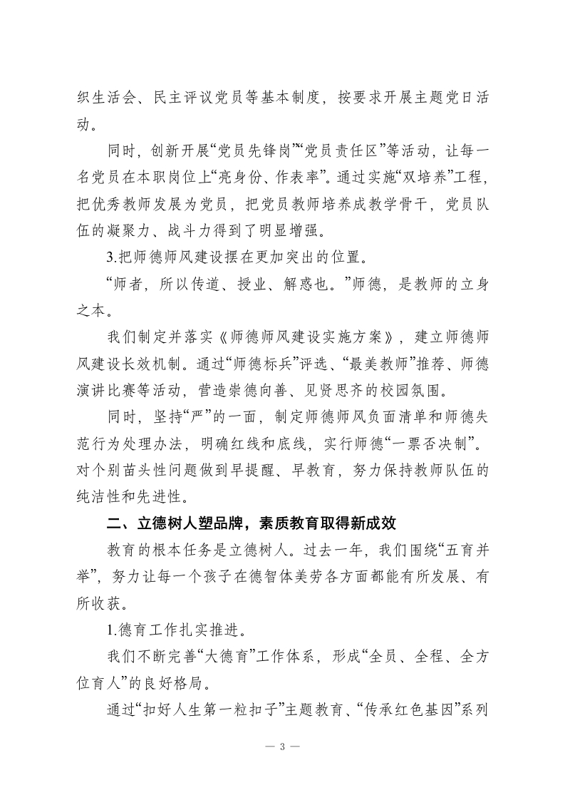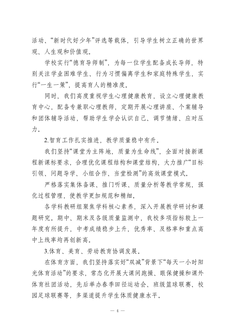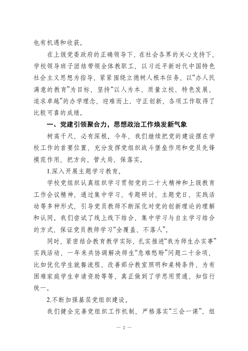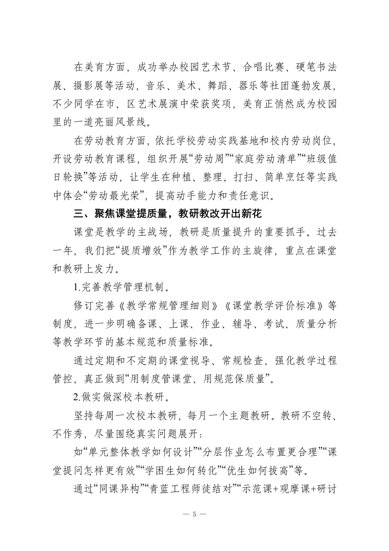 校长在教职工代表大会上汇报讲话:回收2025过往创佳绩,展望2026未来谱新篇各位领导、各位老师:大家下午好!在这样一个生机盎然、充满希望的季节里,我们齐聚一堂召开学校教代会。这既是一场学校民主管理和民主决策的大会,也是一次凝聚人心、共谋发展的重要会议。在这里,我代表学校党政班子,对大会的召开表示热烈的祝贺;对在百忙之中莅临指导的各位领导表示诚挚的感谢;也向一直坚守在教育一线、为学校发展默默付出的全体教师,致以由衷的敬意。有人问:“教代会为什么重要?”我想用一句大家熟悉的诗来回应一“问渠那得清如许?为有源头活水来。”教代会就是学校民主管理的“活水源头”之一。它是教职工参与学校重大决策、表达意见诉求、行使民主权利的重要平台。我们今天坐在这里,不是简单地“过一个程序”,而是要认认真真回顾过去一年的工作成绩与不足,实事求是分析问题,总结经验教训,思考和谋划学校未来的发展方向。这对推动学校高质量发展意义重大。下面,由我向大会作学校工作报告,请各位代表审议。第一部分砥砺奋进结硕果一过去一年的工作回顾过去的一年,可以说是很不平凡的一年:有挑战、有压力,1