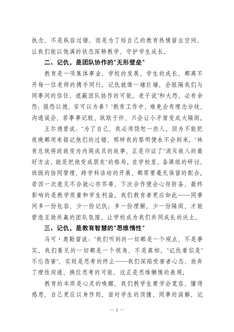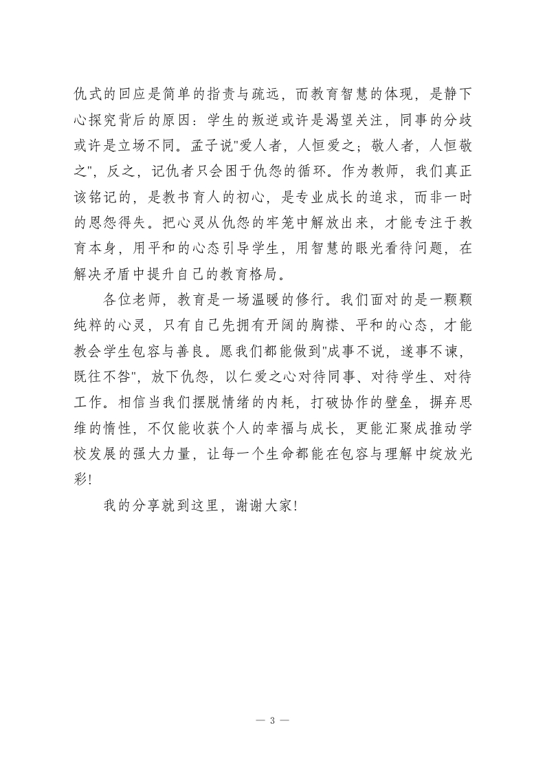 校长在全体教师大会上发言:记仇是昂贵的情绪税各位老师:大家下午好!今天借着全体教师会议的契机,想和大家聊一个看似与教学无关、却实则影响我们职业心态与人生幸福的话题一记仇。曾经有人提到"记仇是昂贵的情绪税",这句话特别值得我们教育工作者深思。作为传道授业解惑的师者,我们的心态不仅关乎自身成长,更会潜移默化影响学生的价值观塑造。下面,我结合自己的思考,和大家分享三点感悟:一、记仇,是教育者的能量内耗尼采曾说:"与怪物战斗的人,应当小心自己不要成为怪物。"我们从事教育工作,每天要面对学生的成长问题、同事间的协作差异、工作中的各种挑战。如果总把他人的过错、无意的冒犯记在心里,本质上就是把宝贵的心力抵押给了过往的不快。古罗马哲人塞涅卡说"愤怒是短暂的疯狂,而仇恨则是漫长的自我囚禁"。各位老师,我们的时间和精力何其宝贵一本该用于钻研教学、关爱学生、自我提升的心力,若消耗在记仇上,不仅会搅乱自己的情绪,更会影响教学状态。试想,当我们带着对他人的芥蒂走进课堂,面对学生的小过失可能失去耐心,打磨教案时难以沉心静气,甚至会在不经意间将负面情绪传递给学生。美国心灵作家玛丽安·威廉森说得好:"你不原谅,并非因为对方伤害太深,而是因为你把那段记忆抓得太紧。"放下1