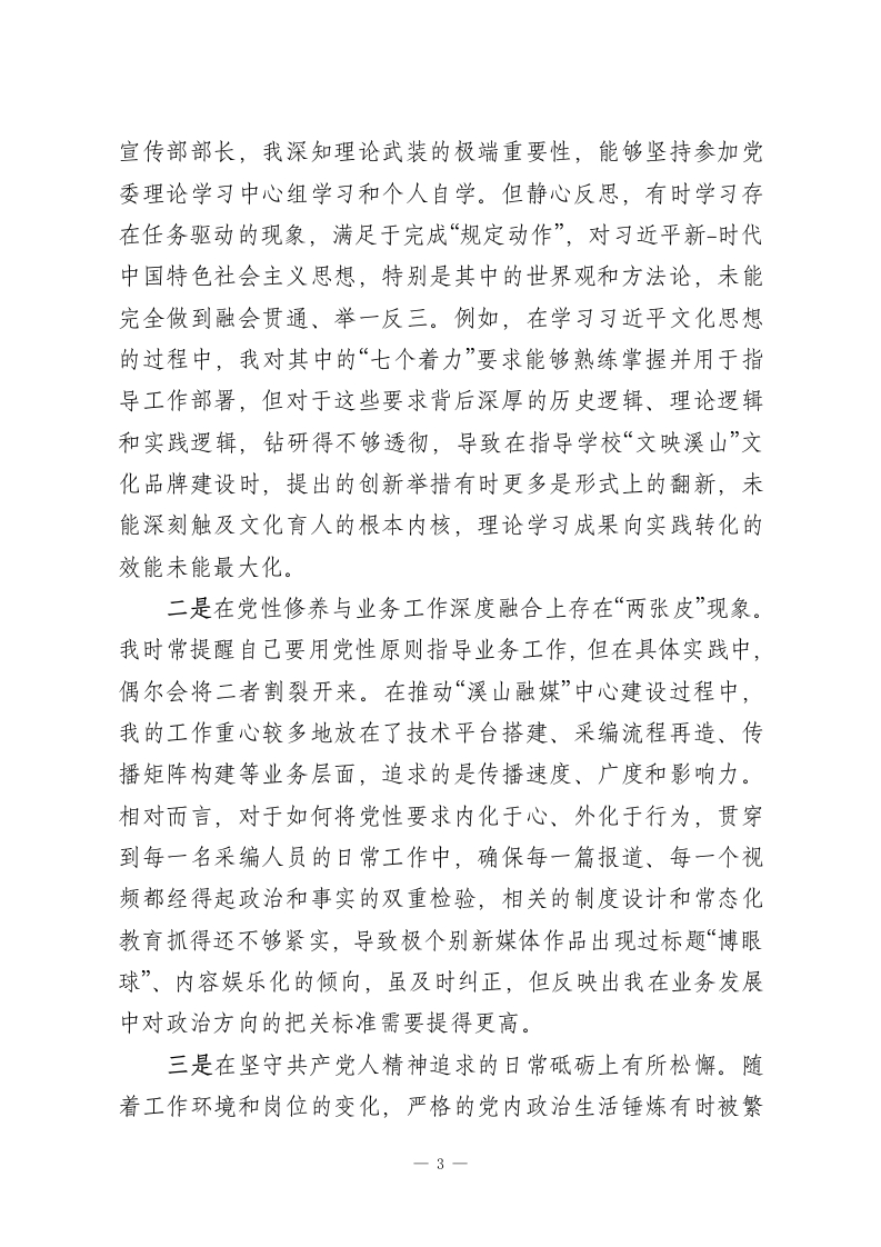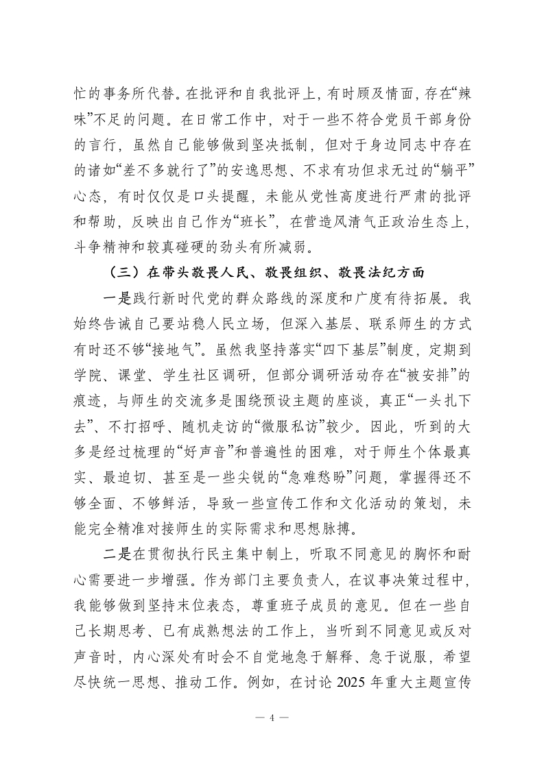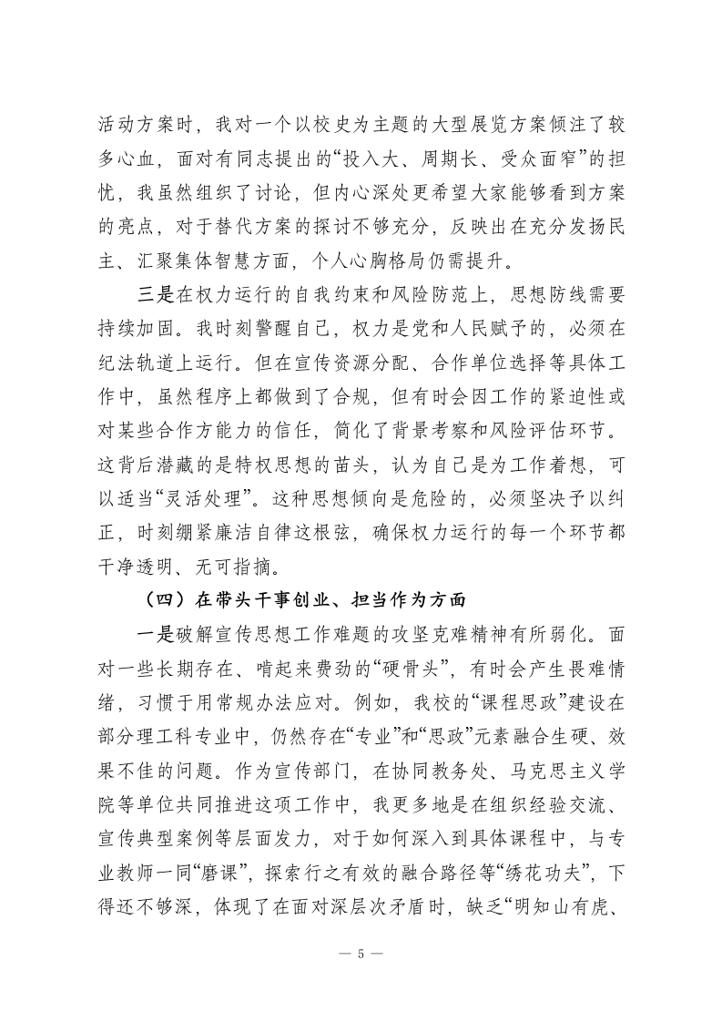 学校2025年度民主生活会个人对照检查(结合宜传工作)根据校党委关于召开2025年度民主生活会的统一部署和要求,我紧扣本次民主生活会主题,在深入学习领会习近平新时代中国特色社会主义思想、党的二十届三中、四中全会精神,以及习近平总书记重要讲话和重要指示批示精神的基础上,我认真回顾和总结了一年来的思想、工作与作风情况。通过广泛征求意见、深入谈心谈话,我把自己摆进去、把职责摆进去、把工作摆进去,对照5个方面要求,深刻查摆了自身存在的问题,剖析了问题产生的根源,并明确了今后的努力方向和整改措施。现将个人对照检查情况报告如下。一、存在的主要问题(一)在带头强化政治忠诚、提高政治能力方面一是在将政治判断力、政治领悟力、政治执行力贯穿宣传思想工作全过程的敏锐性和穿透力上仍有不足。我深刻认识到,宣传思想工作本质上是政治工作,必须旗帜鲜明讲政治。但在实际工作中,偶尔存在就业务抓业务的惯性思维。例如,在2025年初策划全年宣传工作要点时,我最初的思考更多集中在如何提升学校新闻的“上稿率”、如何打造更具吸引力的校园文化活动品牌等具体指标上,对于如何将党的二十届四中全会提出的关于完善党的自我革命制度规范体系等重大理论创新,更深层次、体系化地融入理论宣讲和校园文化建设的顶层设计中,思考得不够深邃,未能第一时间形成系统性的宣传阐释方案,导1