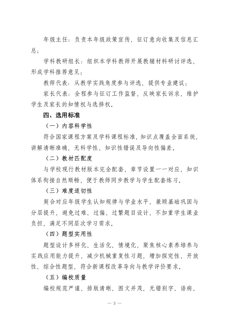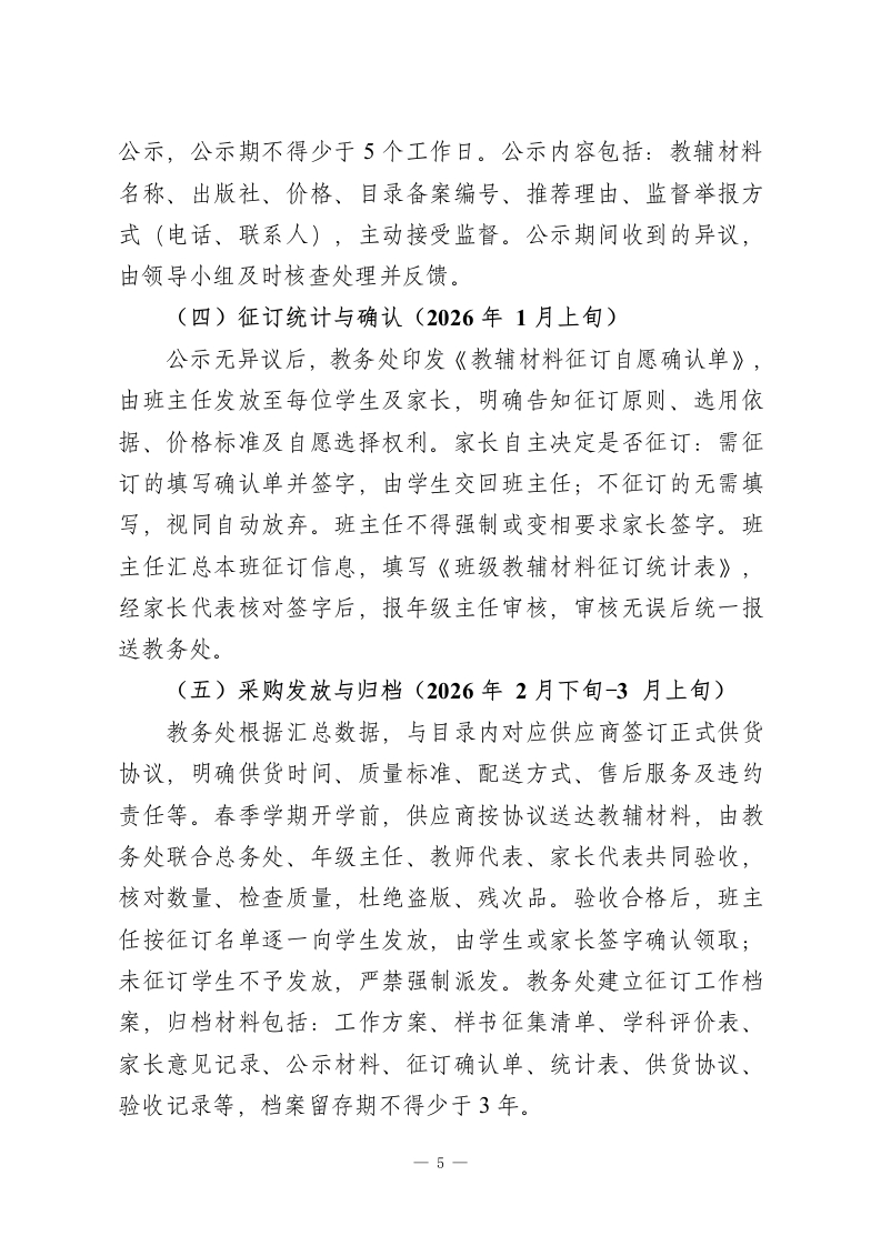 学校2026年春季学期教辅材料征订管理工作方案(2026年修订版)为进一步规范教辅材料选用与征订管理流程,深度落实“双减”政策精神,严格执行“一科一辅”管理规定,切实减轻学生课业负担与家长经济压力,保障教辅材料选用质量,维护学生及家长合法权益,依据相关教育法规及省级教育行政部门要求,结合学校办学实际,特制定本方案。一、总体要求以立德树人为根本遵循,以服务教学为核心宗旨,以规范管理为重要保障,严格从省级教育行政部门审定公布的中小学教辅材料目录中选用产品,建立健全“评选一公示一征订一发放”全流程闭环管理机制,实现选用程序规范化、评选标准科学化、征订过程透明化、监督机制健全化,确保为学生提供内容优质、难度适配、价格合规的教辅材料。二、基本原则(一)依规选用严格对照省级教育行政部门公布的中小学教辅材料目录选用产品,严禁选用目录外任何教辅材料。坚守“一科一辅”底线,每个学科、每个年级仅可选用1种与教材配套的同步练习类教辅材料,不得以任何名义突破数量限制。(二)自愿订购坚持学生及家长自愿征订原则,由其自主决定是否订购。学校及教职工不得以任何形式强制、变相强制学生及家长订购1