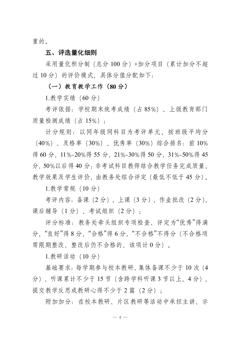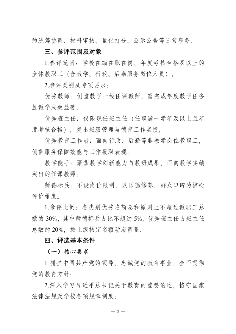 学校2026年度评模评优工作实施方案(试行)为深入贯彻党的教育方针,全面落实立德树人根本任务,持续加强师资队伍建设,激发全体教职工干事创业的内生动力,营造“崇尚先进、学习先进、争当先进”的浓厚氛围,根据上级教育主管部门相关文件精神,结合学校发展实际,经党支部委员会、校委会集体研究,并广泛征求教职工代表意见,特制定本实施方案。一、指导思想以习近平新时代中国特色社会主义思想为指导,全面贯彻落实师德师风建设核心要求,通过评模评优树立教育教学标杆,发挥先进典型的示范引领作用,激励全体教职工恪守教育初心、潜心教书育人、勇于担当作为,稳步提升学校教育教学质量,奋力办好人民满意的教育。二、组织机构为保障评模评优工作规范有序开展,成立中心小学评模评优工作领导小组:组长:校长副组长:党支部书记、副校长成员:教务处主任、德育处主任、总务处主任、工会主席、各年级组长、教研组长及教代会推选的教师代表(5-7名,实行年度轮换制)领导小组下设办公室(挂靠教务处),负责评模评优工作-1