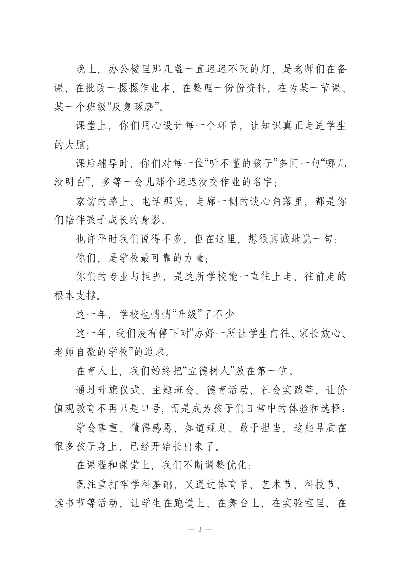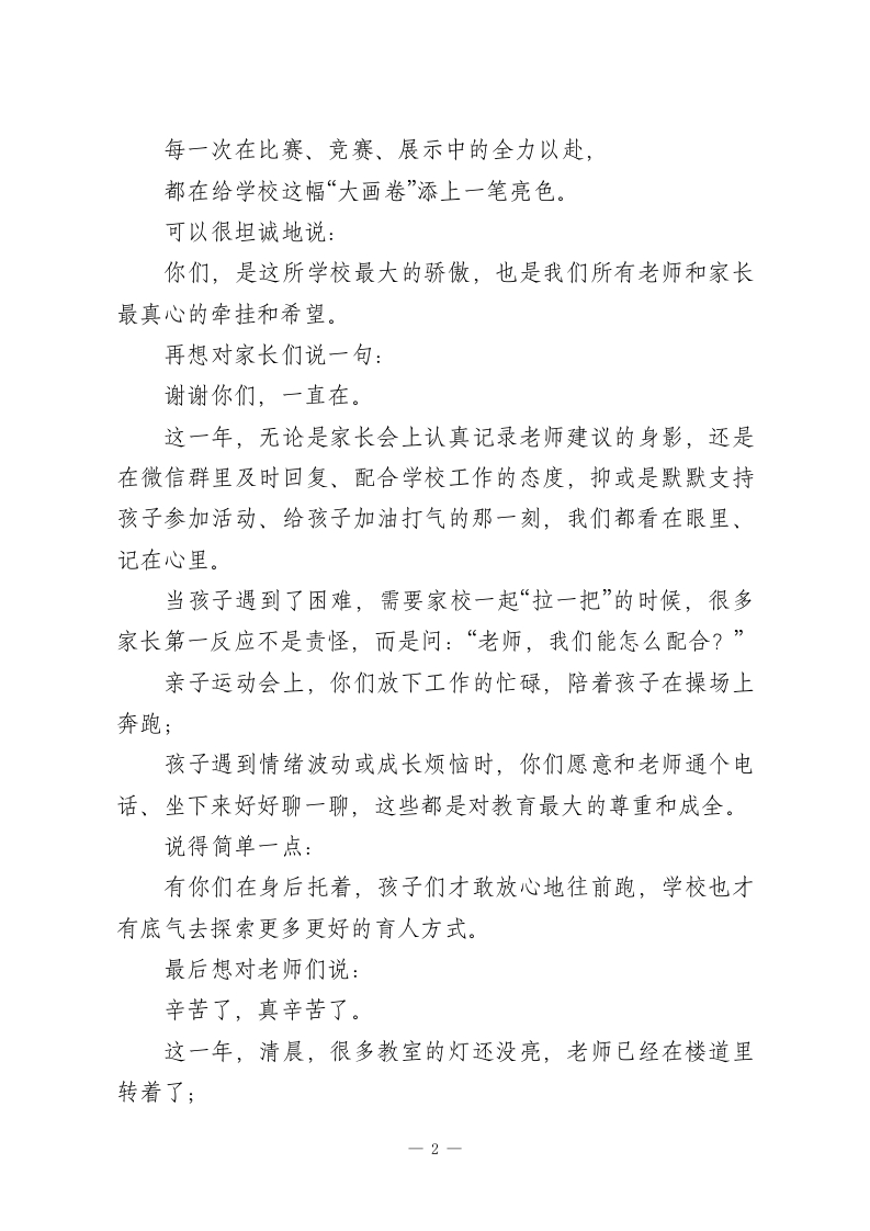学校2026元旦新年贺词:骏马扬鬃启新程,丹心筑梦耀华章亲爱的同学们、家长们、老师们:大家好!再过不久,新年的钟声就要敲响了。2025年,悄悄地翻到了最后一页。站在这里,我心里是有一点感慨的。这一年,我们一起走过的路,说长不长,说短也不短,酸甜苦辣都有,但回头看一看,更多的是暖,是成长,是收获。在这个辞旧迎新的时刻,我谨代表学校,向一直信任、配合学校的各位家长,向努力学习、不断进步的同学们,向默默坚守在岗位上的每一位老师,送上诚挚的新年问候和衷心的祝福:新的一年,愿大家平安顺遂、心想事成。这一年,我们一起走过的每一步,都值得记一记先想对同学们说一句:你们真的很棒。这一年,你们在课堂上专注听讲、勇敢举手发言,那些认真思考的眼睛、那些“我来试试”的举手瞬间,都是校园里最明亮的风景。课后,图书馆里的埋头阅读、自习课上的安静演算、社团里的投入练习,这些看似平凡的时刻,正在一点一滴地塑造你们的样子。每一次攻克一道难题后的“原来我也可以”,每一次在活动中突破自已的“小胆怯”,1