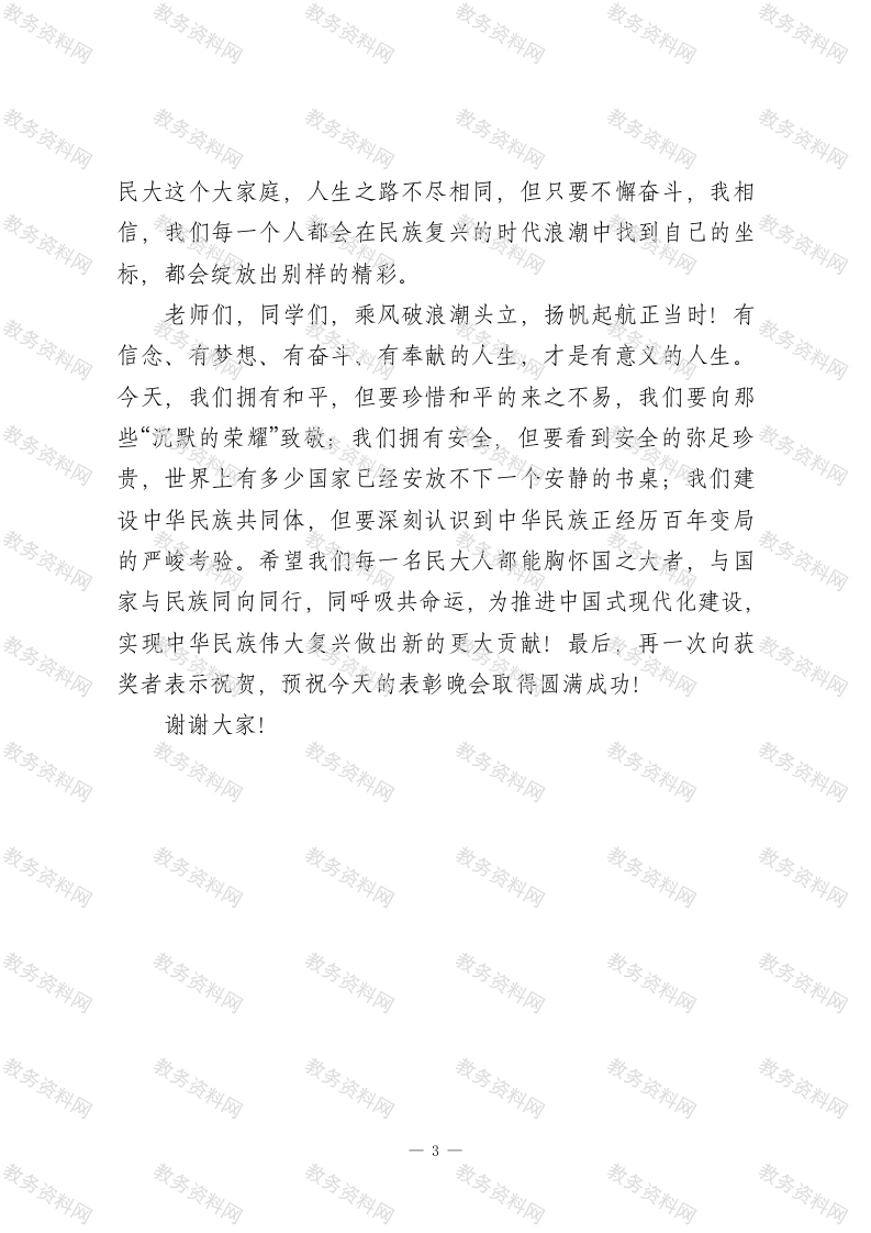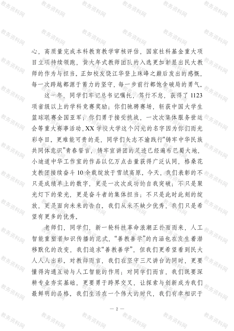 在“石榴花开榜样领航”XX学校2025年优秀学生表彰晚会上的讲话尊敬的各位来宾,老师们、同学们,家长朋友们大家晚上好!在这岁序交替、盘点收获的时节,我们齐聚一堂,以“石榴花开榜样领航”之名举行XX学校2025年优秀学生表彰晚会,共同回望这一年各族师生与祖国同频、与民大共进的成长足迹。首先,我代表学校,向所有获奖的集体和个人致以最热烈的祝贺!向辛勤付出的各位教职工、向心系母校的各位校友以及关心学校发展的社会各界朋友,致以最诚挚的感谢!这一年,我们与祖国同行,一起迎来了中国人民抗日战争暨世界反法西斯战争胜利80周年,一起见证了党的二十届四中全会胜利召开,共同开启了教育强国建设新征程。面对“教育强国、民大何为”“落实铸牢主线、民大何为”的时代命题,我们锚定目标,攻坚克难,统筹推进体制机制改革,确立了“一条主线贯穿、两个高地赋能、三项改革驱动、七大篇章奋进”的发展思路,用奋进之笔书写了学校第十二次党代会的壮美篇章。这一年,我们加快推进学科专业优化调整,大力发展理工农医教育类学科专业,获批中华民族共同体学交叉学科建设试点。这一年,我们持续加大学科专业平台建设,获批习近平文化思想协同创新研究基地,完成畜牧省级重点实验室优化重组,若尔盖野外观测站入选生态环保部野外观测站。这一年,全校上下一1