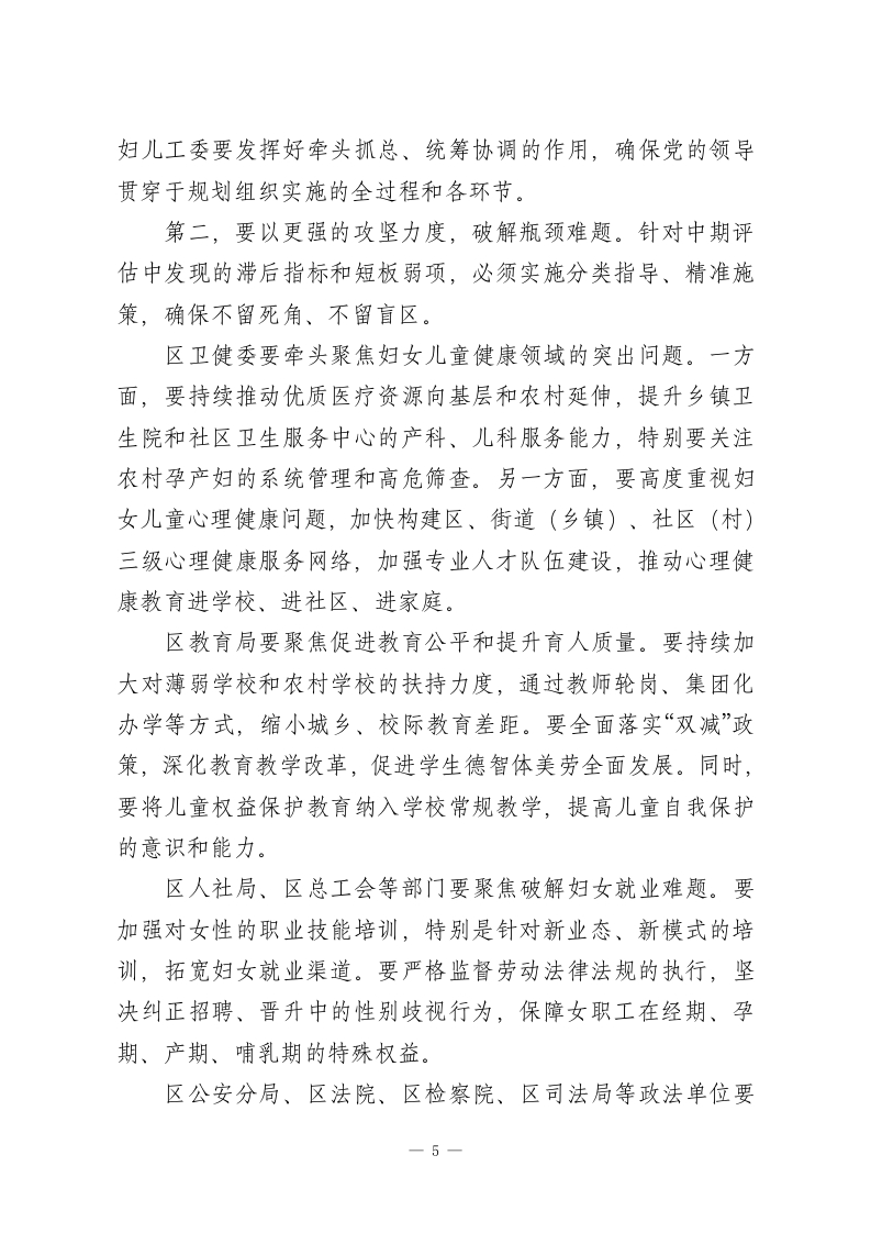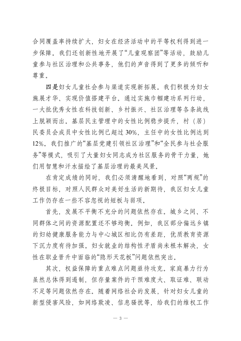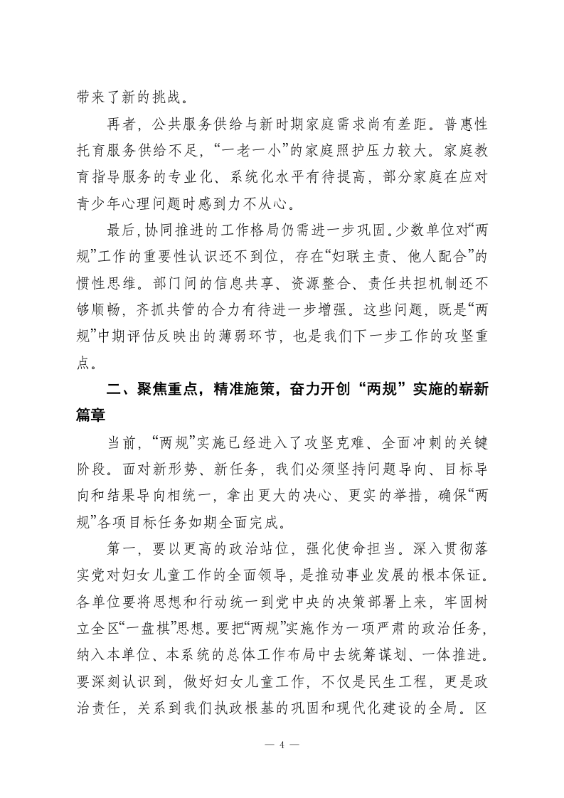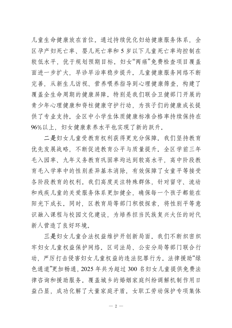 在XX区2025年度妇女儿童工作暨“两规”工作推进会议上的讲话同志们:今天,我们在这里召开全区2025年度妇女儿童工作暨“两规”工作推进会议,主要任务是深入学习贯彻党中央最新会议精神及相关国际会议精神,总结回顾本年度我区妇女儿童工作取得的成绩,分析研判当前面临的形势与挑战,并对下一阶段全面推进《XX区妇女发展规划》和《XX区儿童发展规划》的重点任务进行再动员、再部署。刚才,区教育局、区统计局、区卫健委、区妇联的负责同志分别作了很好的发言,总结了工作,分析了问题,也提出了思路,听了很受启发。妇女儿童事业是党和国家事业的重要组成部分,关系到家庭的幸福安宁、社会的和谐稳定和国家的长远发展。过去一年,在区委、区政府的坚强领导下,在各成员单位的共同努力和社会各界的广泛参与下,我区妇女儿童工作取得了显著成效,“两规”实施稳步推进,广大妇女儿童的获得感、幸福感、安全感持续增强。下面,我讲三点意见。一、肯定成绩,正视差距,清醒认识新时代妇女儿童工作的历史方位2025年是实施新“两规”承上启下的关键之年。一年来,全区上下协同发力,围绕“两规”确定的各项目标任务,真抓实干,推动妇女儿童事业发展迈上了新台阶。一是妇女儿童健康水平得到新提升。我们始终将保障妇女1
