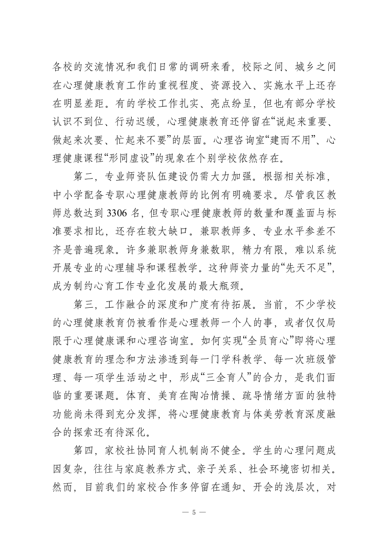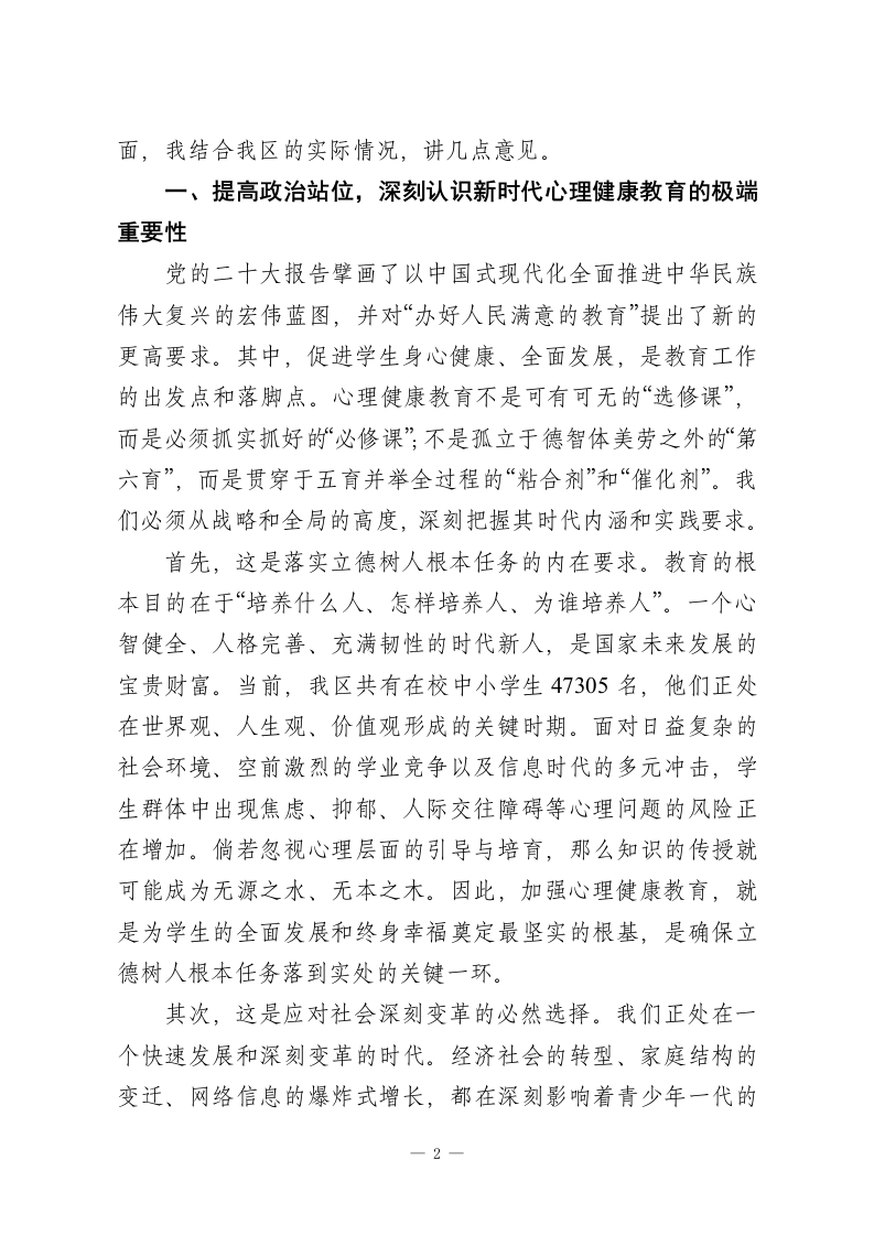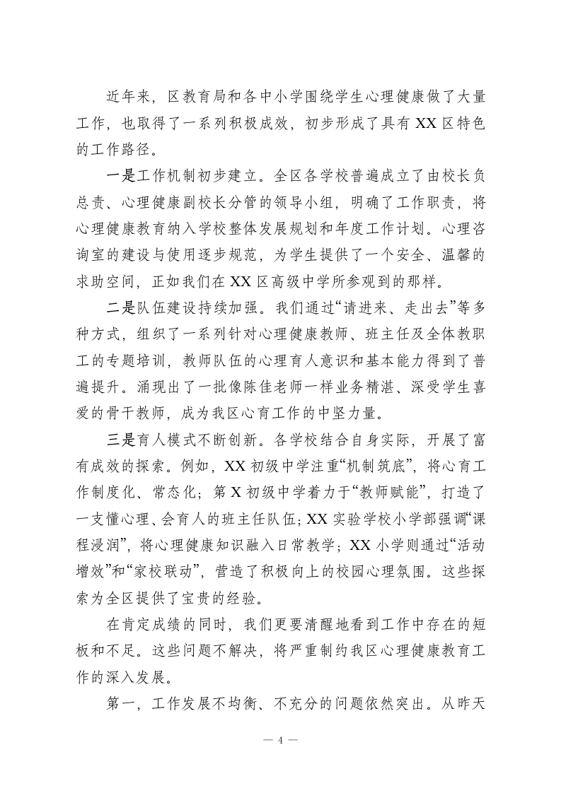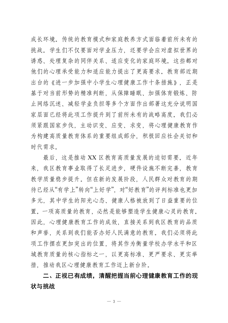 在XX区中小学心理健康教育工作推进会上的讲话同志们:今天,我们在这里召开全区中小学心理健康教育工作推进会,主要任务是深入学习领会并贯彻落实教育部《进一步加强中小学生心理健康工作十条措施》的核心精神总结前一阶段的工作,分析当前面临的形势与挑战,并对下一阶段的工作进行系统部署,旨在切实筑牢我区广大中小学生的心理健康防线,为他们的茁壮成长保驾护航。昨天下午,我们组织了现场观摩和经验交流活动。XX区高级中学的X老师以《学会正确归因》为题,为我们呈现了一堂高水平的心理健康公开课,充分展示了新时代心理教师的专业素养与教学智慧。随后,XX初级中学、第X初级中学、XX实验学校小学部、XX小学的负责同志分别从不同维度分享了各自学校的宝贵经验,内容涵盖机制建设、教师赋能、课程浸润、家校协同等多个方面,为我们全面推进此项工作提供了极具价值的实践范本。这些成果的取得,离不开在座各位以及全区广大教育工作者的辛勤付出。在此,我代表区教育局,向长期以来奋战在心育工作第一线的同志们,表示衷心的感谢和崇高的敬意!学生心理健康是立德树人的重要基础,事关每一个家庭的幸福安宁,更关系到国家的发展和民族的未来。召开此次会议,既是一次工作部署会,更是一次思想统一会、责任压实会。下一1