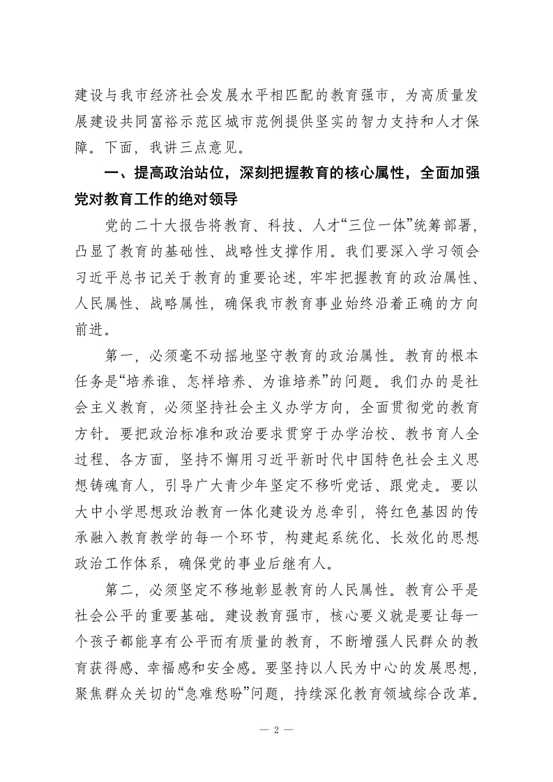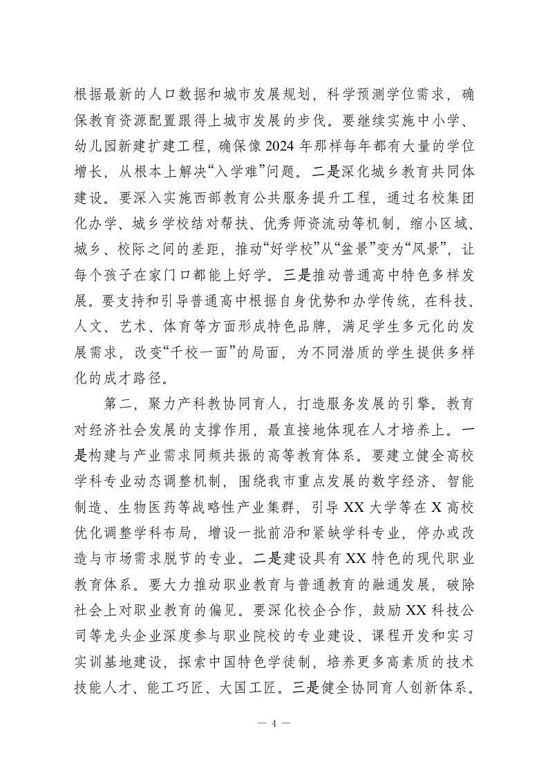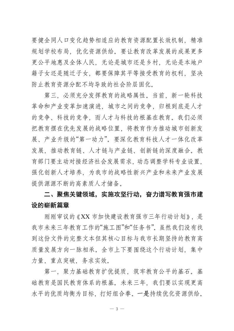 在XX市委教育工作领导小组会议上的讲话同志们:今天我们召开市委教育工作领导小组会议,主要任务是深入学习贯彻习近平总书记关于教育的重要论述,审议《XX市加快建设教育强市三年行动计划》和《XX市推进中小学“人工智能+教育”实施方案》这两个重要文件,研究部署下一阶段全市教育工作。刚才,相关部门汇报了两份文件的起草情况,同志们进行了认真讨论,提出了很好的意见建议。今年以来,全市教育系统紧扣中央和省委的部署要求,各项工作取得了显著成效。我们欣喜地看到,教育公共服务水平不断提高,教育改革创新探索更加深入,高等教育事业持续进步,教育管理水平稳步提升,全市教育事业总体呈现出稳中有进、高质量发展的良好态势。特别是2024年,全市新建了96所中小学和幼儿园,新增学位达到10.1万个,有效缓解了部分区域的入学压力。这些成绩的取得,是全市上下共同努力、特别是广大教育工作者辛勤付出的结果。在此,我代表市委、市政府,向大家表示衷心的感谢!在肯定成绩的同时,我们更要清醒地认识到,对标新时代新征程的使命要求,对标人民群众对“上好学”的殷切期盼,我市教育工作仍面临诸多挑战。教育是国之大计、党之大计,事关国家发展、事关民族未来。我们必须站在为党育人、为国育才的政治高度,以更大的决心和魄力,加快推进教育现代化,1