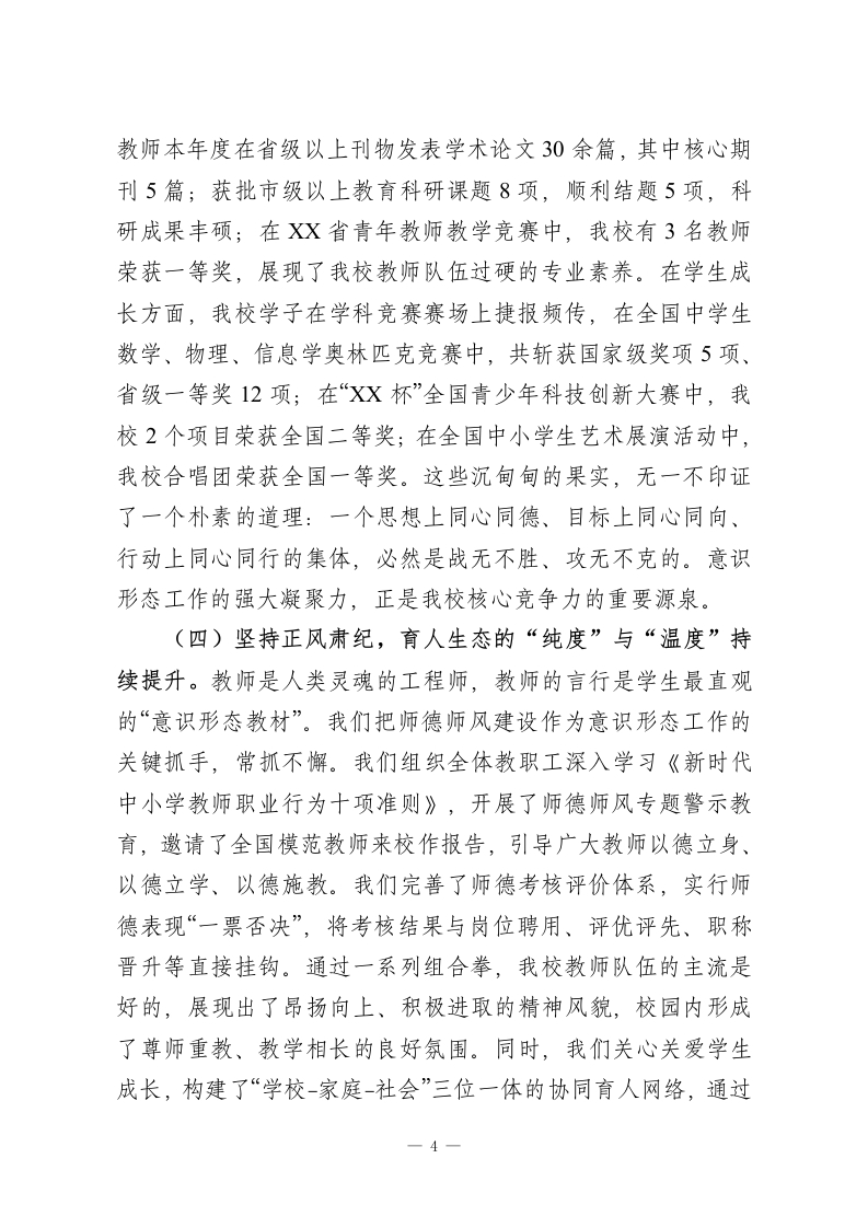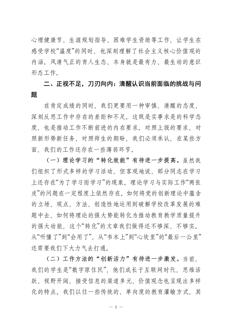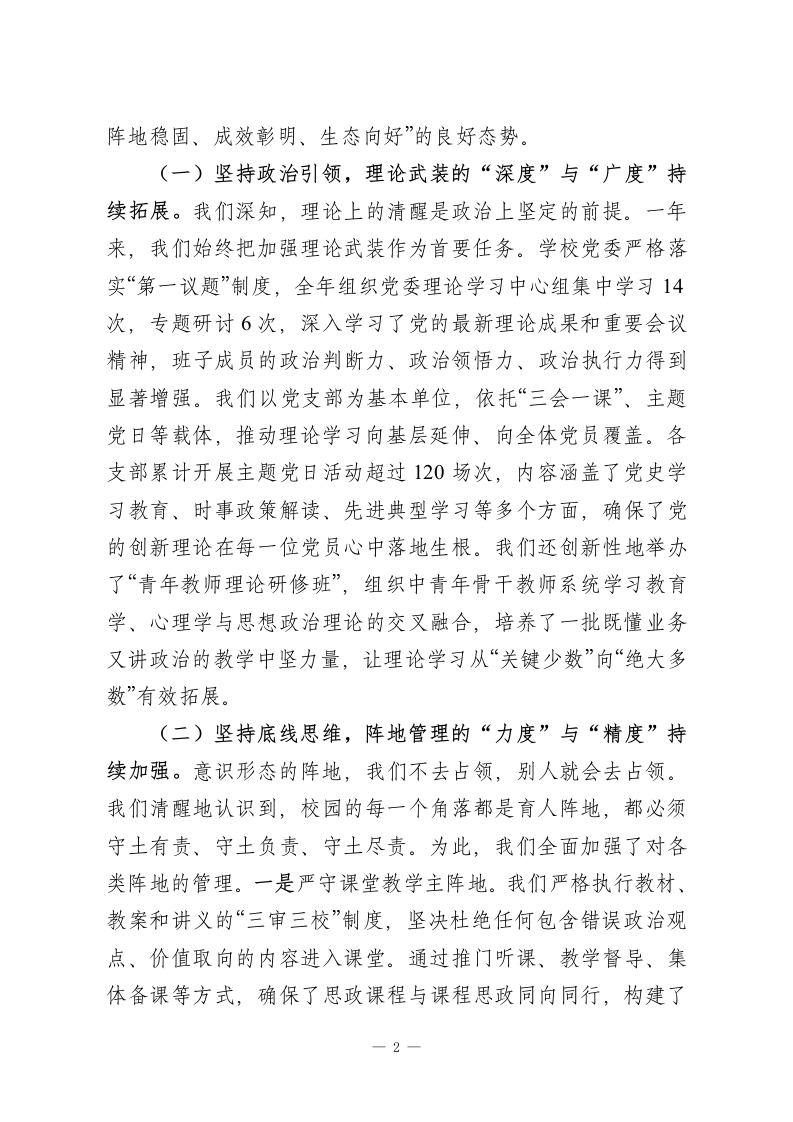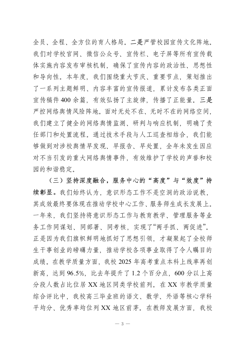 在XX县XX中学党委意识形态工作总结会上的讲话同志们:今天,我们在这里召开2025年度学校党委意识形态工作总结会,主要任务是深入学习贯彻上级关于意识形态工作的重要指示精神,全面总结我们过去一年的工作,深刻分析当前面临的形势与挑战,并对下一阶段的重点任务进行研究和部署。这次会议,既是一次回顾盘点、总结经验的“复盘会”,更是一次认清形势、明确方向、凝聚共识的“动员会”。刚才,我们共同学习了上级最新的文件精神,各分管领导和部门也汇报了相关情况,讲得都很好,很全面,我完全同意。下面,我结合学校的整体工作,再讲三点意见。一、守正创新,凝心聚力:2025年意识形态工作回顾与总结意识形态工作是党的一项极端重要的工作,关乎旗帜、关乎道路、关乎国家政治安全。对学校而言,意识形态工作就是我们立德树人的“生命线”,是我们为党育人、为国育才的“方向盘”和“压舱石”。回首2025年,我们身处百年未有之大变局加速演进、思想文化领域交流交融交锋日趋复杂的时代背景下,学校党委始终坚持以新时代中国特色社会主义思想为指导,将意识形态工作摆在战略高度,牢牢掌握工作的领导权、管理权、话语权,为学校各项事业的高质量发展提供了坚强的思想保证和强大的精神动力。总的来看,我们的工作呈现出“基础扎实、1