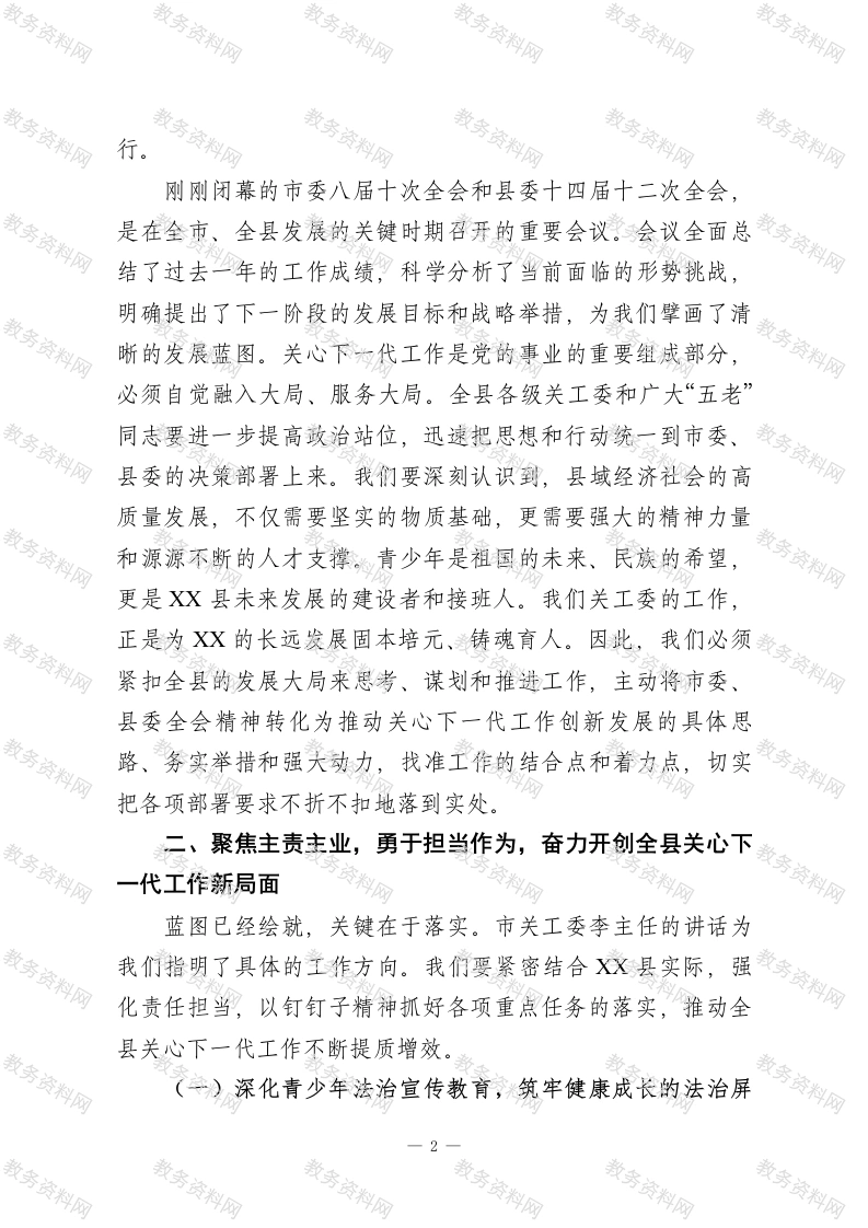 在XX县关心下一代工作委员会专题会议上的讲话同志们:今天,我们在这里召开县关工委专题会议,主要任务是深入学习领会习近平总书记近期重要讲话精神,全面传达贯彻市委、县委全会精神以及市关工委的工作部署,并结合我县实际,就当前和今后一个时期全县关心下一代工作的重点任务进行安排部署。刚才,我们已经集中学习了相关文件和会议精神,相信大家对我们肩负的时代使命和工作方向有了更加清晰、更加深刻的认识。下面,我讲几点意见。一、提高政治站位,深刻领会精神实质,切实把思想和行动统一到市委县委决策部署上来思想是行动的先导。做好新时代关心下一代工作,首要的就是要用党的创新理论武装头脑、指导实践。近期,习近平总书记就未成年人思想道德建设发表了一系列重要讲话、作出一系列重要指示。这些重要论述高屋建瓴、内涵深邃,深刻阐明了关心下一代工作的重大意义、目标任务和实践要求,具有极强的政治性、思想性和指导性,是我们做好一切工作的根本遵循和行动指南。全县各级关工委组织必须把学习贯彻习近平总书记重要指示精神作为当前和今后一个时期的首要政治任务,要原原本本学、逐字逐句悟,深刻领会其核心要义和精神实质,确保我们的工作始终沿着总书记指引的正确政治方向稳步前1