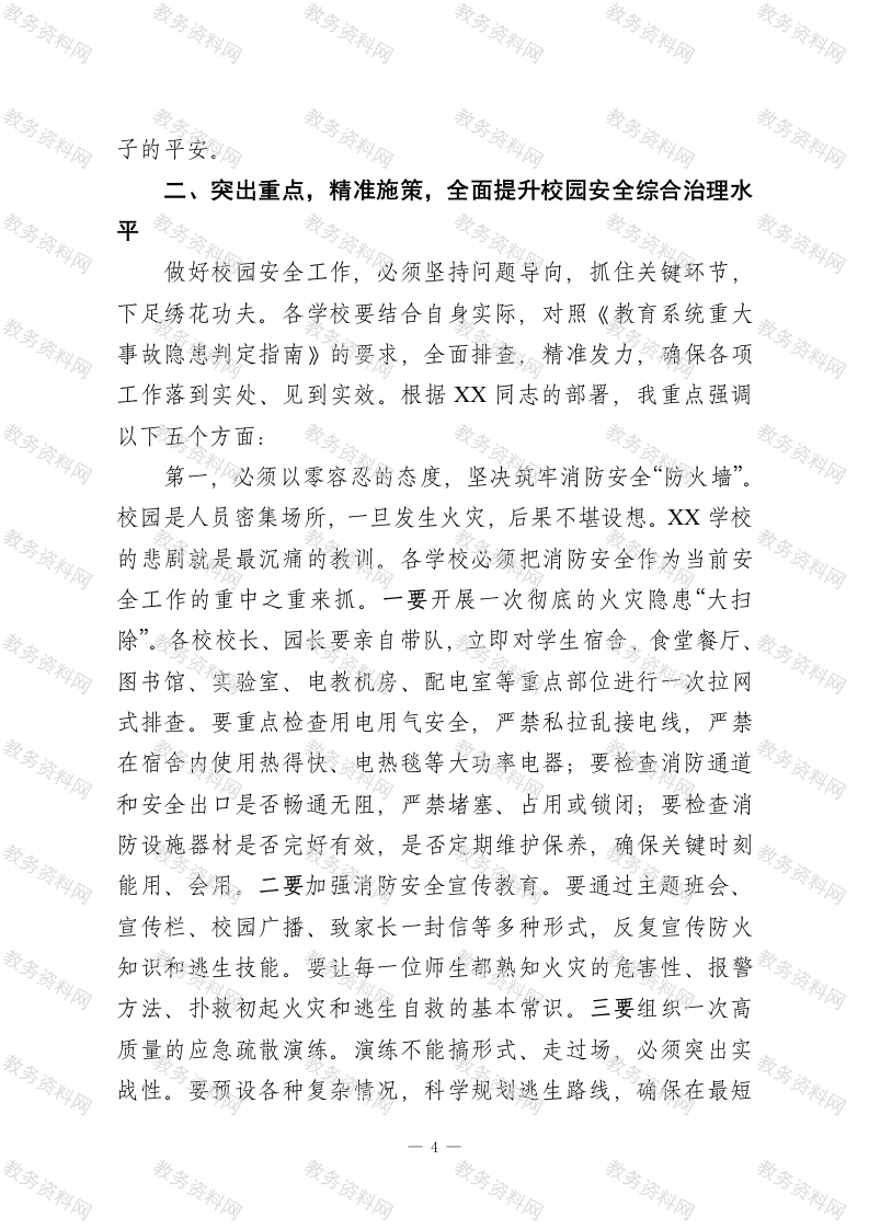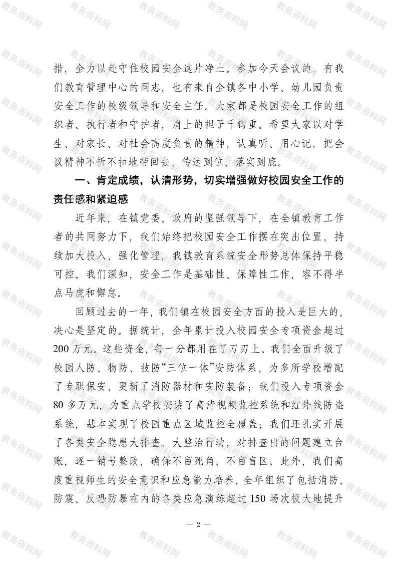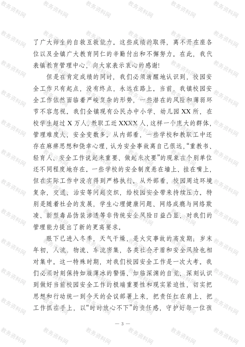 在XX镇教育系统校园安全工作会议上的讲话同志们:今天,我们在这里召开全镇教育系统校园安全工作会议,主要任务是深入学习贯彻上级关于安全生产工作的重要指示精神,深刻吸取近期国内一些地区发生的安全事故教训,分析研判当前我镇校园安全面临的形势,安排部署今冬明春及下一阶段的校园安全重点工作。刚才,XX同志结合我镇实际,从五个方面对当前的安全形势作了分析,并对具体工作作了部署,讲得很具体,很到位,我完全同意,希望大家认真领会,抓好落实。下面,我再强调三点意见。安全是教育事业发展的底线,更是不可逾越的红线。校园安全工作,责任重于泰山,它关系到千家万户的幸福安宁,关系到社会的和谐稳定,更关系到我们每一个孩子的健康成长。就在今年1月19日,XX省XX市XX县一所学校的学生宿舍发生重大火灾事故,13名年幼的生命戛然而止,令人痛心疾首。这一事件连同今年以来在XX、XX等地发生的多起校园安全事故以血的代价再次为我们敲响了警钟。这些触目惊心的画面和数字,深刻诠释了“人民至上、生命至上”的价值核心,也向我们每一位教育工作者发出了最严厉的拷问:我们的安全防线是否坚固?我们的责任是否已经压实?我们的工作是否还有疏漏?今天我们召开这个会议,就是要统一思想、凝聚共识、明确任务,就是要以最坚决的态度、最严格的要求、最扎实的举1