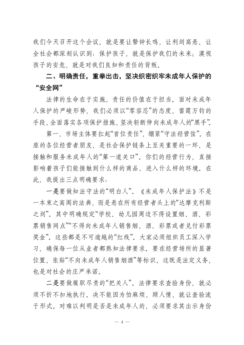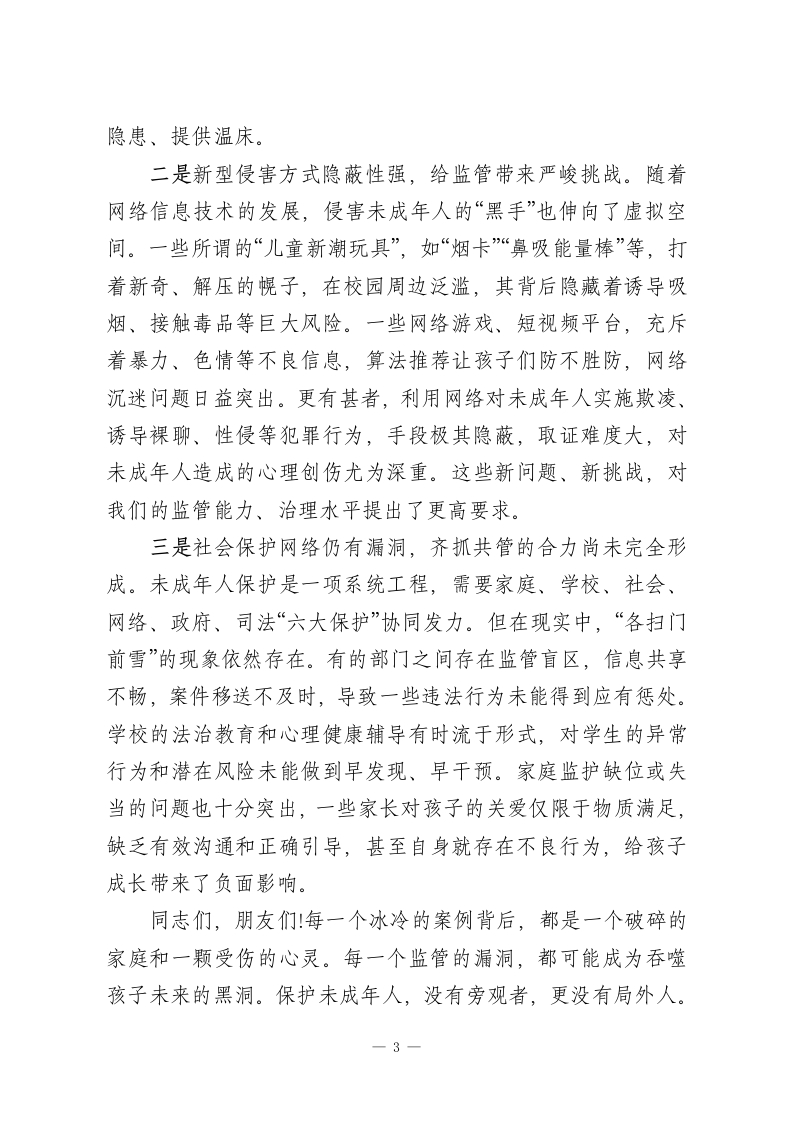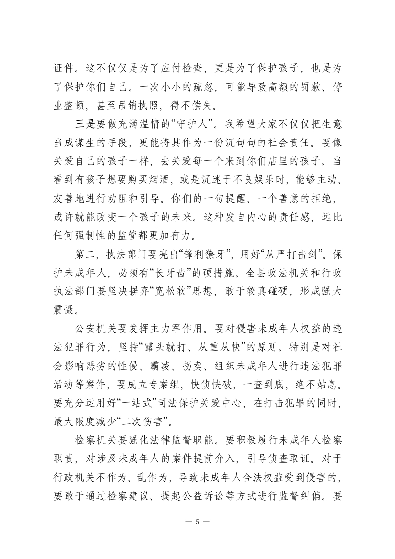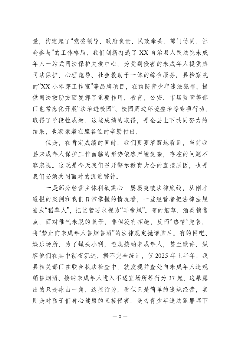 在XX自治县未成年人保护警示教育大会上的讲话同志们,各位经营者朋友们:今天,我们在这里召开全县未成年人保护警示教育大会,主要任务是深入学习贯彻《中华人民共和国未成年人保护法》等法律法规,分析当前我县未成年人保护工作面临的严峻形势,以案明纪、以案示警,教育和引导全县相关市场经营主体深刻认识保护未成年人的极端重要性,进一步统一思想、压实责任、凝聚合力,为孩子们的健康成长撑起一片法治的蓝天。刚才,县烟草专卖局、县公安局、县市场监管局的同志结合职能,通报了典型案例,县检察院的同志进行了解读,县教育局发出了倡议,几位同志的发言都很有针对性,也很有警示意义,希望大家认真领会,抓好落实。下面,我讲三点意见。一、认清形势,正视问题,深刻感悟未成年人保护工作的极端重要性未成年人是国家的未来、民族的希望。做好未成年人保护工作,关系到千家万户的幸福安宁,关系到社会的和谐稳定,更关系到我们事业的薪火相传和长远发展。这既是一项重大的民生工程,也是一项根本的战略任务。近年来,县委、县政府始终将未成年人保护工作摆在突出位置,以前所未有的决心和力度加以推进。我们欣喜地看到,全社会关心关爱未成年人的氛围日益浓厚,工作体系不断健全。我们成立了XX自治县未成年人保护委员会,统筹协调各方力1
