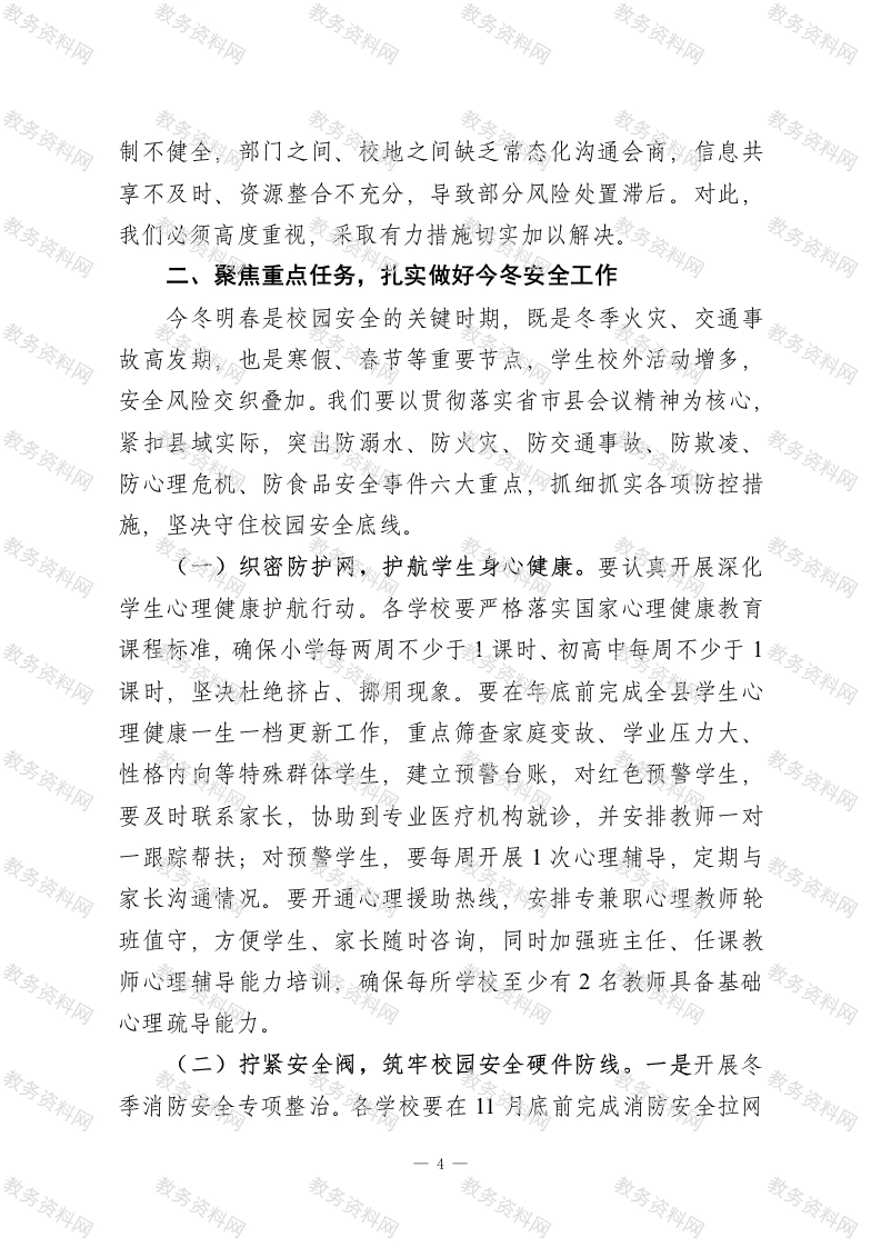 在教育系统2025今冬明春安全工作会议上的讲话同志们:今天我们召开全县教育系统安全工作会议,主要任务是深入学习贯彻习近平总书记关于安全稳定工作的重要指示批示精神,全面落实省市今冬明春安全会议部署,回顾总结今年以来全县教育系统安全工作,分析当前面临的风险挑战,对今冬明春校园安全重点任务进行全面安排。刚才,*同志通报了今年以来全县涉教安全事件、隐患排查整治等情况,*初中、*中心小学作了交流发言,既有经验做法,也有问题反思,希望大家认真学习借鉴。下面,我讲几点意见。一、保持清醒头脑,系统总结今年安全工作今年以来,在县委、县政府的坚强领导下,在县政法、公安、网信、卫健、市场监管等部门的大力支持下,全县教育系统上下围绕“保安全、护稳定、促发展”核心目标,扎实推进安全宣传教育、隐患排查整治、风险防控化解等工作,总体实现无重大安全责任事故、无大规模涉教舆情、无群体性安全事件的目标,教育安全稳定形势持续向好。但从日常检查、上级督导反馈和实际督导情况来看,我们的工作与中央、省市县委的要求相比,与人民群众对平安校园的期盼相比,仍存在不少短板和漏洞,必须清醒认识、深刻反思。一是学生防控仍有薄弱环节。一方面是溺水事故屡禁不止,一1-