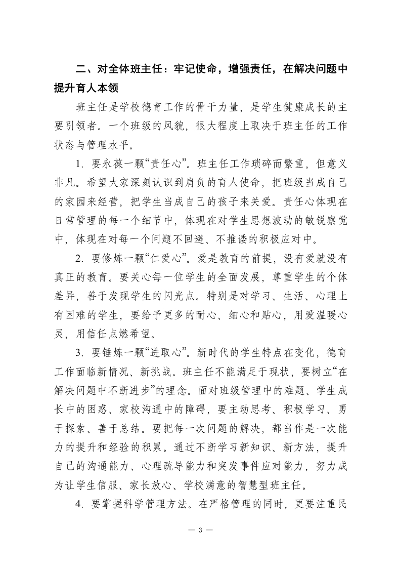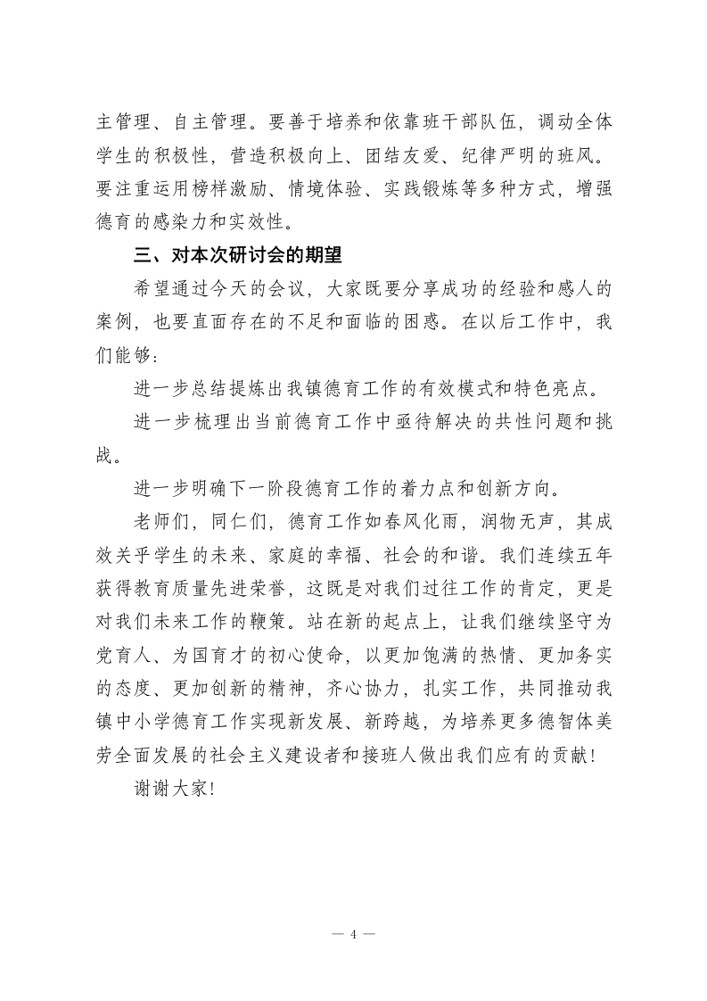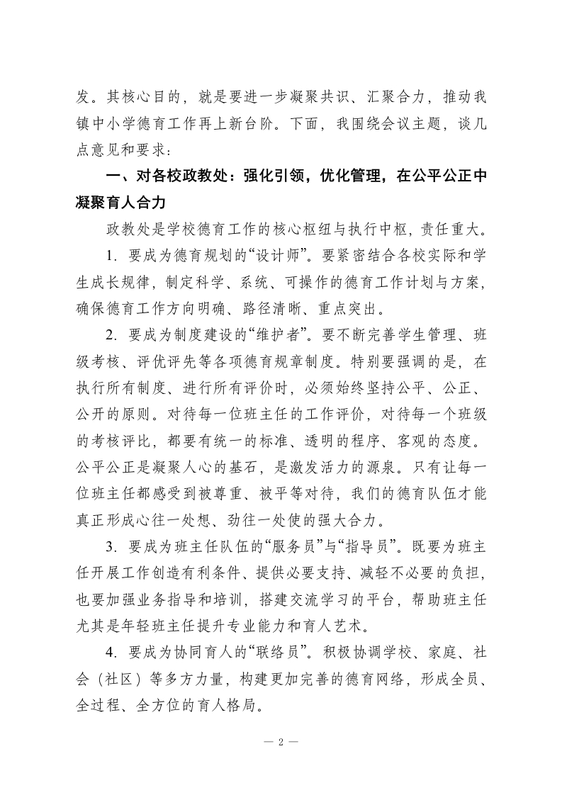 在全镇中小学德育工作会上的讲话:用心用情培根铸魂,奋力书写德育工作新篇章尊敬的各位同仁,老师们:大家下午好!今天我们齐聚一堂,召开全镇中小学德育工作会议,意义重大。首先,我谨代表学校党总支、校委会,向辛勤耕耘在德育工作一线的全体政教干部、班主任老师以及所有为孩子们健康成长倾注心血的教职员工,表示最衷心的感谢和最崇高的敬意!回首过去一学年,在全体师生的共同努力下,我镇教育事业再谱新篇。我们连续五年荣获“全县小学教育质量先进单位”和“初中教育质量先进单位”的殊荣。这沉甸甸的荣誉,是教学与德育双轮驱动、相辅相成结出的硕果。它不仅代表着我们教学水平的稳步提升,更蕴含着我们在立德树人根本任务上所付出的不懈努力与取得的扎实成效。过去一年,我们的德育工作紧紧围绕“培养什么人、怎样培养人、为谁培养人”这一根本问题,开展了一系列富有成效的主题教育活动、行为习惯养成教育和校园文化建设。学生的思想品德、精神面貌和综合素养得到了积极正向的发展,校园整体氛围和谐向上。这些来之不易的德育成果,是我们最宝贵的财富,也是我们继续前行的坚实基础。今天,我们召开这个德育工作会,既是一次成果的展示与分享,更是一次经验的总结与升华,一次责任的再明确与再出1