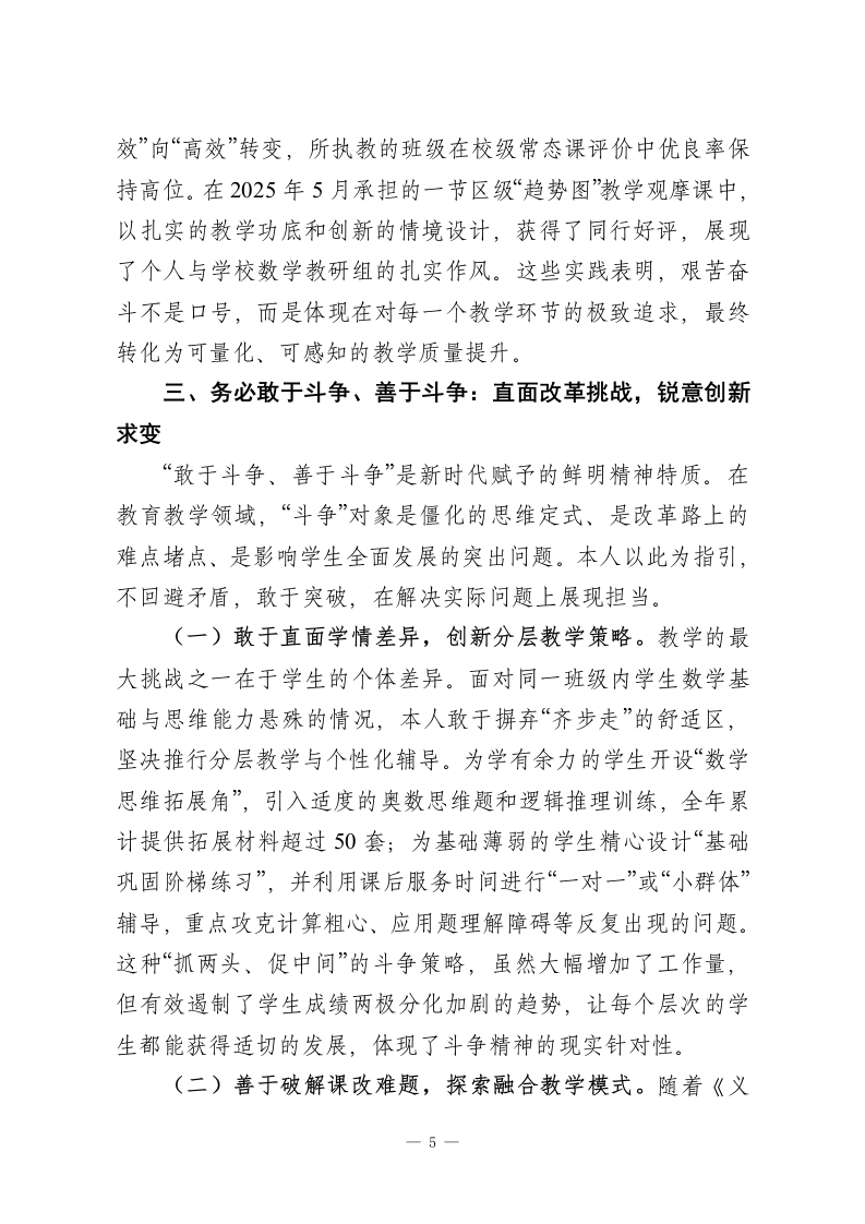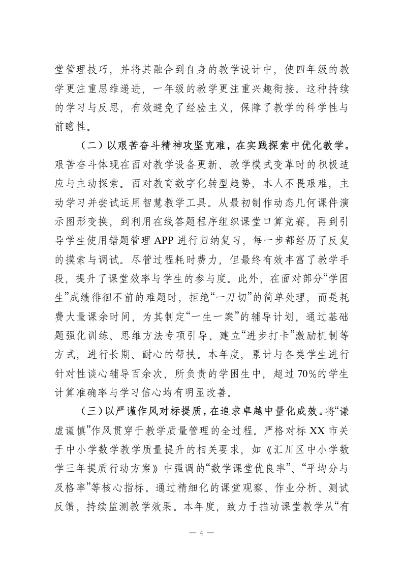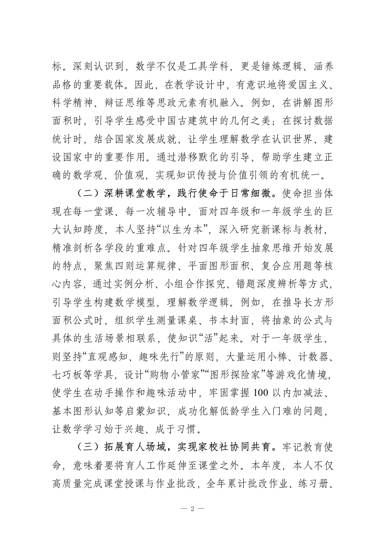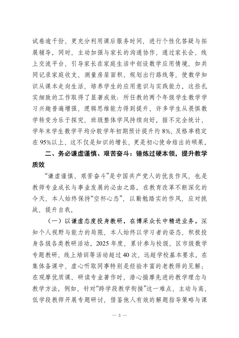 中学数学教师2025年度实绩报告2025年,是全面贯彻落实党的二十大精神、深入实施“十四五”规划的关键之年。在新时代教育强国建设的宏伟征程中,作为XX市第十九中学的一线数学教师,本人始终以高度的政治自觉和行动自觉,深刻领会并自觉践行“三个务必”的时代要求,将其精神内核融入教育教学全过程,转化为立德树人、教书育人的具体实践。本年度,本人主要承担四年级与一年级两个学段的数学教学任务,面对不同学段学生的认知差异与教学挑战,始终坚守教育报国初心,勇担铸魂育人使命,以谦虚谨慎、艰苦奋斗的作风深耕课堂,以敢于斗争、善于斗争的勇气破解难题,力求在平凡的岗位上创造不平凡的业绩。现将全年实绩报告如下。一、必不忘初心、牢记使命:恪守育人本职,筑牢数学之基“不忘初心、牢记使命”是激励中国共产党人不断前进的根本动力,对于人民教师而言,初心就是教育报国,使命就是立德树人。本年度,本人将这一根本要求内化于心、外化于行,聚焦数学学科本质,致力于培养有理想、有本领、有担当的时代新人。(一)坚守育人初心,锚定数学教学根本方向。教育的初心在于促进人的全面发展。在数学教学中,本人始终牢记“为党育人、为国育才”的崇高使命,摒弃单纯知识灌输的旧有模式,将“夯实数理基础、培育数学思维、激发科学兴趣”作为核心目-1-