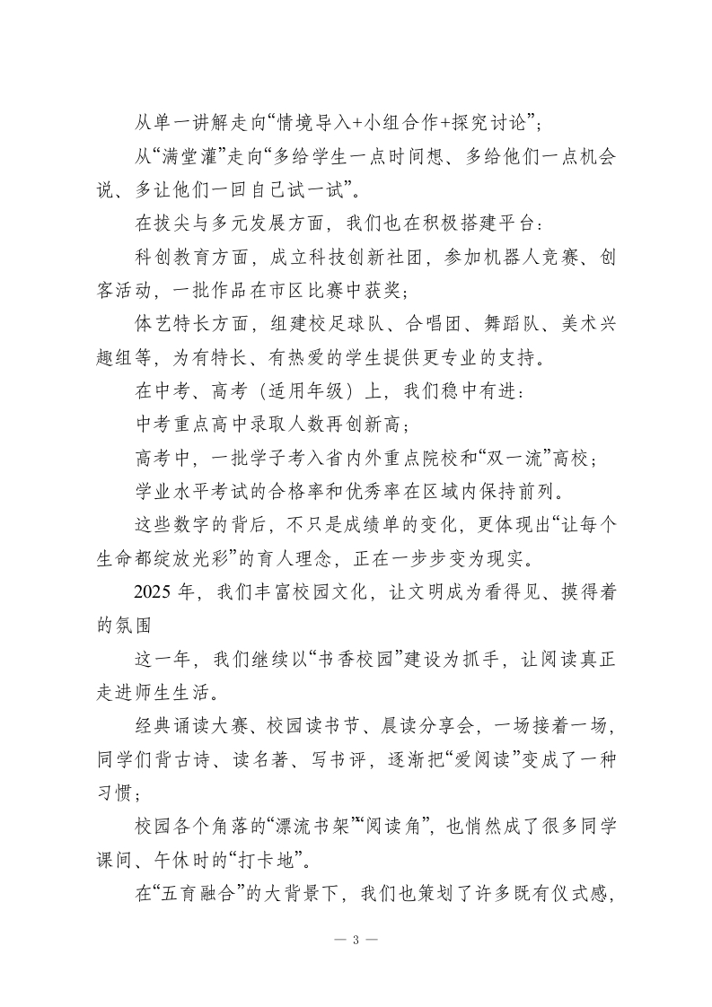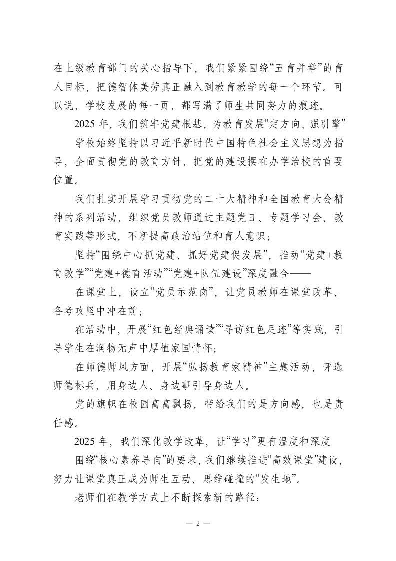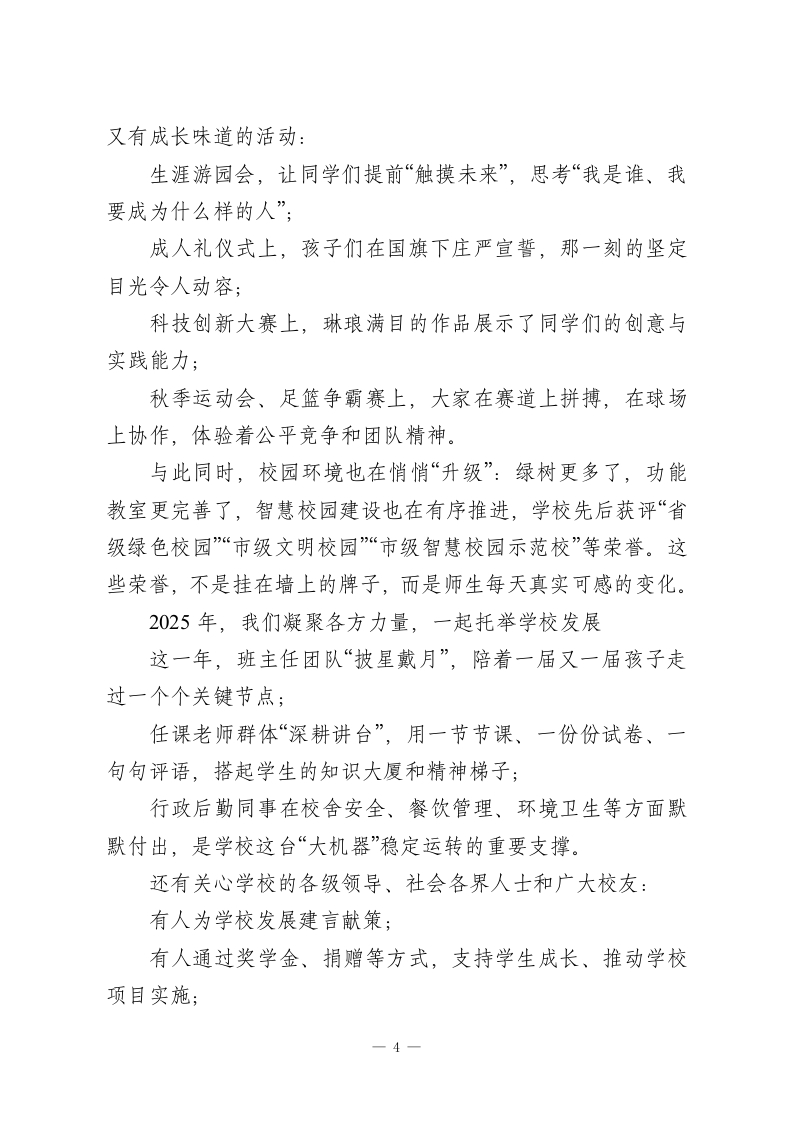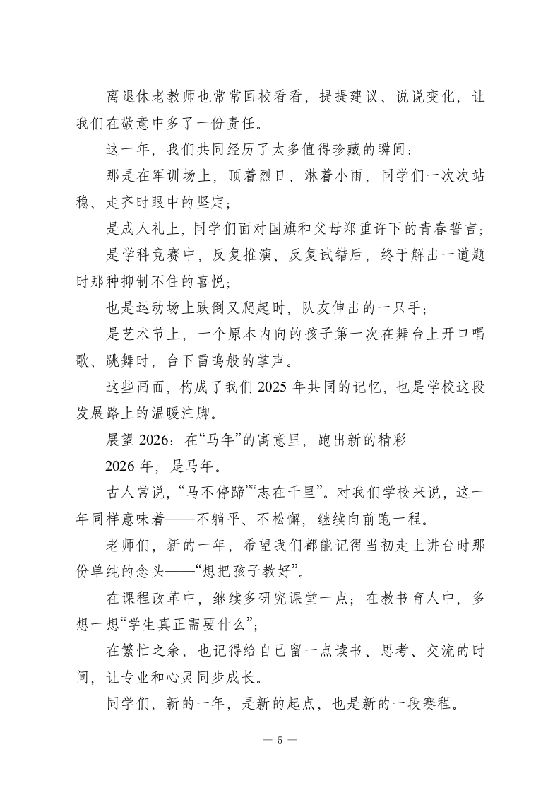 走心!2026年元旦晚会校长致辞尊敬的各位老师、亲爱的同学们、各位家长朋友们,亲爱的校友们、离退休老同志们:大家晚上好!在这样一个灯光温暖、寒意渐退的冬夜,我们相聚在熟悉的校园,共同迎接2026年的到来。操场上彩灯闪烁,礼堂里笑声洋溢,空气中既有告别一年的不舍,也有对新一年的期待。此时此刻,能和大家坐在这里,一起看节目、迎新年,我心里是很踏实、也很感动的。在这里,我谨代表学校,向一年来辛勤耕耘在各个岗位上的全体教职工,致以最崇高的敬意和由衷的感谢;向勤学善思、不断成长的同学们,送上最诚挚的祝福;也向一直以来信任学校、支持学校发展的各位家长朋友,以及长期关心母校发展的各级领导、社会各界人士、广大校友和离退休老同志,表示最真诚的感谢和最美好的新年问候:祝大家元旦快乐、身体健康、阖家幸福、万事顺遂!回望2025:在平凡之中,写下不平凡的一年岁月如歌,记录着我们每一步的脚印;时光如炬,照亮着我们前行的方向。回首2025年,对国家而言,是教育高质量发展持续推进的一年;对我们学校来说,则是坚守“立德树人”根本任务,深耕内涵、砥砺前行的一年。这一年,在国家“加快建设高质量教育体系”的大背景下,一1